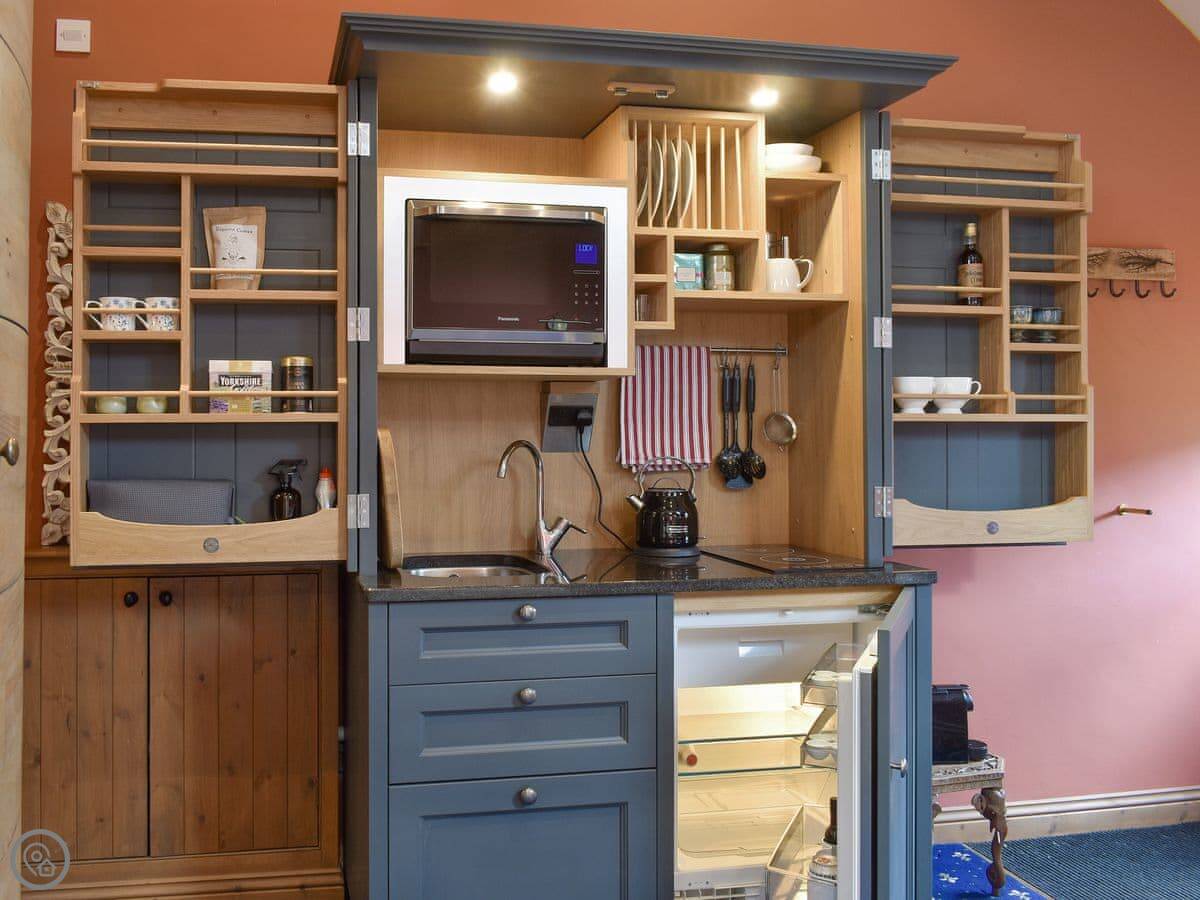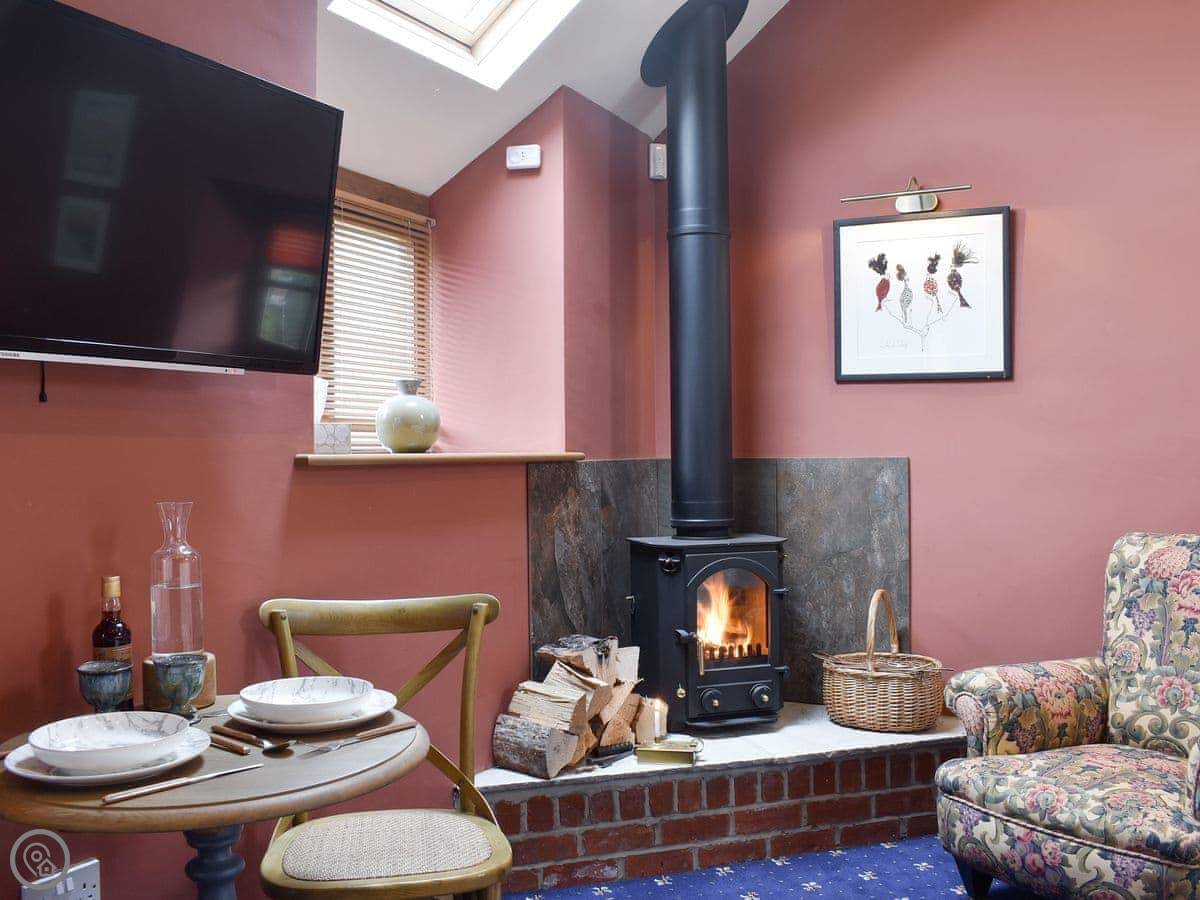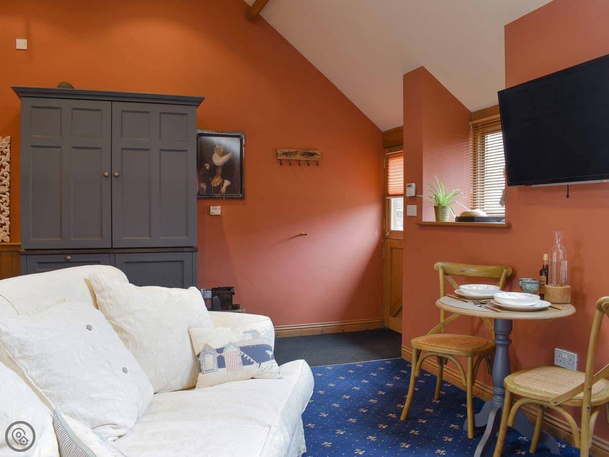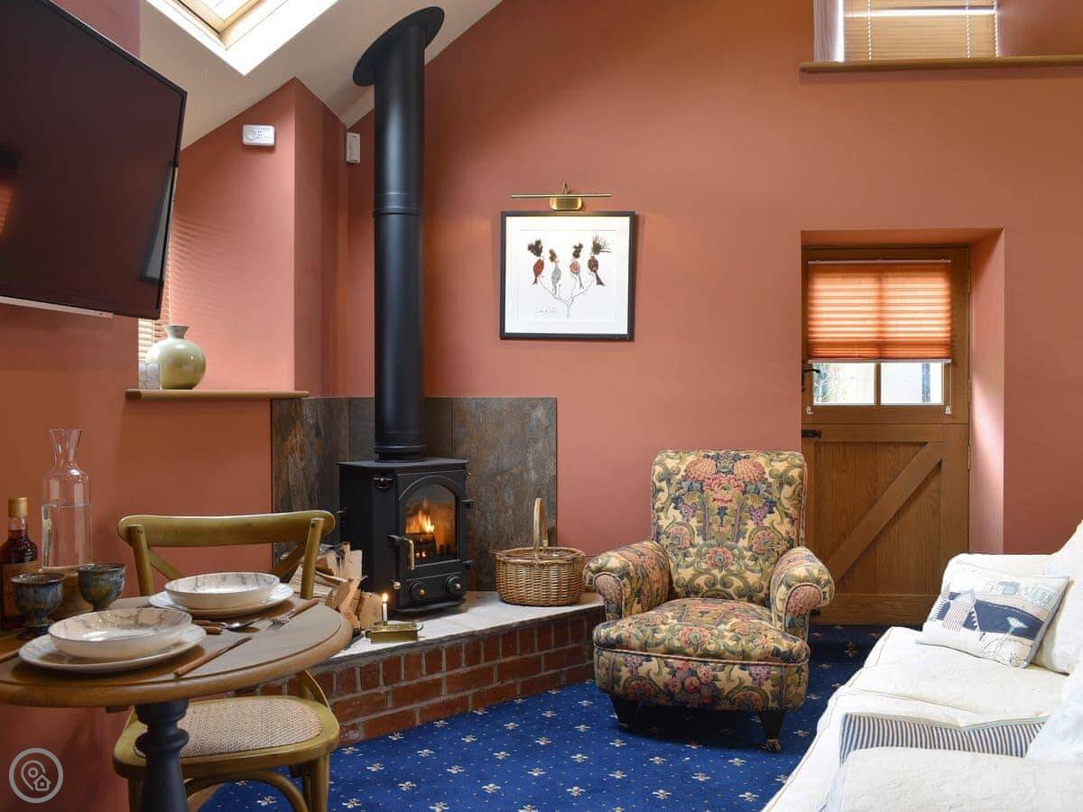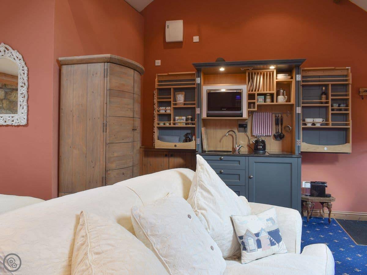 This open plan, semi-detached cottage has been lovingly refurbished, and the space has been cleverly utilised to ensure that you have a comfortable, well equipped, self-catering stay. You are sure to be snug and cosy with the wood burner, as there is nothing like relaxing on the sofa after a day of exploring while watching the flames snap and crackle. Open up the huge wardrobe behind the dining table and you will find an entire kitchenette inside! Complete with a hob, sink, kettle and microwave/oven, you can cook meals together including a hearty full English breakfast to start your day. For long summer days, you can enjoy your meals al fresco out in the garden.