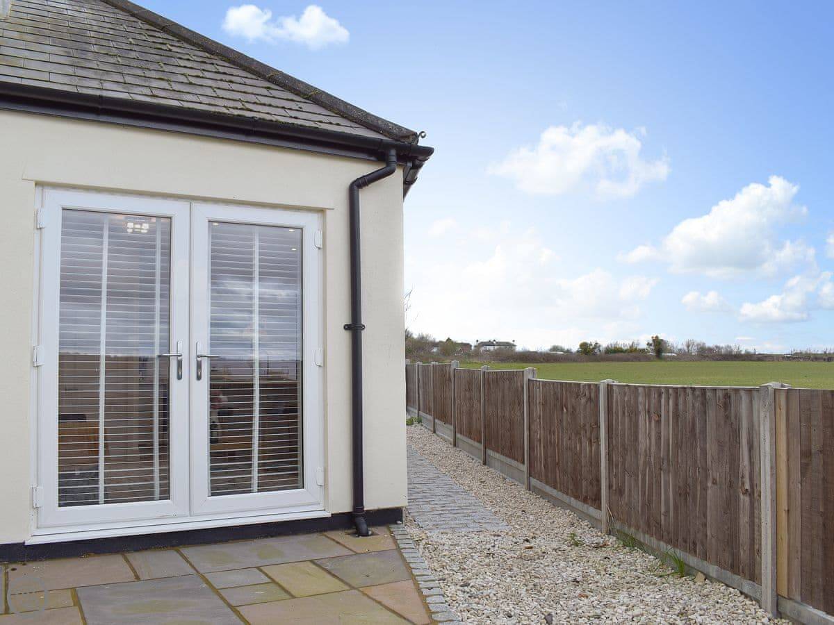 The main room is open plan, kitchen and living area together. French doors open out to a patio with a table and chairs. The view is over fields.