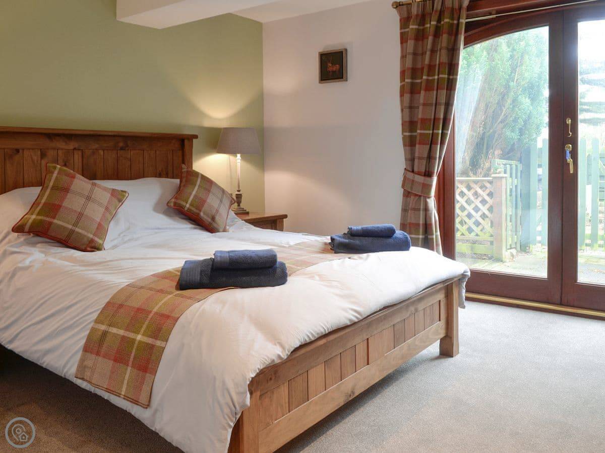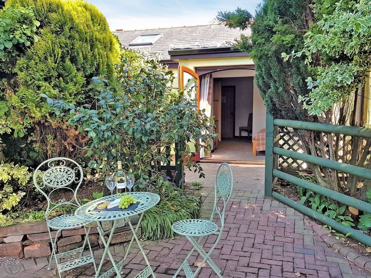 It's a single-storey place, all on the ground floor. The main room is big and open plan with windows on three sides. The patio doors open onto your own enclosed garden. The bedroom has an en-suite bathroom and its own door out to the garden too.
