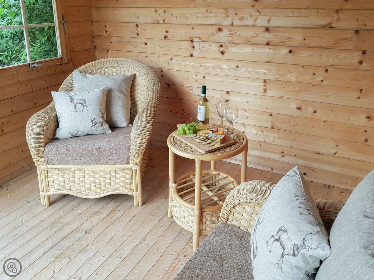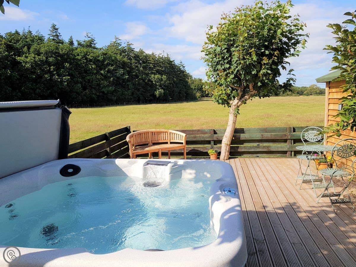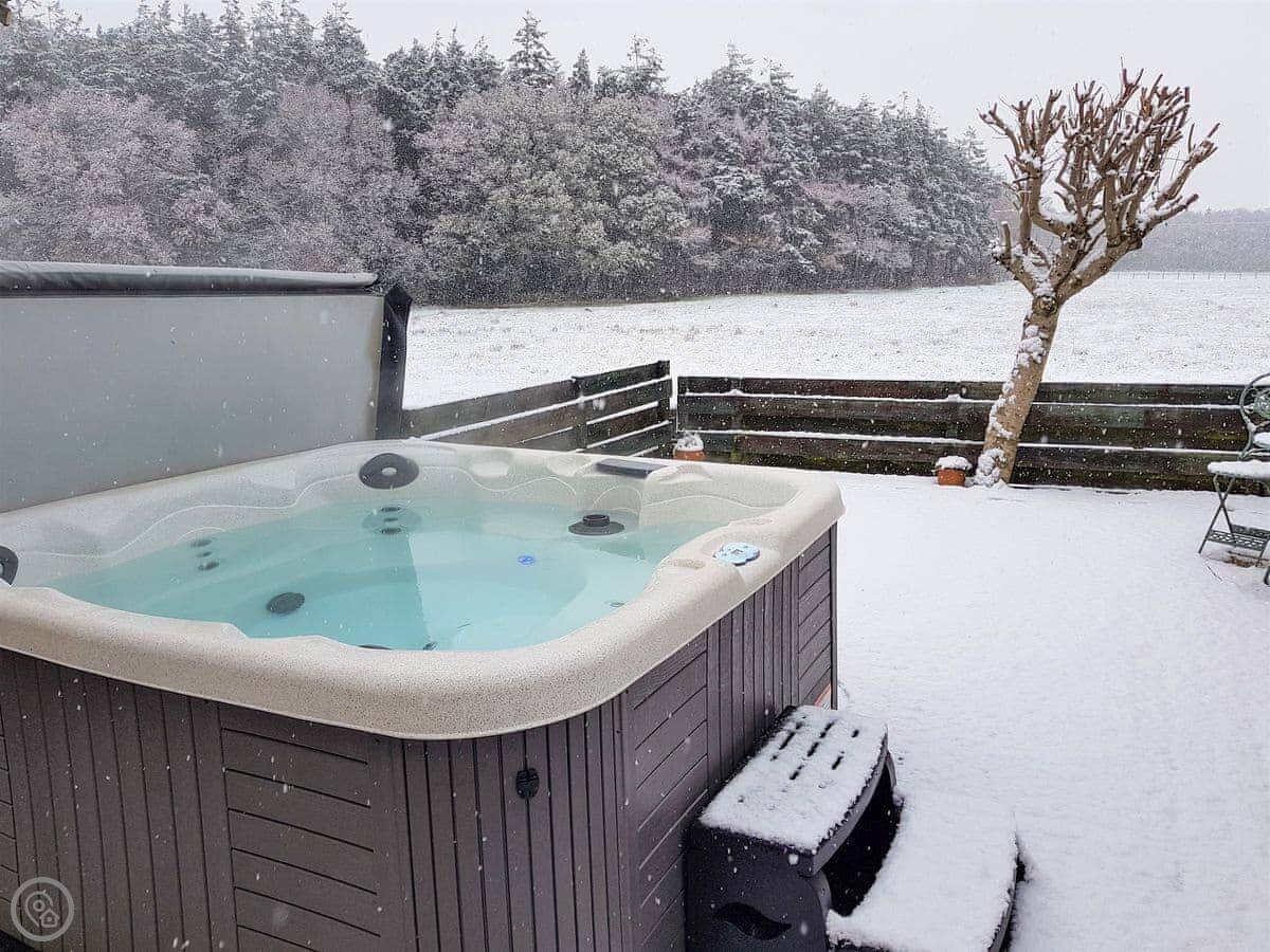 Outside, there's a decked area, a summerhouse with some furniture in it, and a hot tub inside a little cabin so you can use it out of the wind and rain. The garden looks over fields and some woodland. We regularly see red deer in the field opposite.