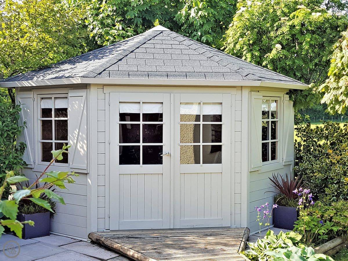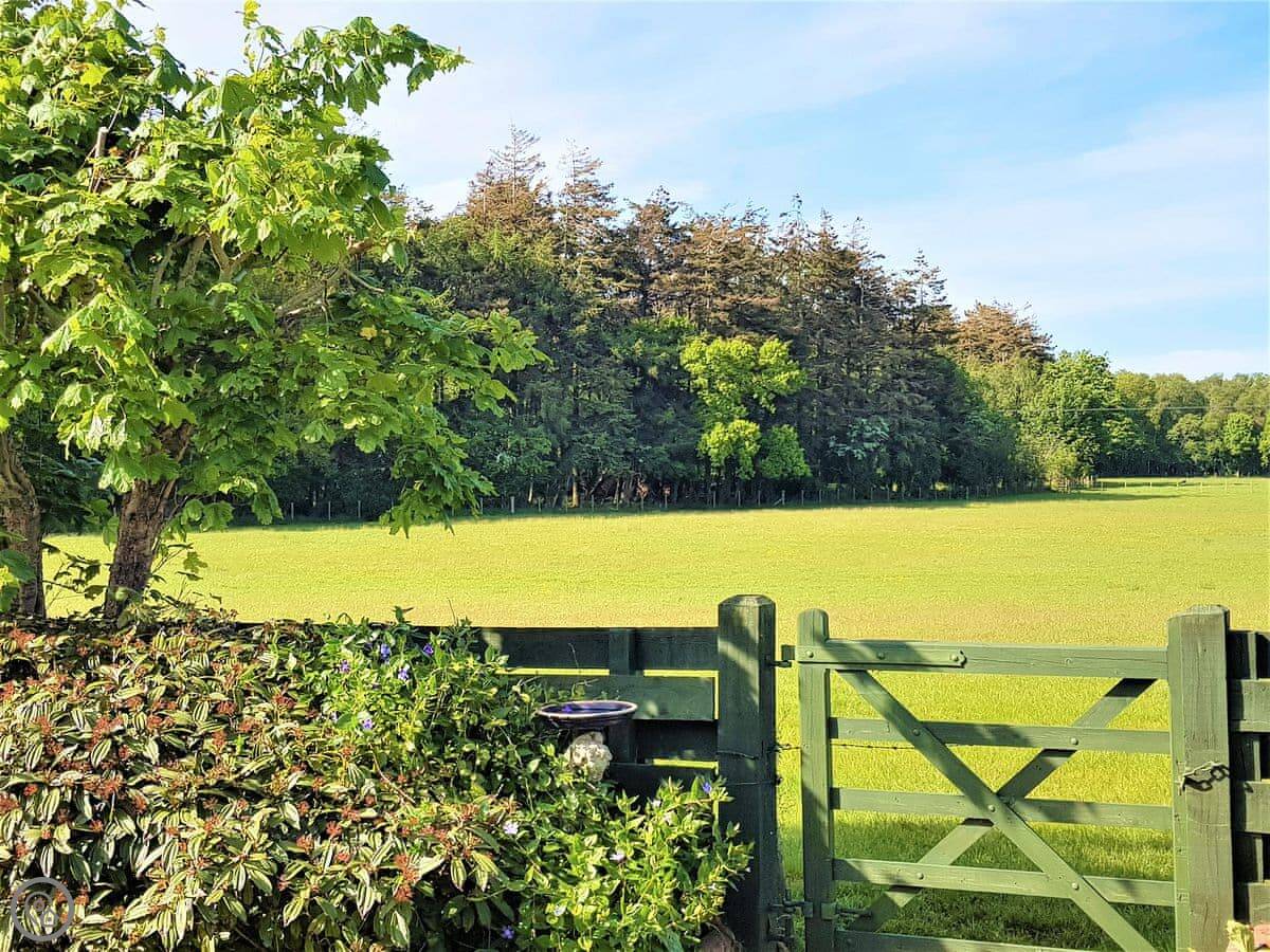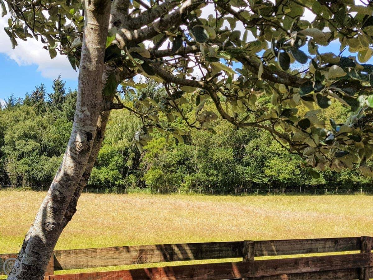 Outside, there's a decked area, a summerhouse with some furniture in it, and a hot tub inside a little cabin so you can use it out of the wind and rain. The garden looks over fields and some woodland. We regularly see red deer in the field opposite.