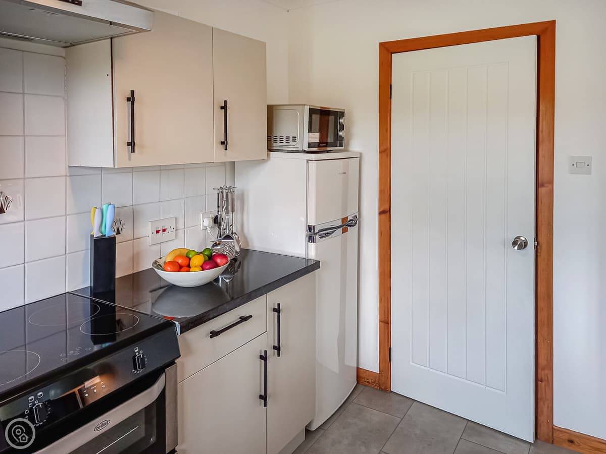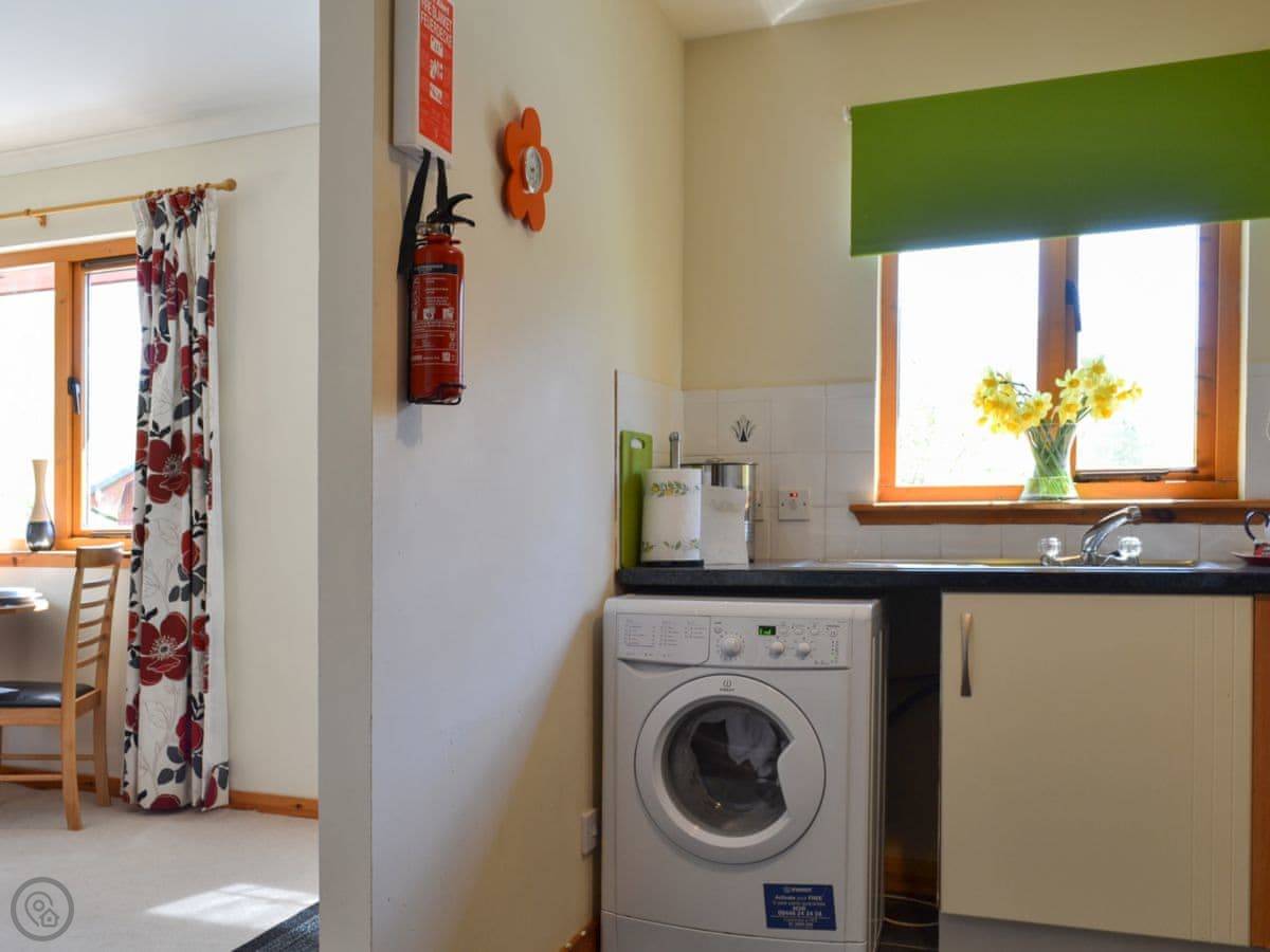 Inside, there's the one bedroom upstairs, and the bathroom's up there too. The stairs are a bit steep, just so you know. Downstairs is the sitting room with the kitchen at one end. There's a TV, wi-fi, and a washing machine. Bedding and towels are included.