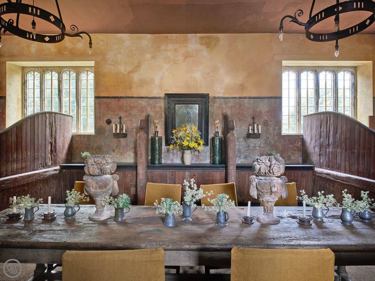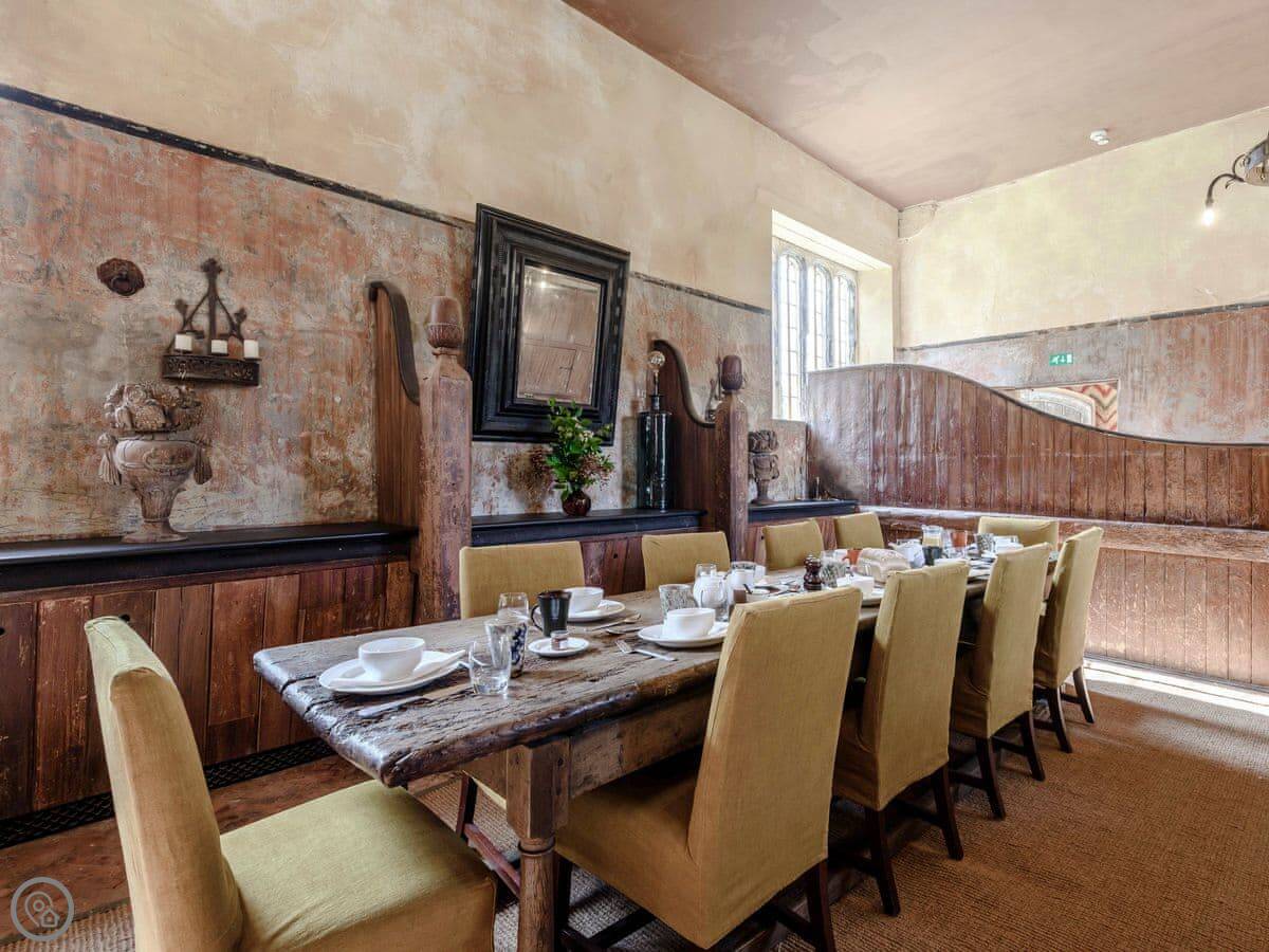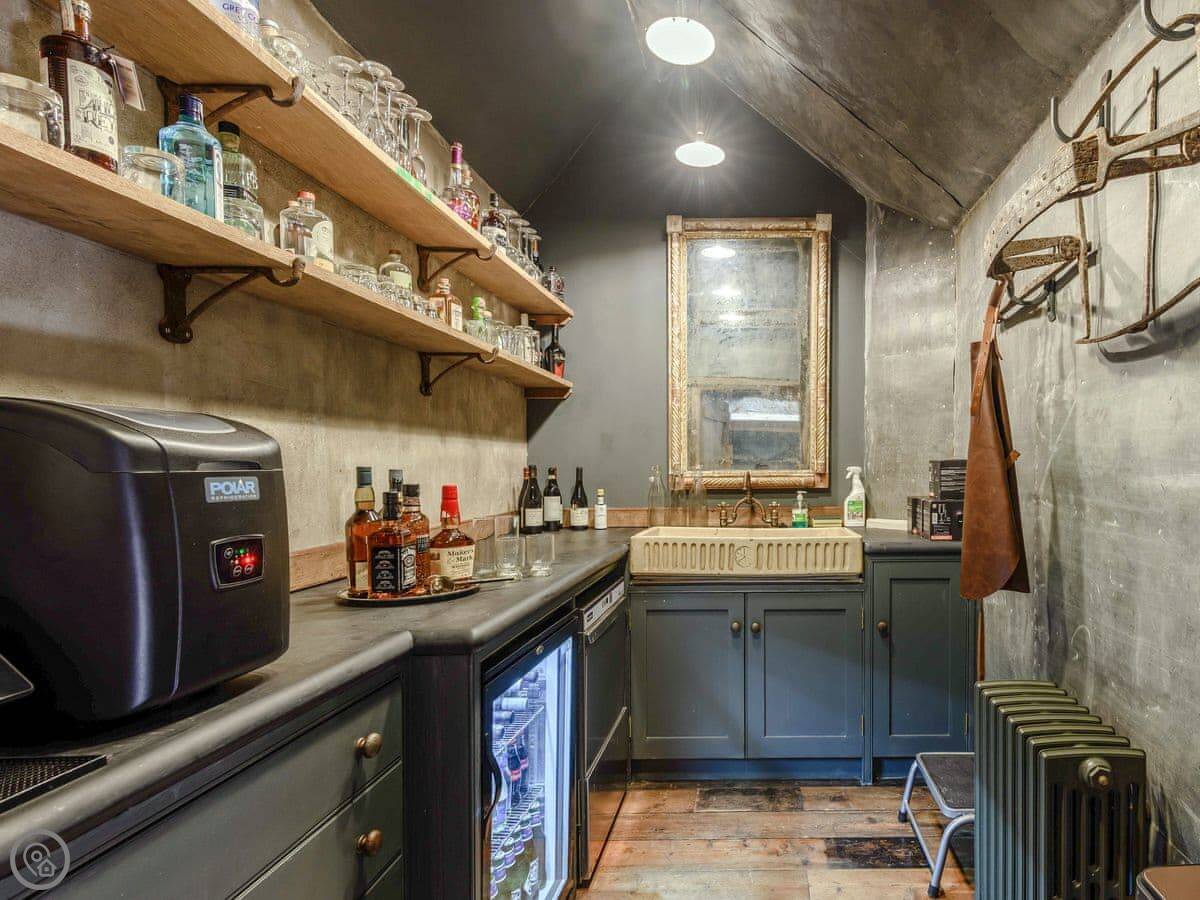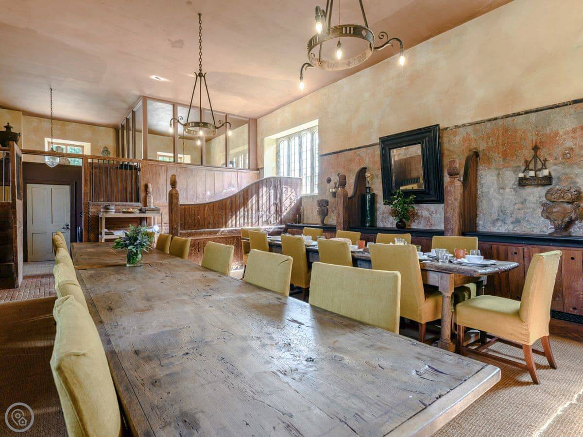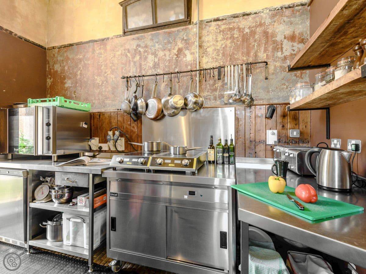 Downstairs, there's a big living room with sofas and a wood burner. There's an honesty bar with spirits and wine. The dining room has two long tables. The kitchen is large and fully equipped for cooking for a group. We can arrange a caterer if you want, you just need to ask the house manager beforehand.