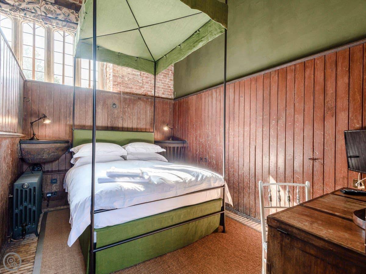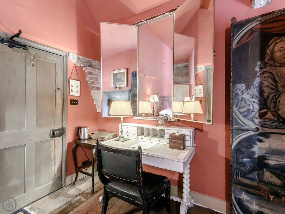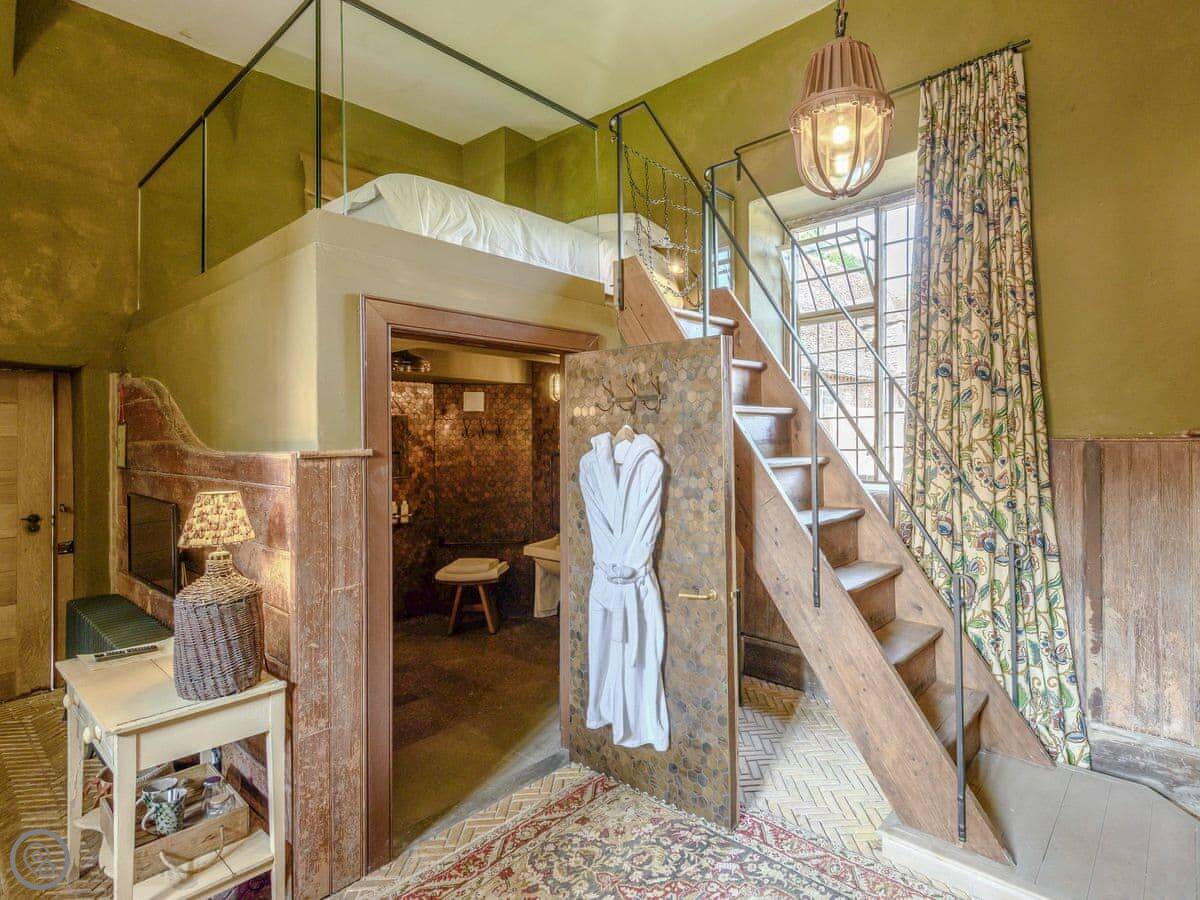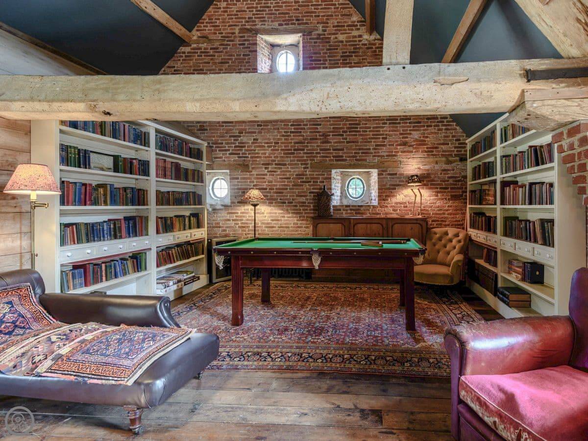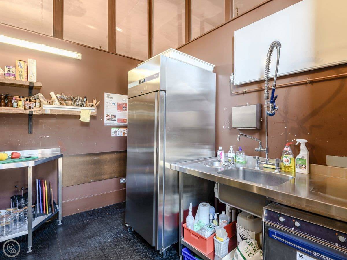 Downstairs, there's a big living room with sofas and a wood burner. There's an honesty bar with spirits and wine. The dining room has two long tables. The kitchen is large and fully equipped for cooking for a group. We can arrange a caterer if you want, you just need to ask the house manager beforehand.