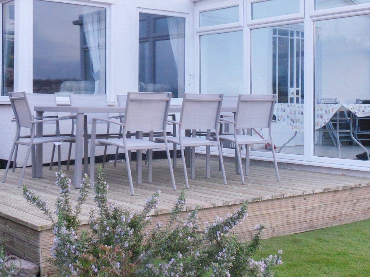 The garden has a decked area and an artificial lawn. There's also an outhouse where you can put bikes and beach gear.