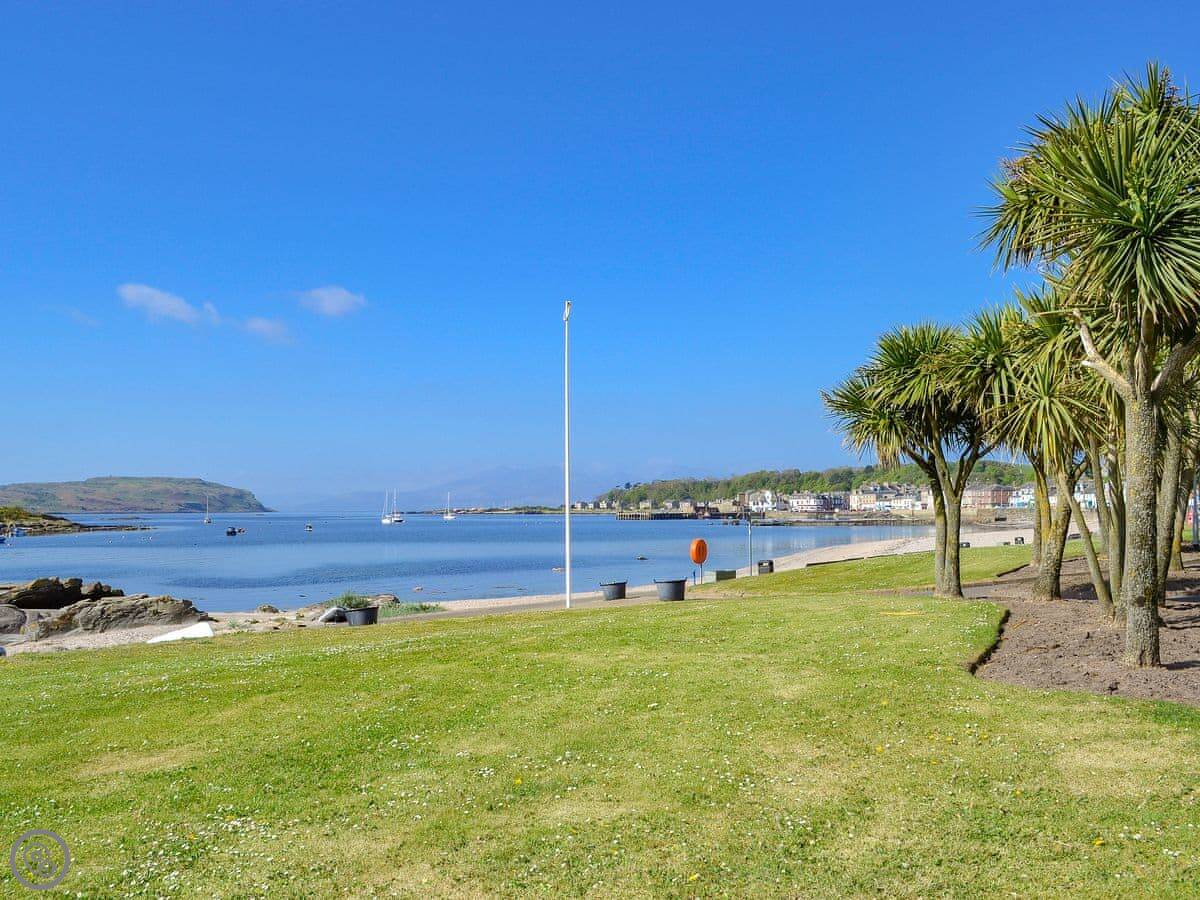The beach is sandy, with a promenade. There are tropical palms by the shore. It’s a proper seaside town. The ferry from Largs takes about ten minutes and runs all the time in summer.