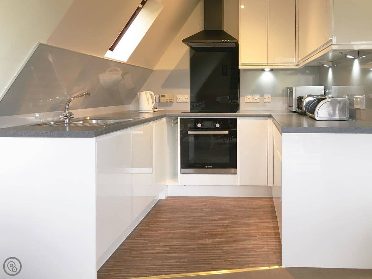 It sleeps four people. There are two bedrooms upstairs: one double and one with two single beds. They share a bathroom. It's a 4 Star place, which means it's comfortable and well looked after. Everything inside is modern and works as it should. The main room is open plan, with the kitchen at one end and the living area at the other. Big patio doors open onto the garden.