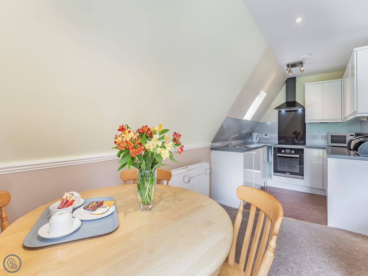 Inside, it's all open-plan. The living room, kitchen, and dining area are one big space which makes it feel roomy. There are patio doors out to your own enclosed garden. You can sit out there and look over the fields towards the sea. The stairs go up to the bedrooms. They're normal stairs, not a ladder or anything.