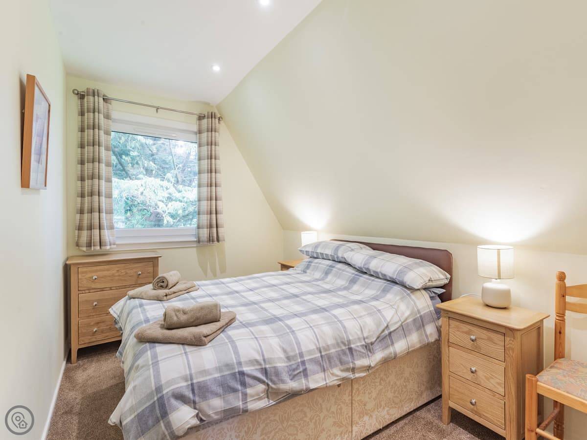 Gorse Lodge is in Rosemarkie. It's a wooden cabin-style place, detached, up a bit of a slope in the trees. It sleeps four, with two bedrooms upstairs and one bathroom. It's got a 4 Star rating, so it's comfortable and well-kept.