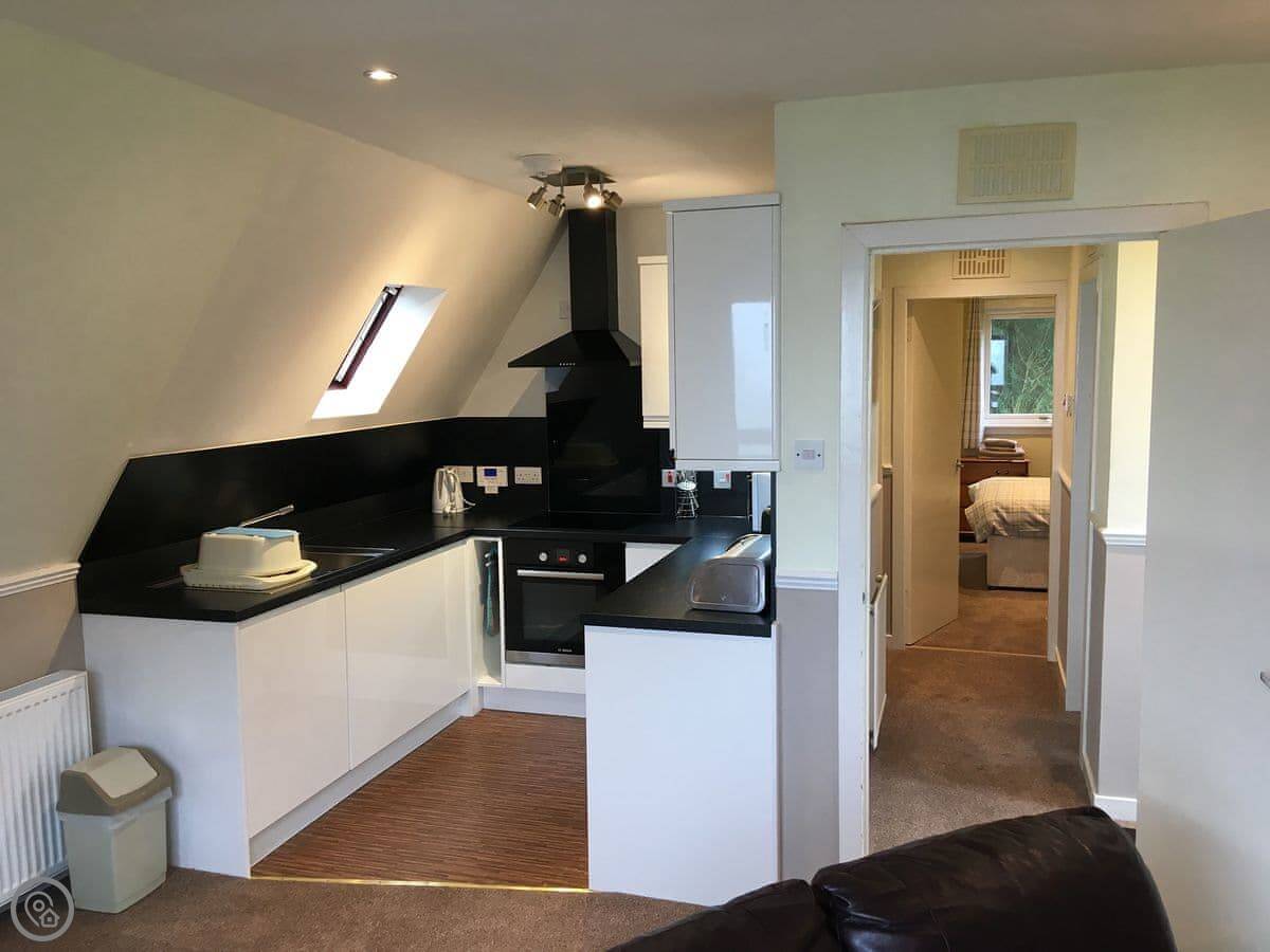 The main thing here is the view. You're set back in the woods looking out over the Moray Firth. There's a balcony where you can sit and look at the sea. The living area is all open-plan so you get the view from the kitchen and the sitting room too.