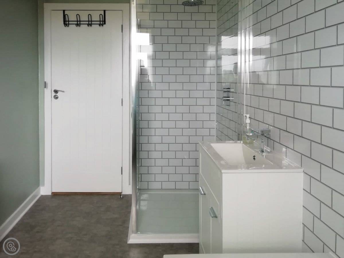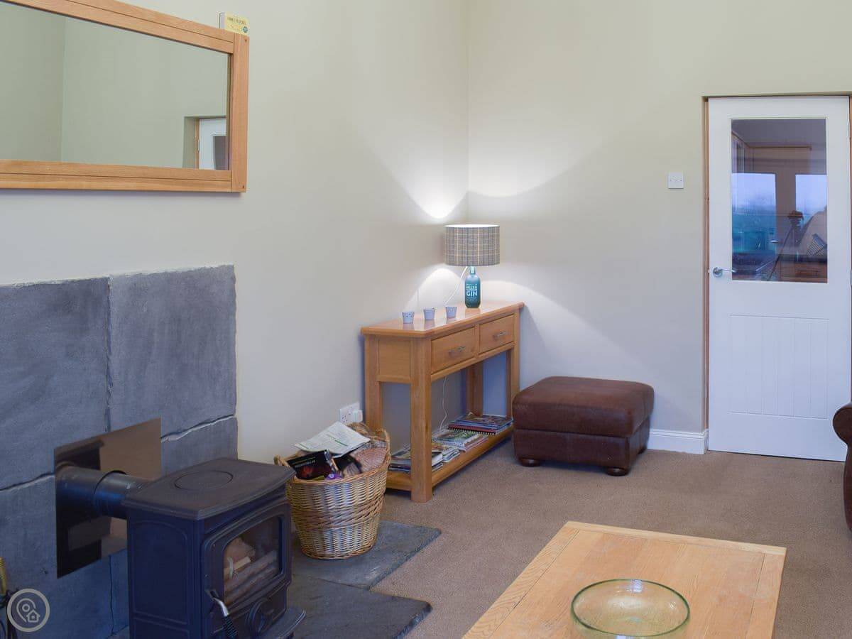 Inside, you've got a woodburning stove, which is nice on a cooler evening. There's a walk-in shower. It's all on the ground floor, so no stairs. The entrance and paths are wheelchair accessible. We've got a private parking space and an electric vehicle charger.