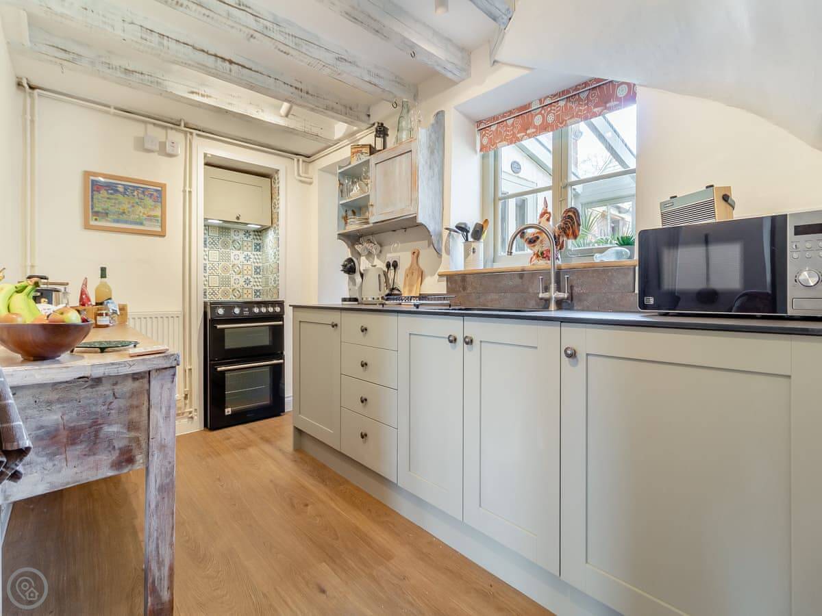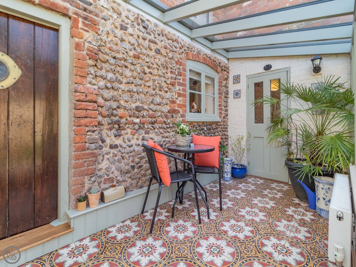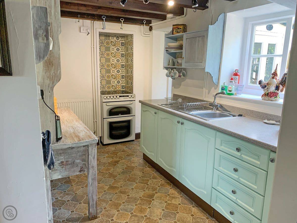You get a patio and an enclosed garden. It's private. There's a BBQ and an outdoor kitchen area. The kitchen has a washing machine. Bedding and towels are included. We can provide a cot and a highchair.