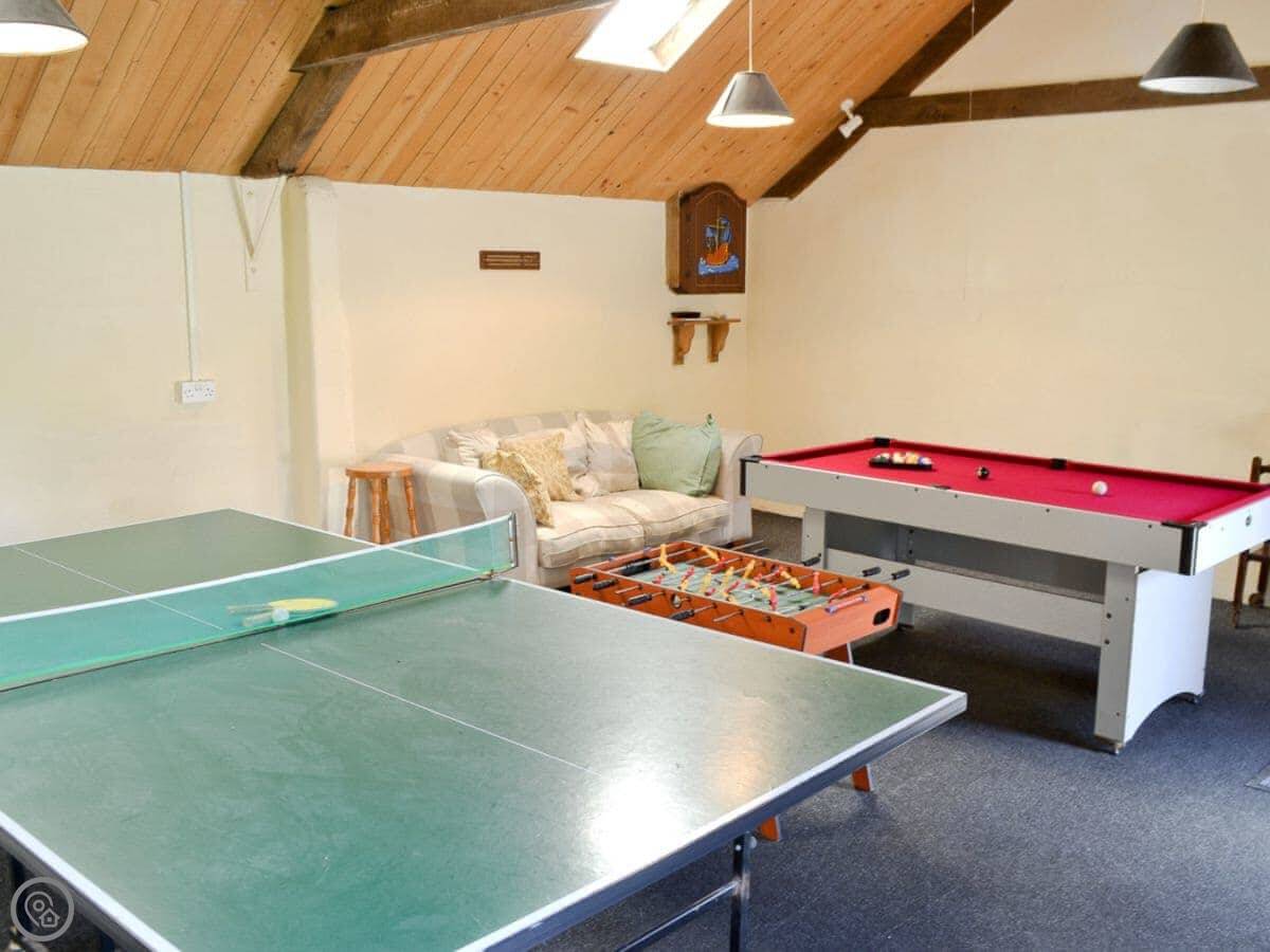 The farm has animals like goats and chickens, and they get fed daily, which kids usually like. There's a tennis court and an indoor games room on site too. If you're bringing a dog, that's fine, one is allowed.