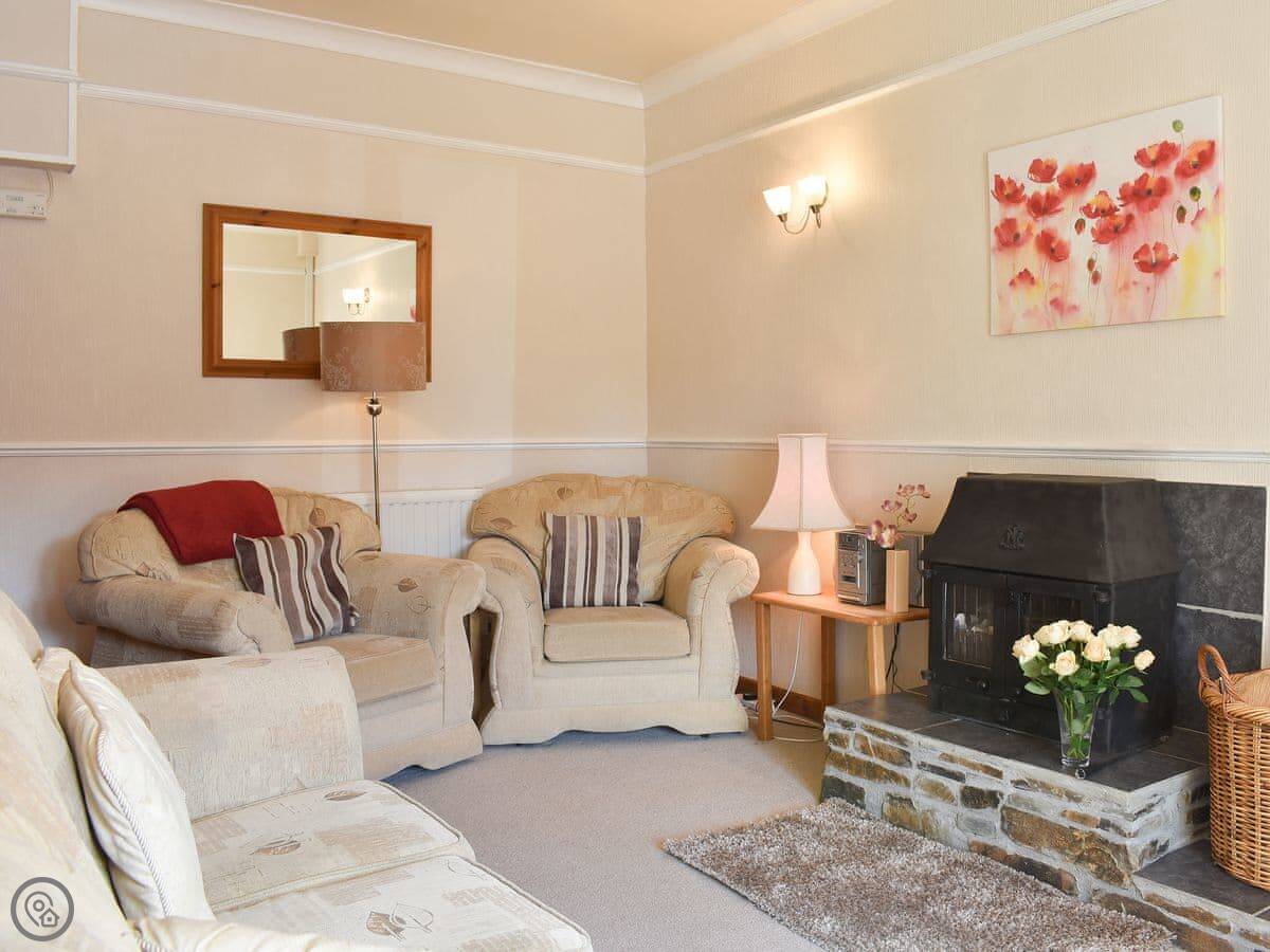 Inside, it's got a 4 Star rating. It's comfortable. There's a woodburning stove, a dishwasher, a washing machine, and WiFi. The garden is enclosed. There's off-road parking.