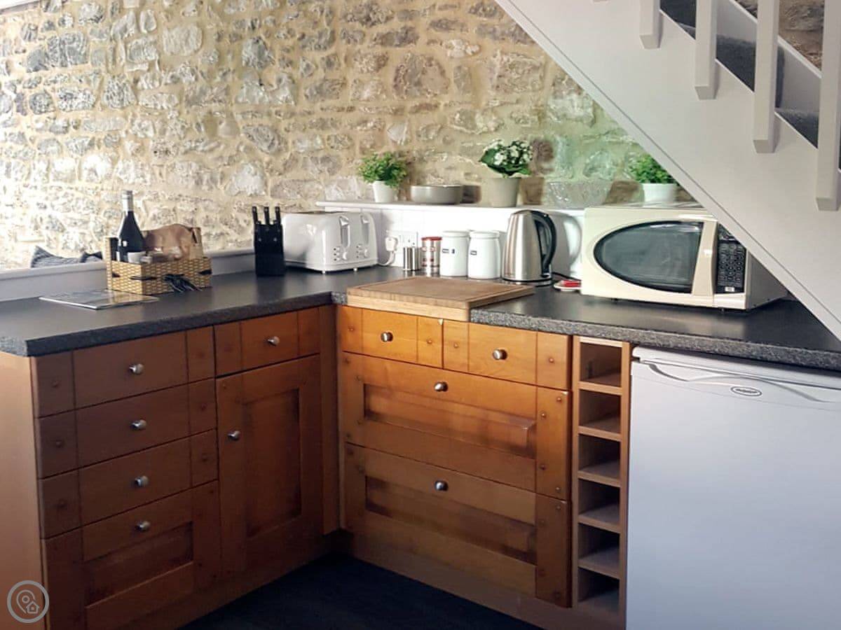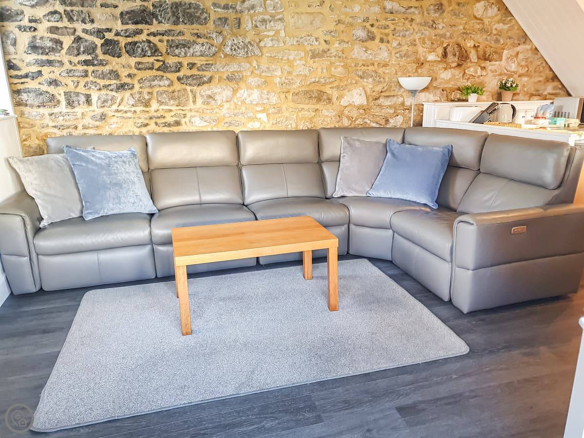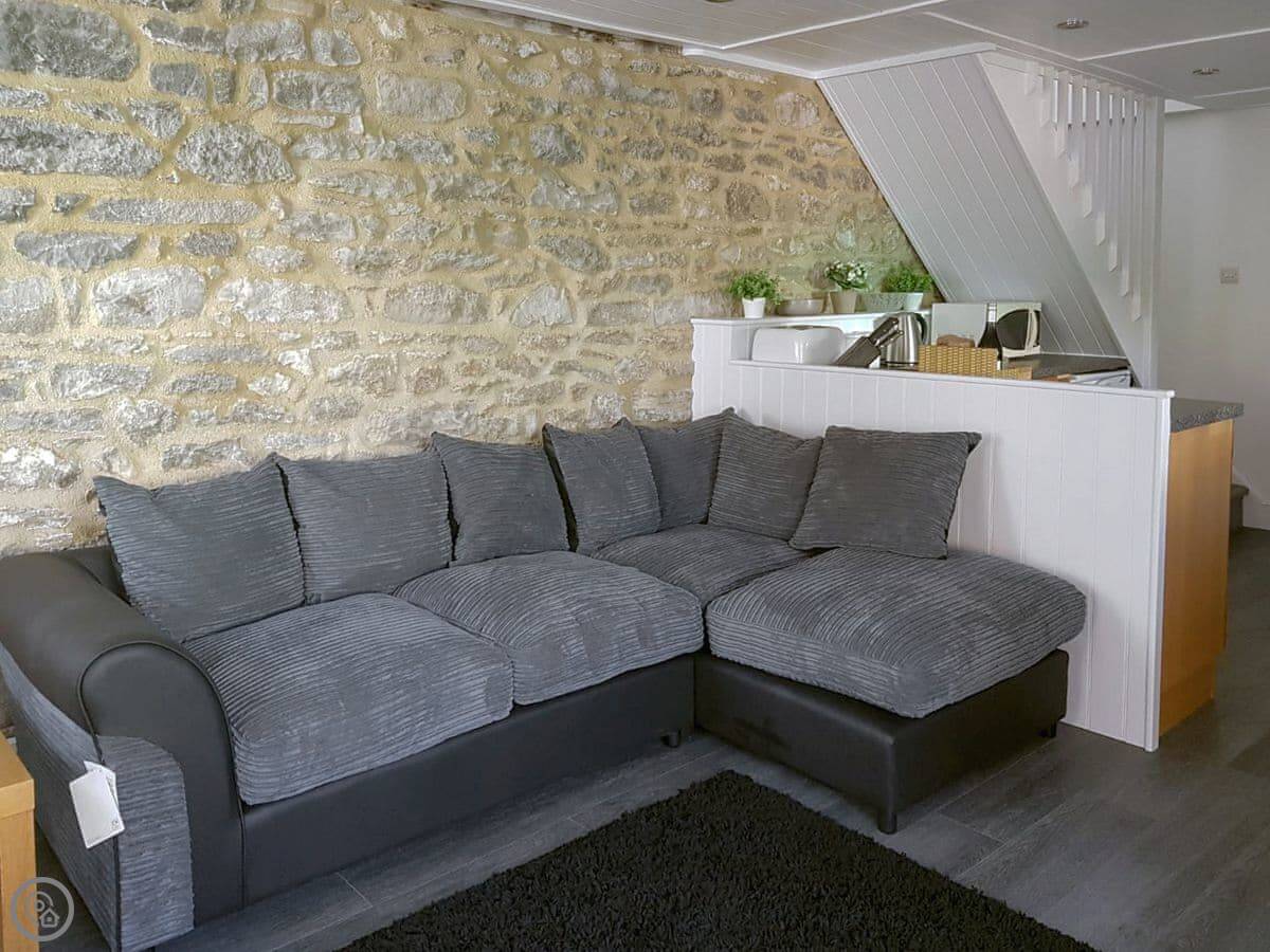 It sleeps four. Two bedrooms upstairs, one bathroom. It's got a 4 Star rating, so it's comfortable and well looked after. The ceilings upstairs are vaulted, so it feels quite roomy up there. There's a big stone wall in the living area, which is part of the original build.