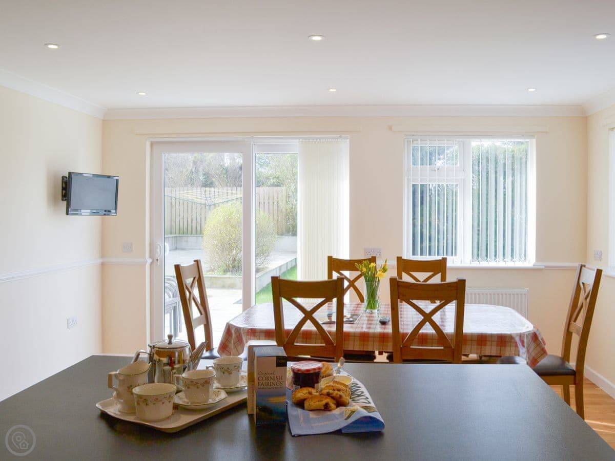 The main living room is at the front. There's a smaller snug room at the back with doors to the garden. The kitchen has a big table and an island. There are patio doors from there to the garden as well. There's a utility room with a washing machine, and from there you can get into the garage to store bikes or surfboards.