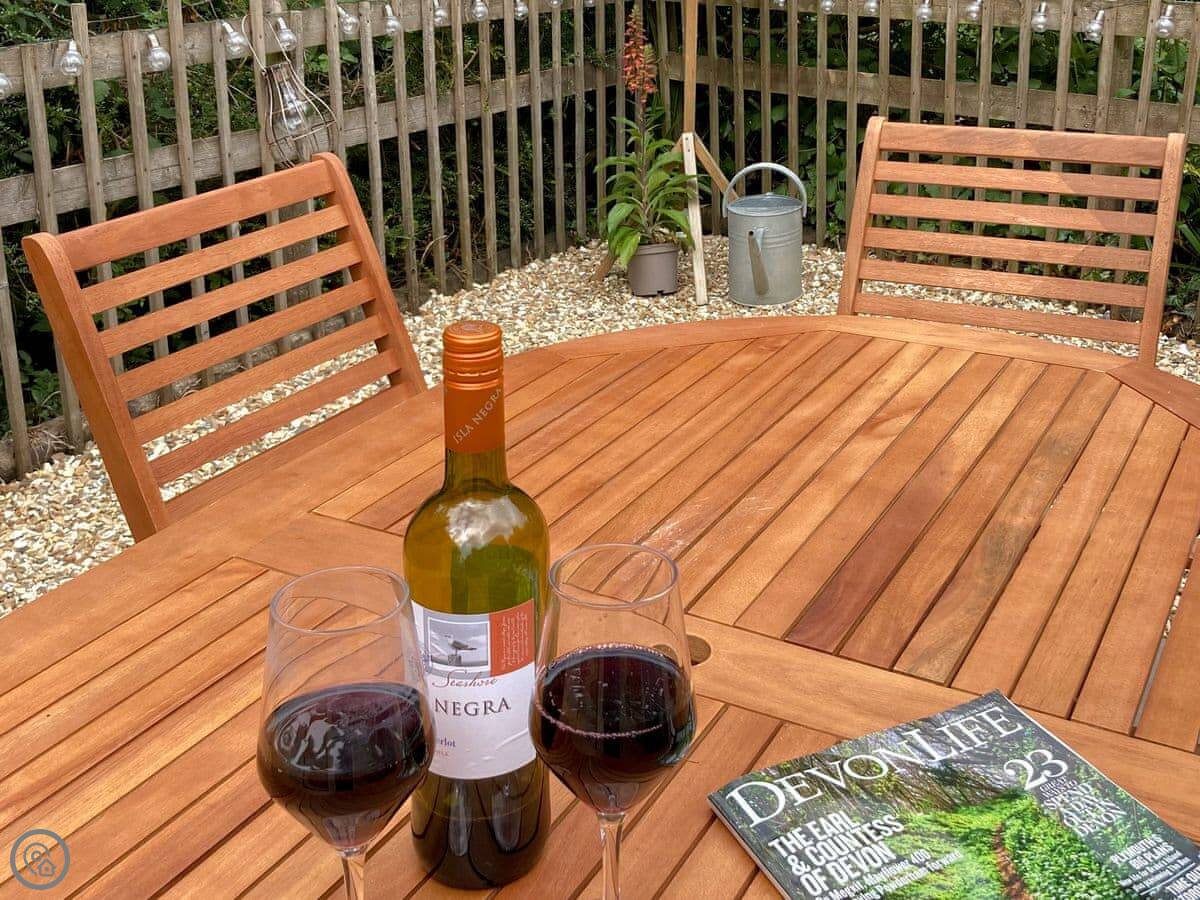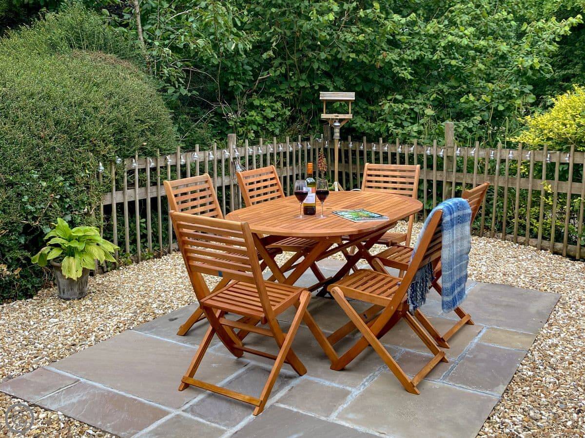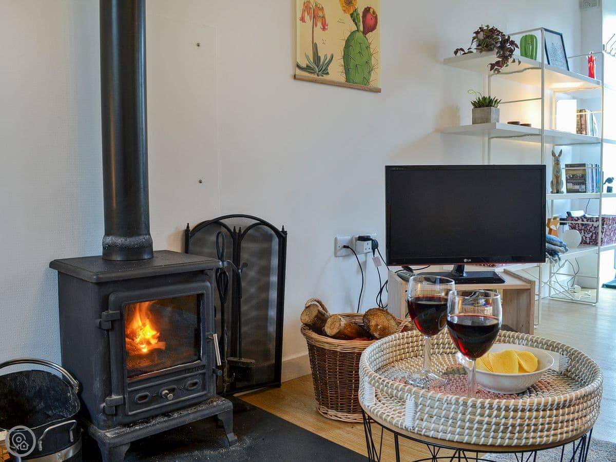 It sleeps four. Two bedrooms, one bathroom. It's a 4 Star place, which means it's comfortable and well kept. The living area is open plan, with a wood burner. The garden patio is enclosed, which is good if you have dogs.