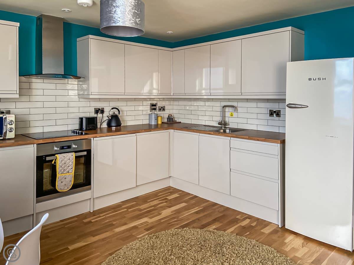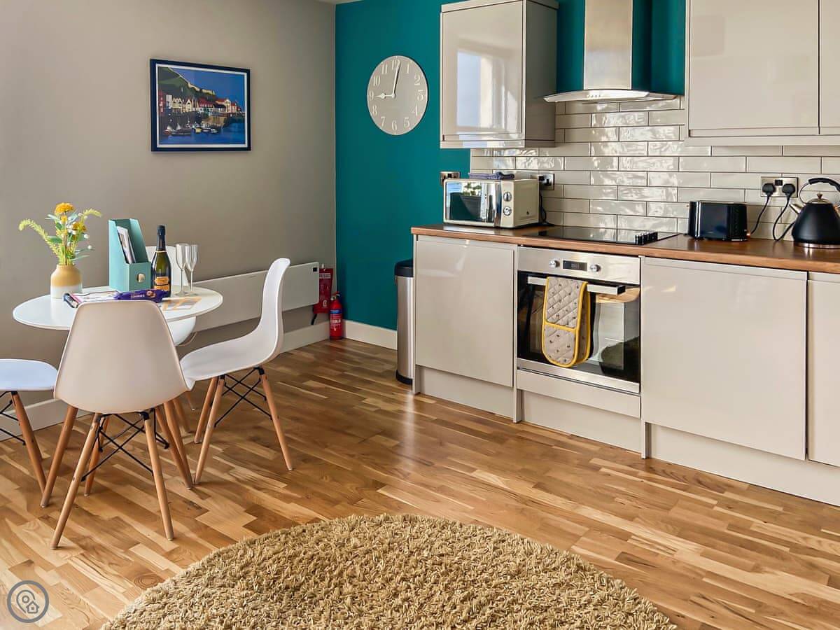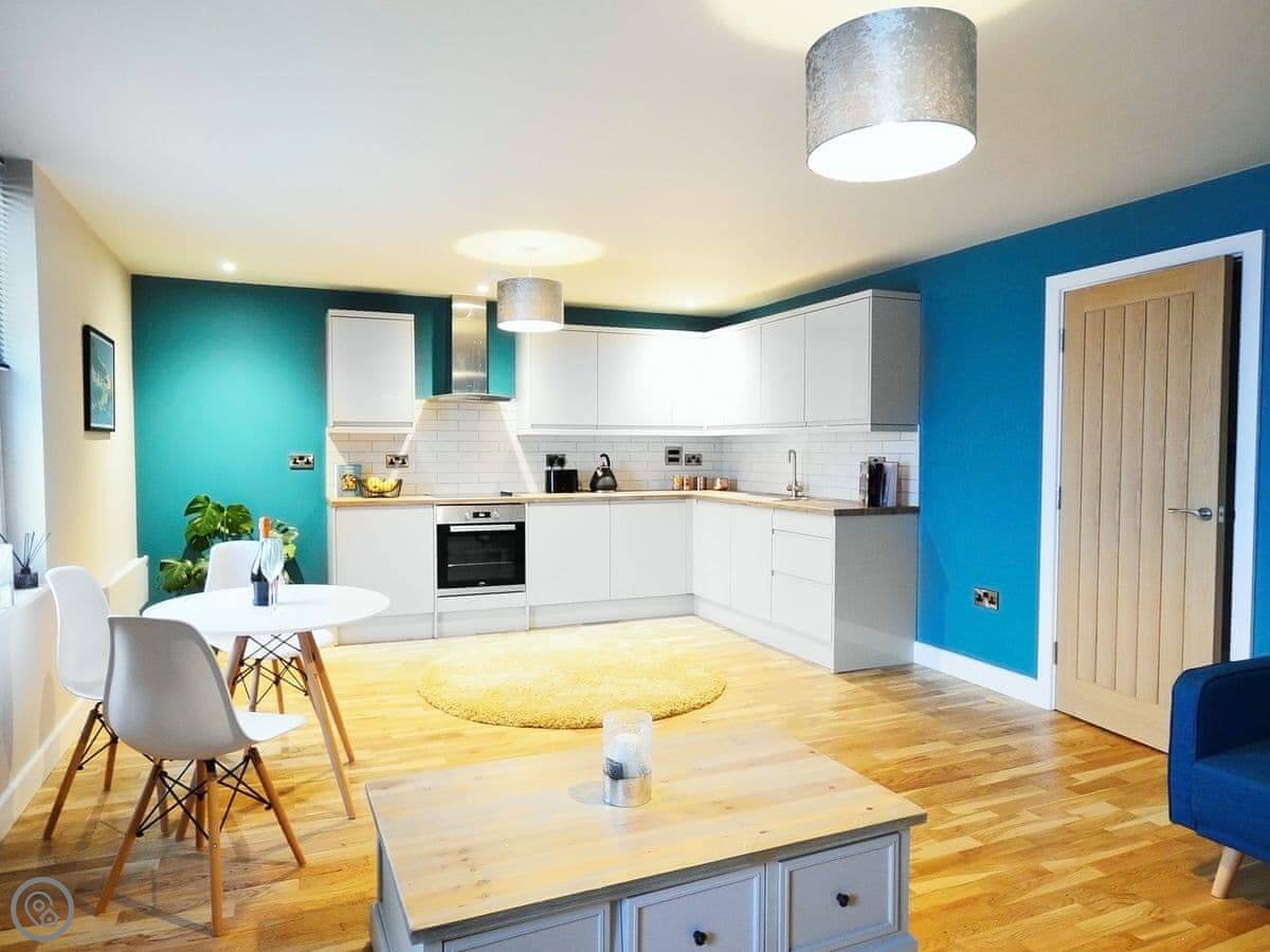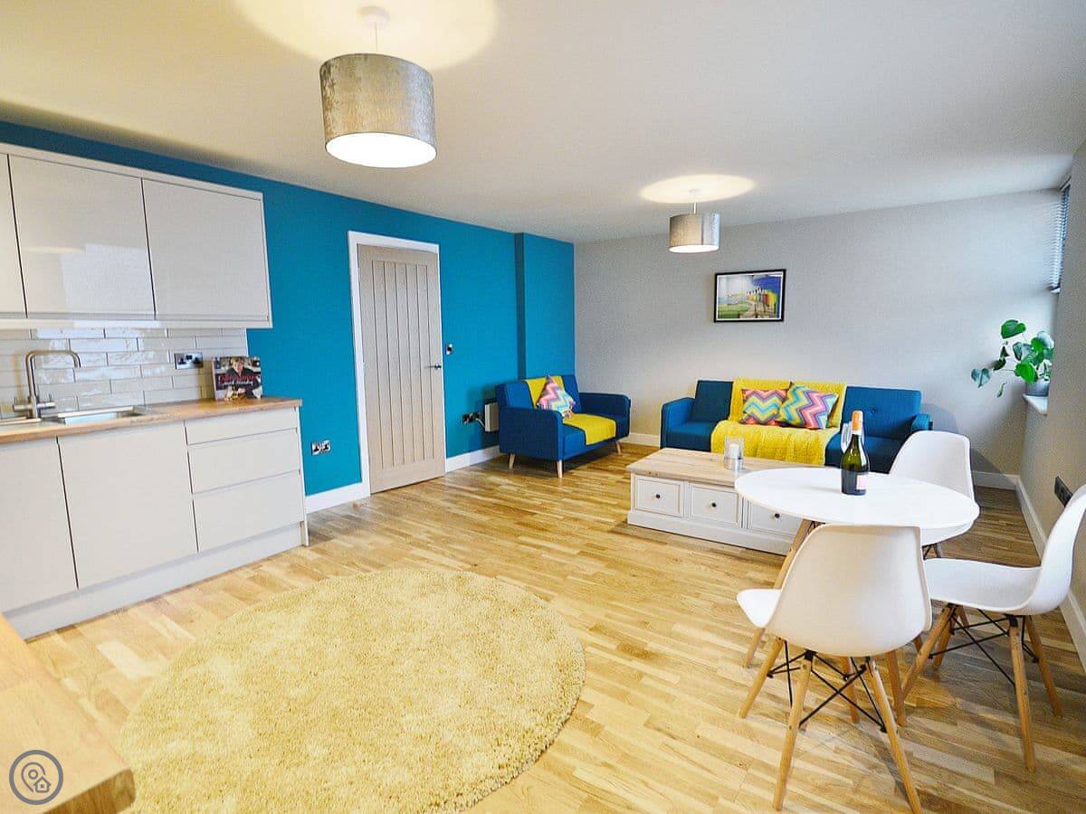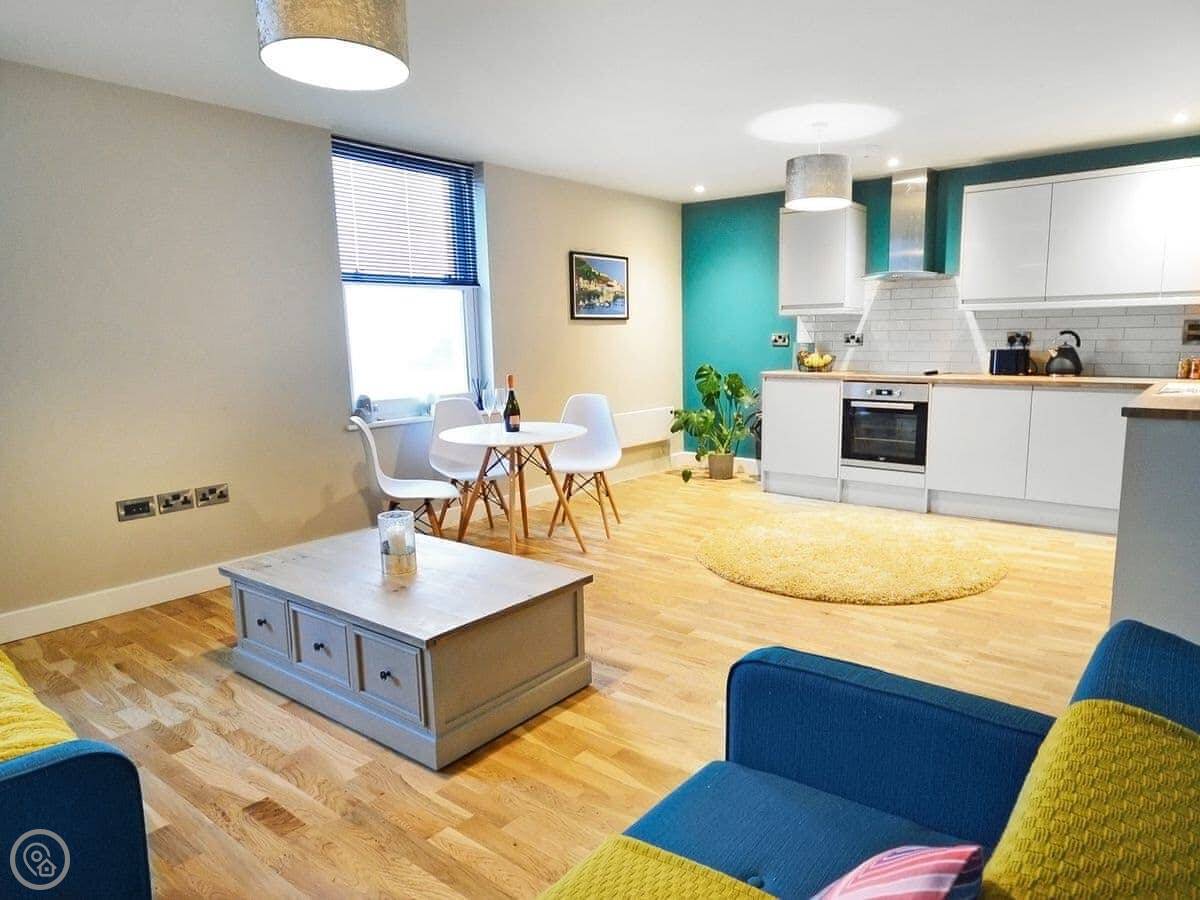 The flat is open plan, so the kitchen, dining and sitting area are all one room. There's a TV, WiFi, a dishwasher and a washing machine. The entrance, and the flat itself, are wheelchair accessible. There are no steps inside.
