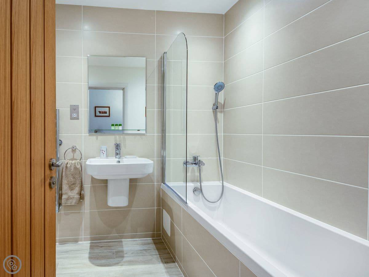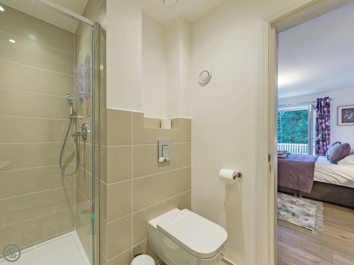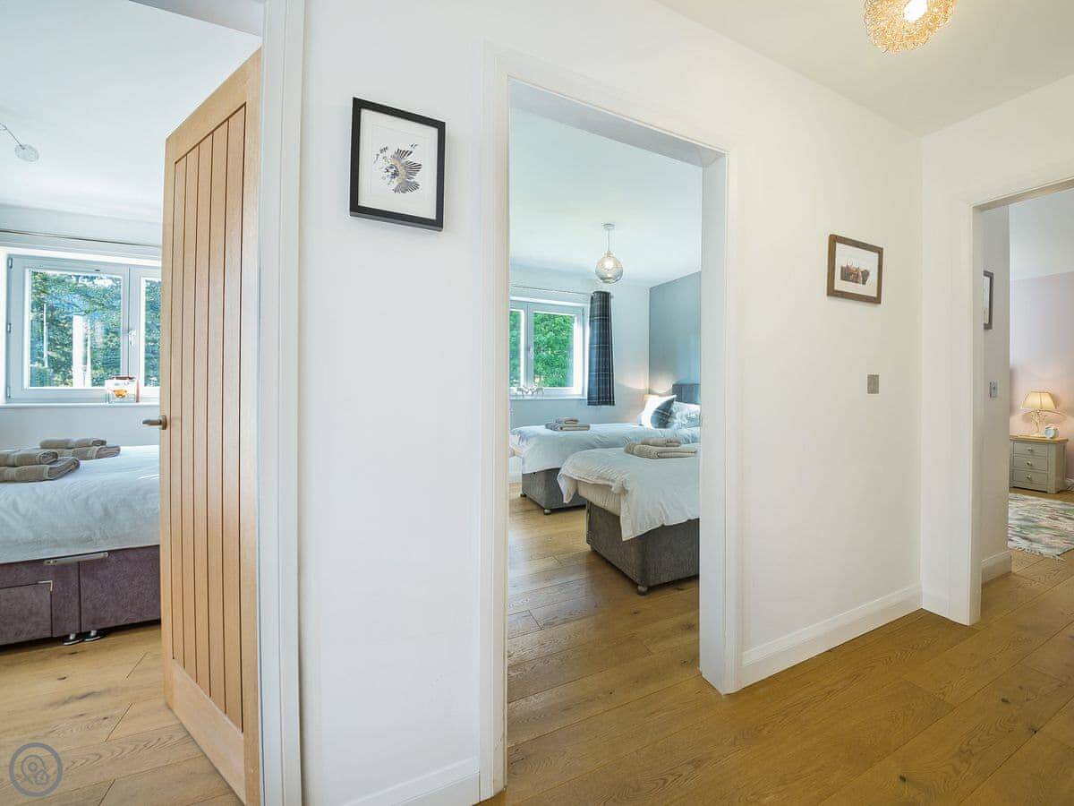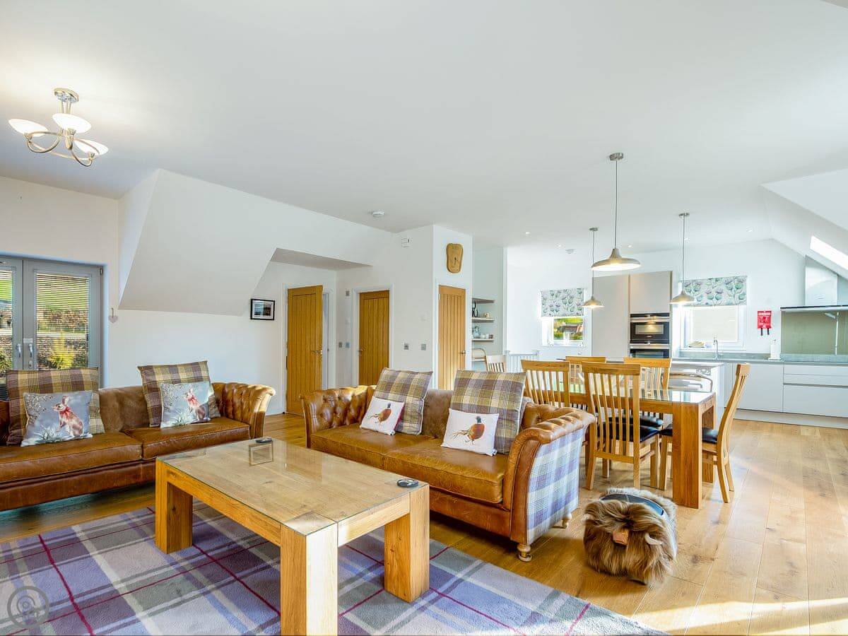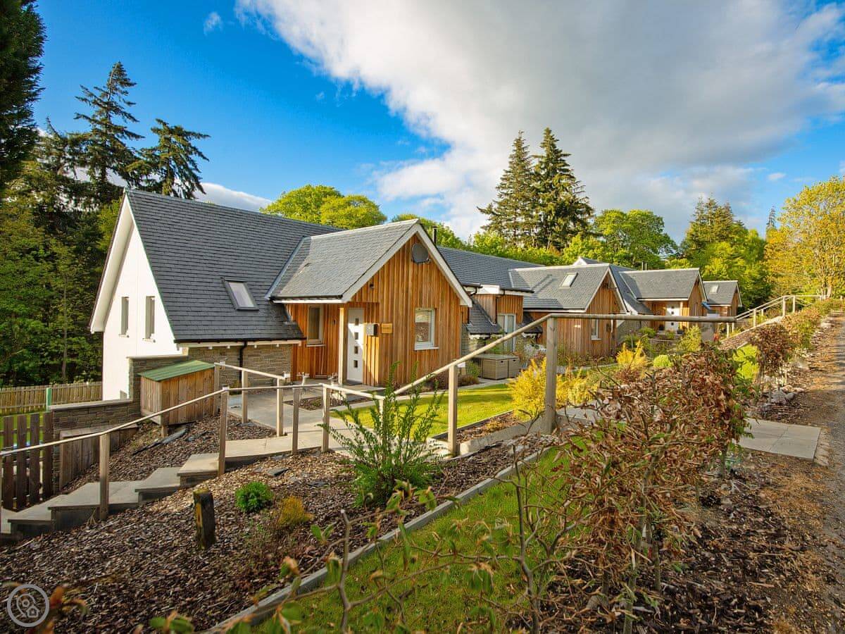 Saorsa is a stunning reverse-plan semi-detached holiday home sitting on the outskirts of the beautiful conservation village of Kenmore. Guests will be thrilled with the very good level of comfort and well thought-out rooms with modern contemporary finishes. On the ground floor there is a master kingsize bedroom with a stunning en-suite shower room, with French doors leading to the garden. There is a further twin bedroom with zip and link option and another kingsize bedroom both served by a stunning four piece bathroom. On the first floor there is a spectacular open plan living space with comfortable seating wrapped around a wood burner, and two sets of French doors, one leading to the balcony with views over Loch Tay, and separately to a patio to the front of the house with table and chairs, a spacious dining area and a very well-equipped kitchen breakfast bar and additional seating. The kitchen has a very good level of equipment and quality appliances and there is a separate utility room on the ground floor.