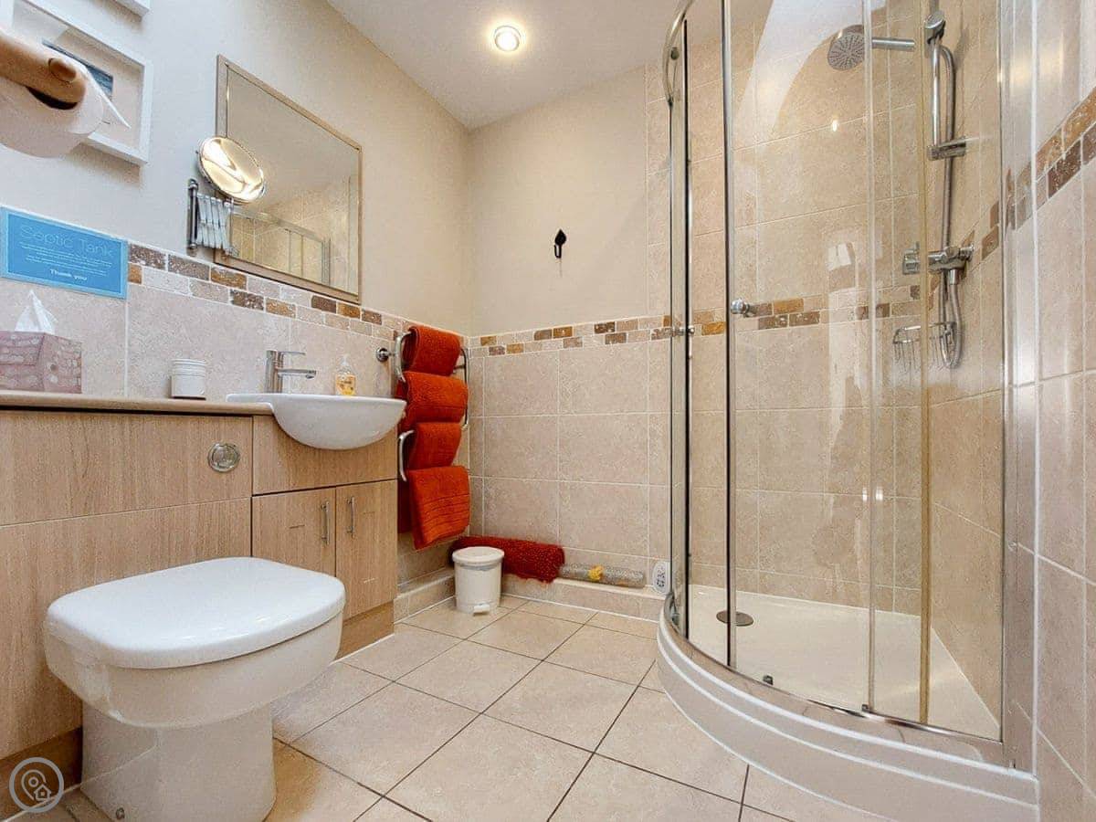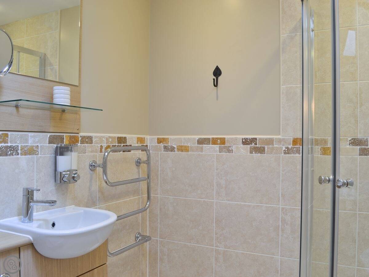 The bedroom and bathroom are on the ground floor. It's all one level, which is helpful if stairs are tricky. There's a shower, not a bath. It's got a 3 Star rating, so it's comfortable and clean. It's not a fancy hotel.