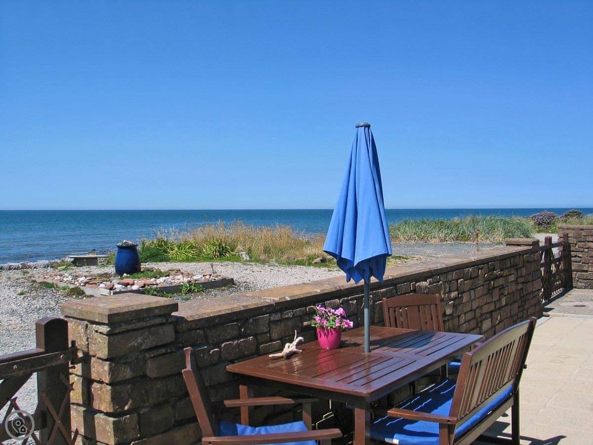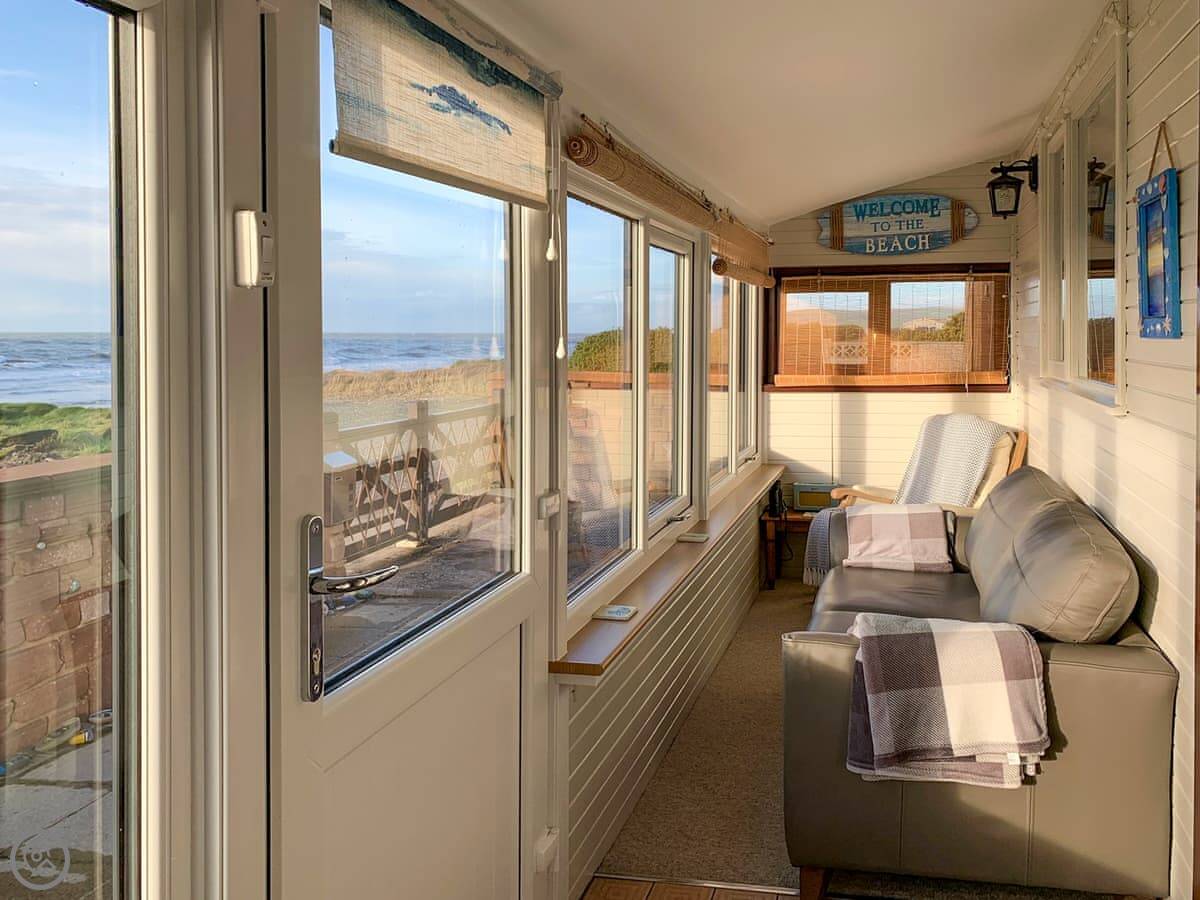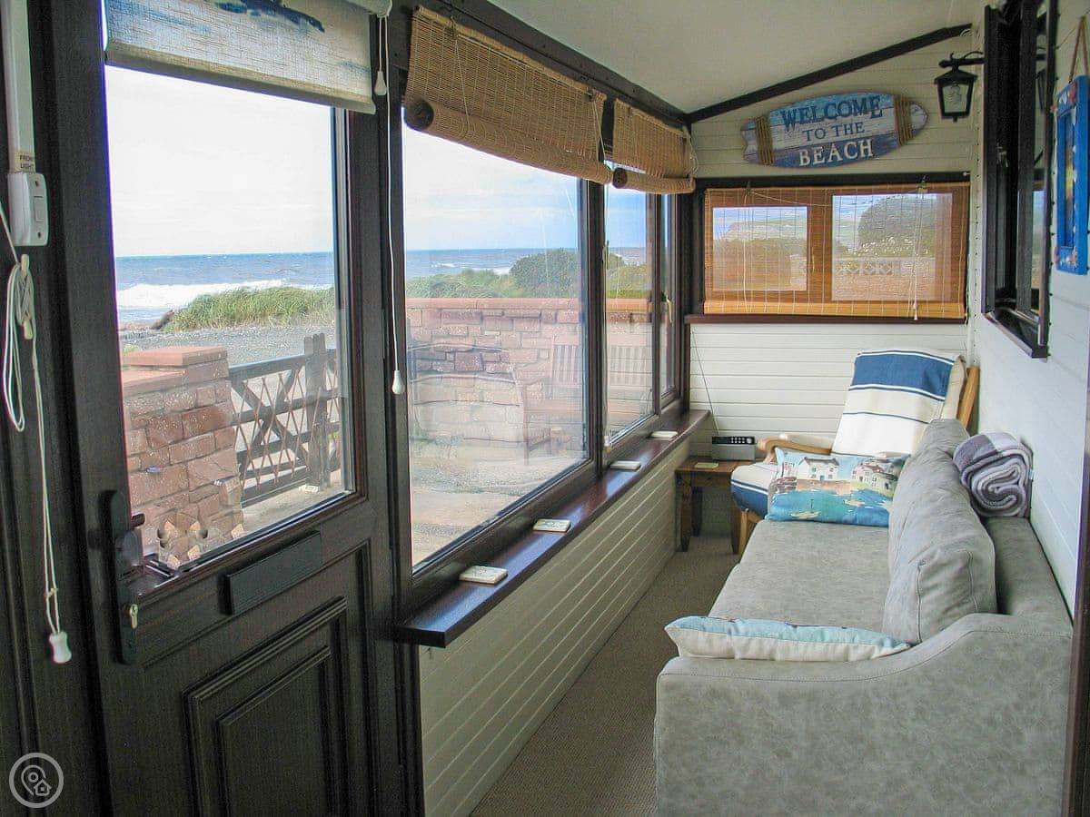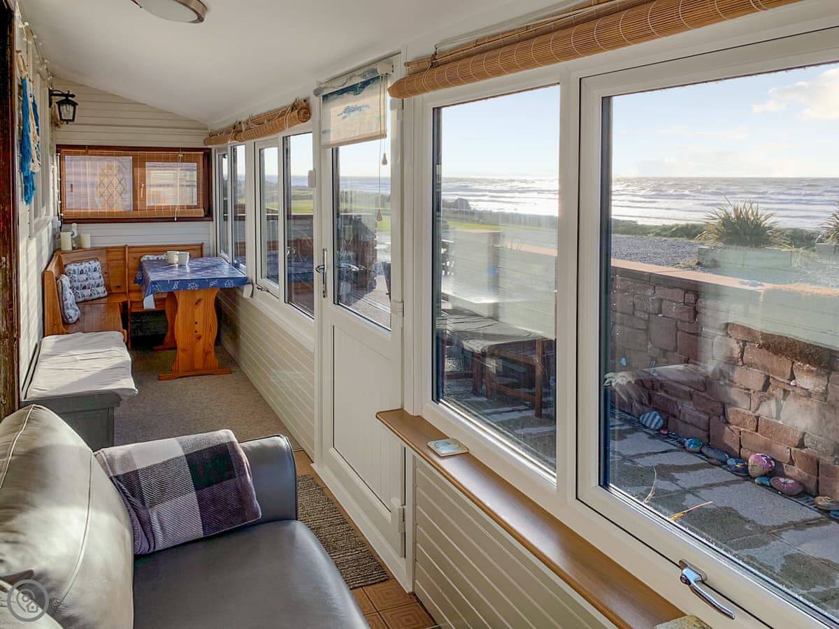The whole front of the cottage is a sun room. You sit in there and watch the sea, which is just a few yards away. You can hear it from the bedrooms too.
