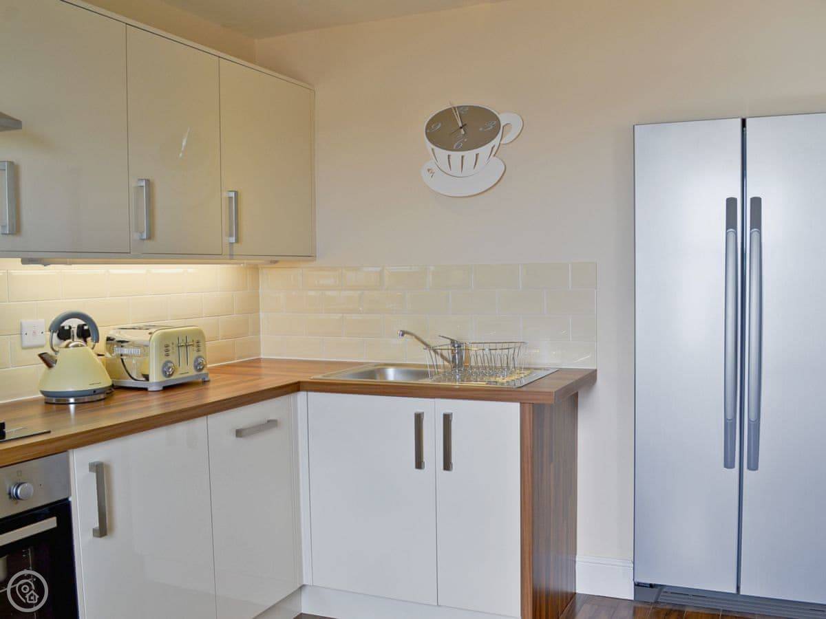 In the flat, there's a washing machine, a dishwasher, WiFi, and TV. Bedding and towels are included. There's a cot and a highchair if you need them. No pets, sorry.