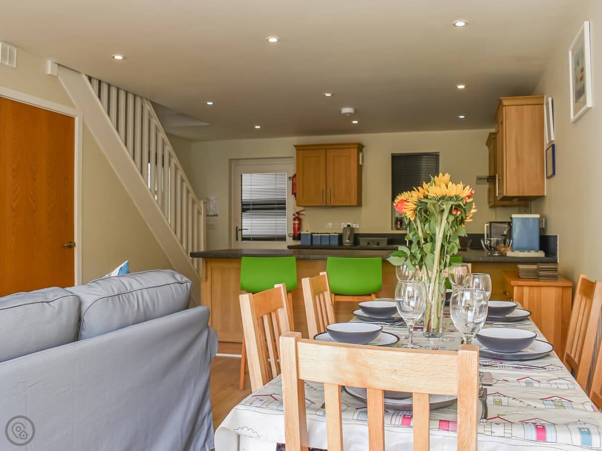 Inside it's open plan on the ground floor. There's a washing machine, dishwasher, WiFi, and a TV. Bedding and towels are included. We have a cot and a highchair if you need them.