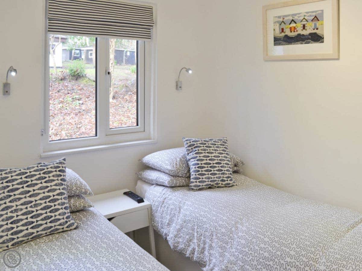 This is Gracelands. It's a single-storey lodge up on Lelant Downs, part of the St Ives Holiday Village. The site is big, over 100 acres of woodland. You're in a terraced row, so there are neighbours either side.