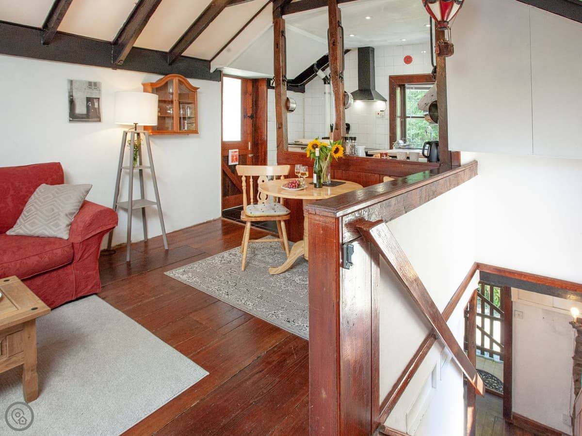 Inside, it's all open plan downstairs. There's a kitchen area, a table, and a sofa. Upstairs is the bedroom and bathroom. It's got a washing machine, TV, and a stairgate if you need it. Bedding is included.