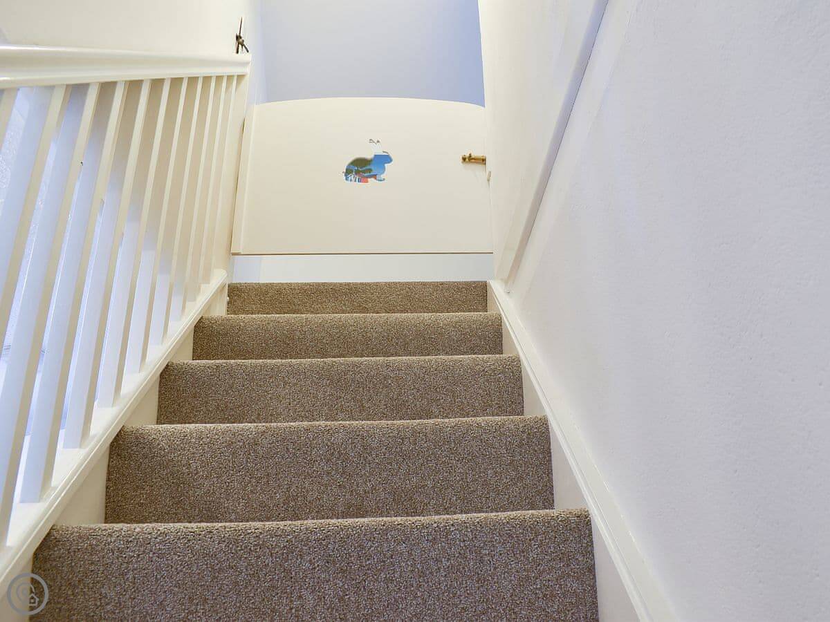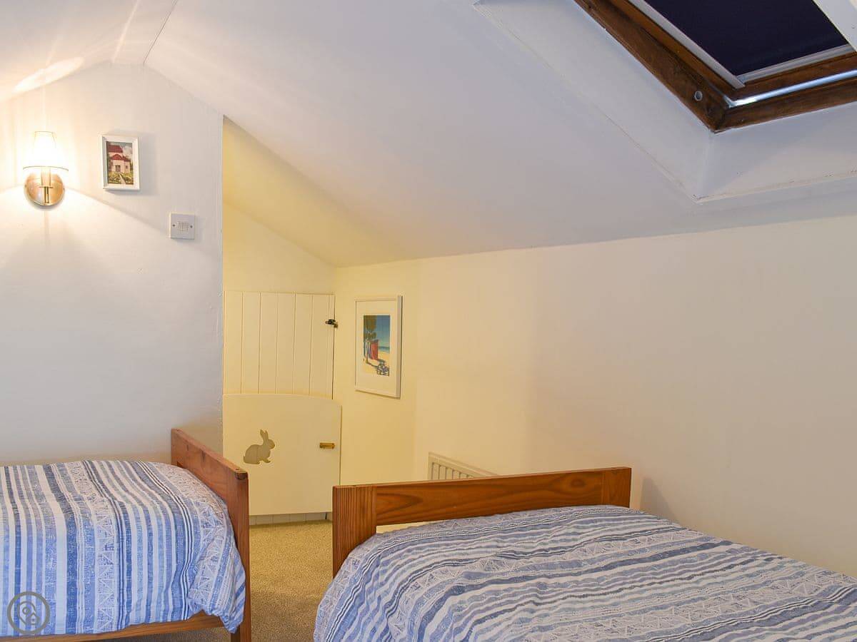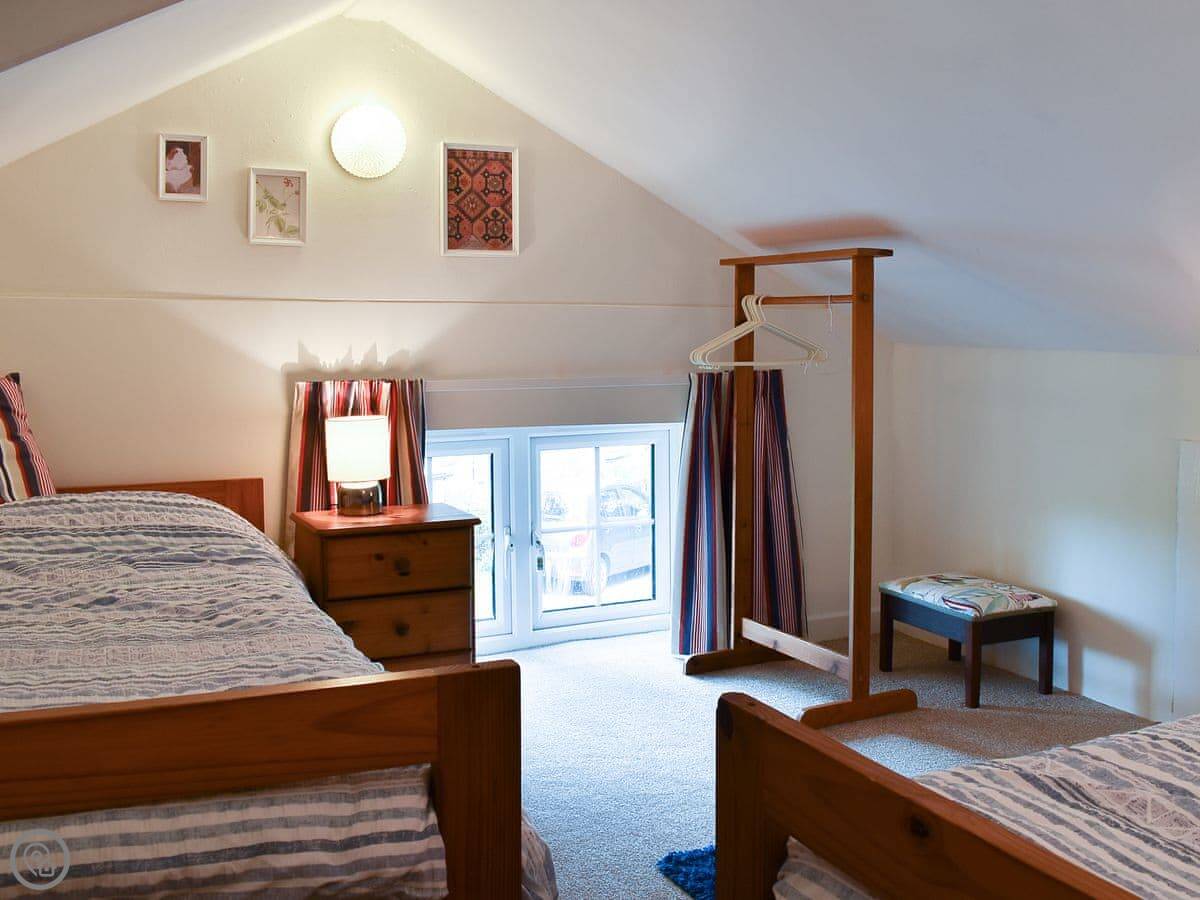 The cottage sleeps two. There's a double bedroom downstairs and a twin room upstairs under a vaulted ceiling. It has a 4 Star rating. The stairs are a normal cottage staircase, so they're a bit steeper than in a modern house.