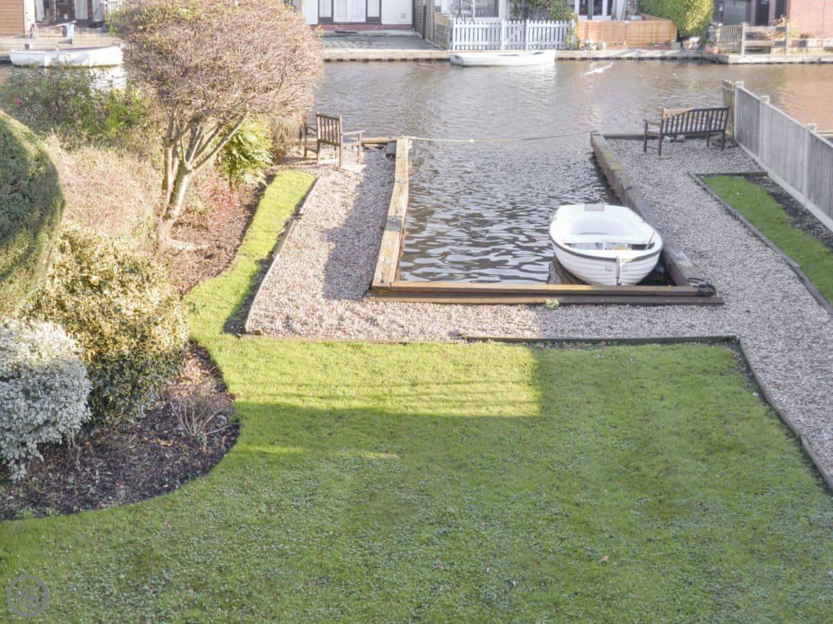 Set in a quiet, private lane, this delightful, well equipped holiday home is situated in the heart of Wroxham with lovely views from the living room and kitchen across its private, lawned garden, leading directly to the waterside, ideal for fishing enthusiasts. Cycle hire and day launches may be hired locally and moored in our quay heading. The coastline for excellent sandy beaches is only 12 miles away and the city of Norwich with its cathedrals, museums, theatres, cafes and shops is 8 miles. BeWILDerwood in Horning offers an outdoor tree house adventure with zip wires, jungle bridges and marsh walks. Sprowston golf course is 5 miles away. Shops and pubs 200 metres.