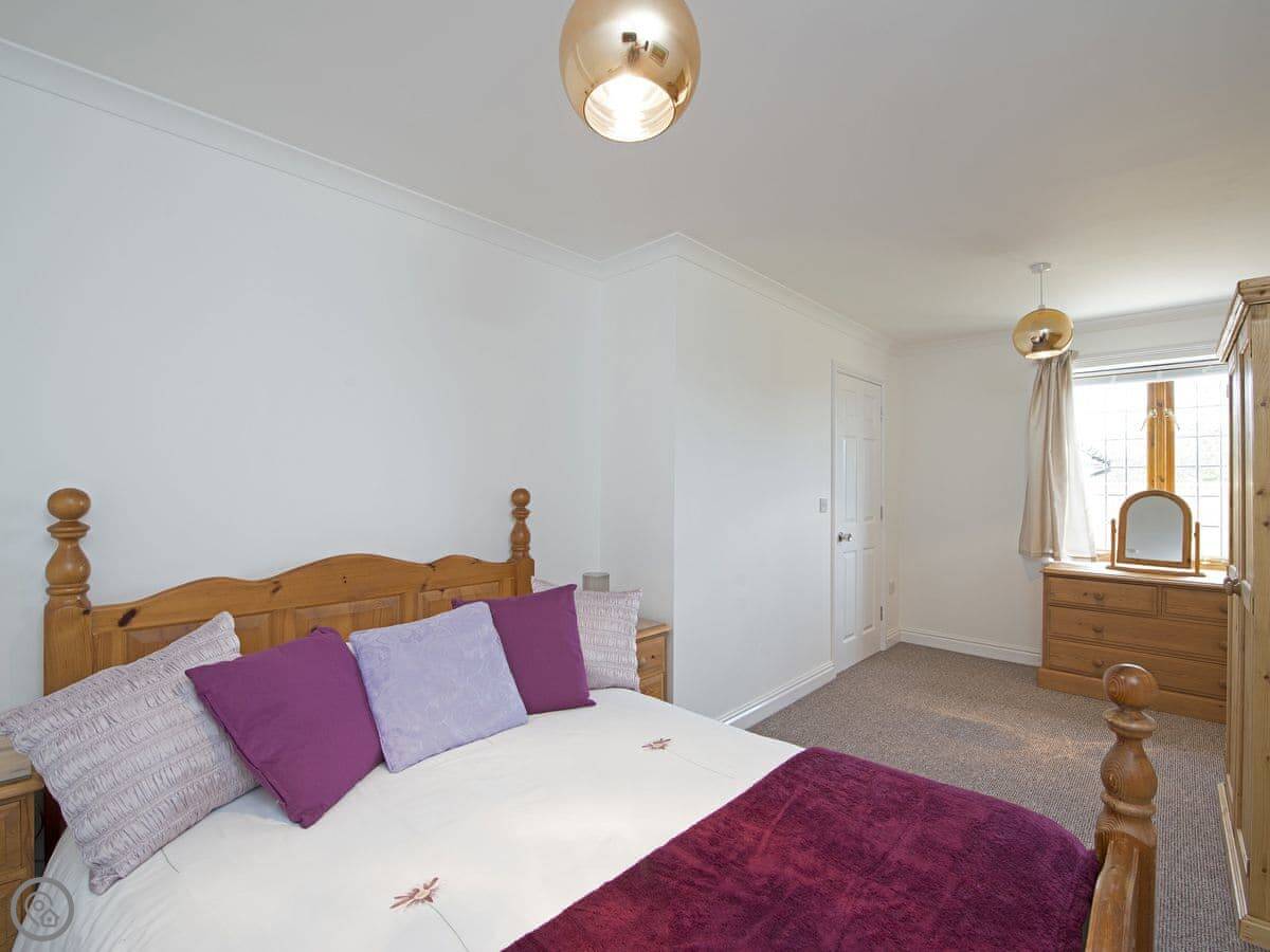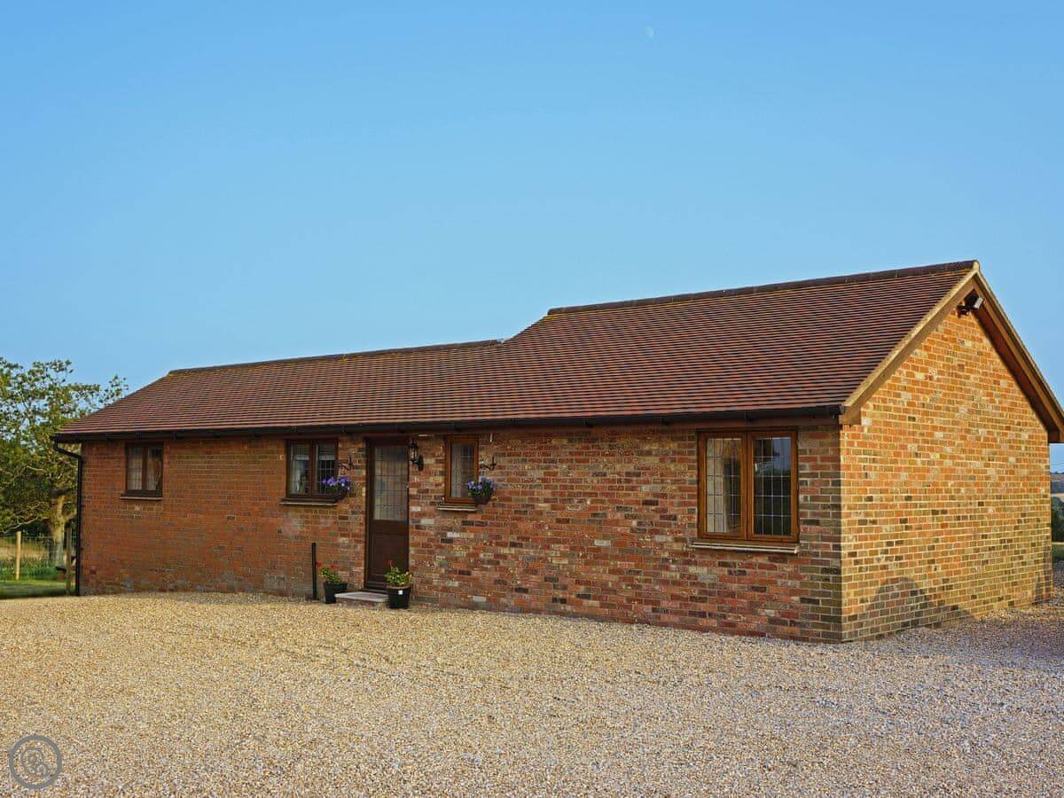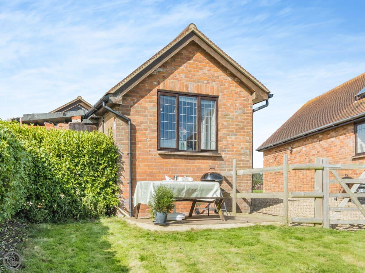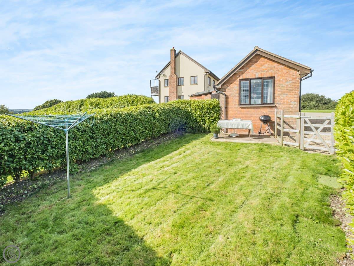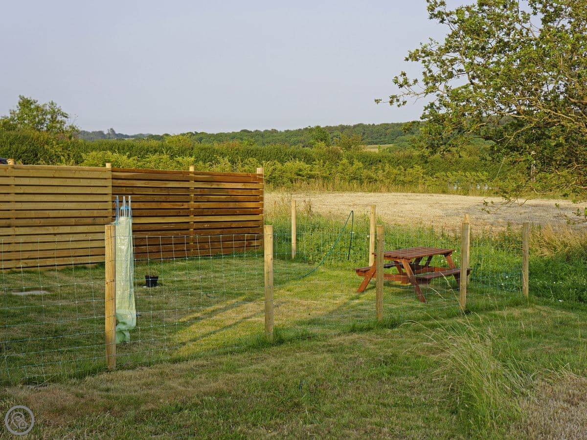 The garden is enclosed, which is good if you're bringing dogs. You can have up to two. There's a table and chairs out there, and a barbecue. The view is over fields, because of the hill.