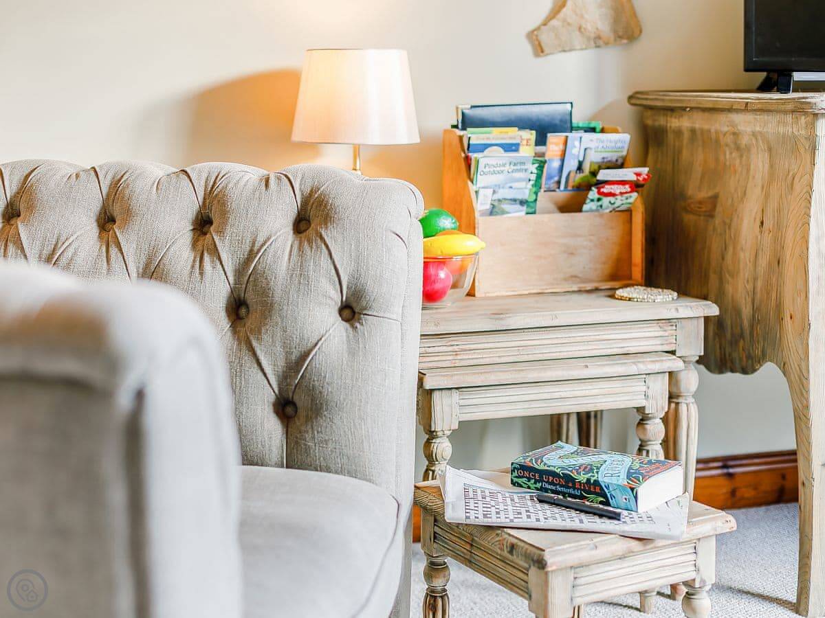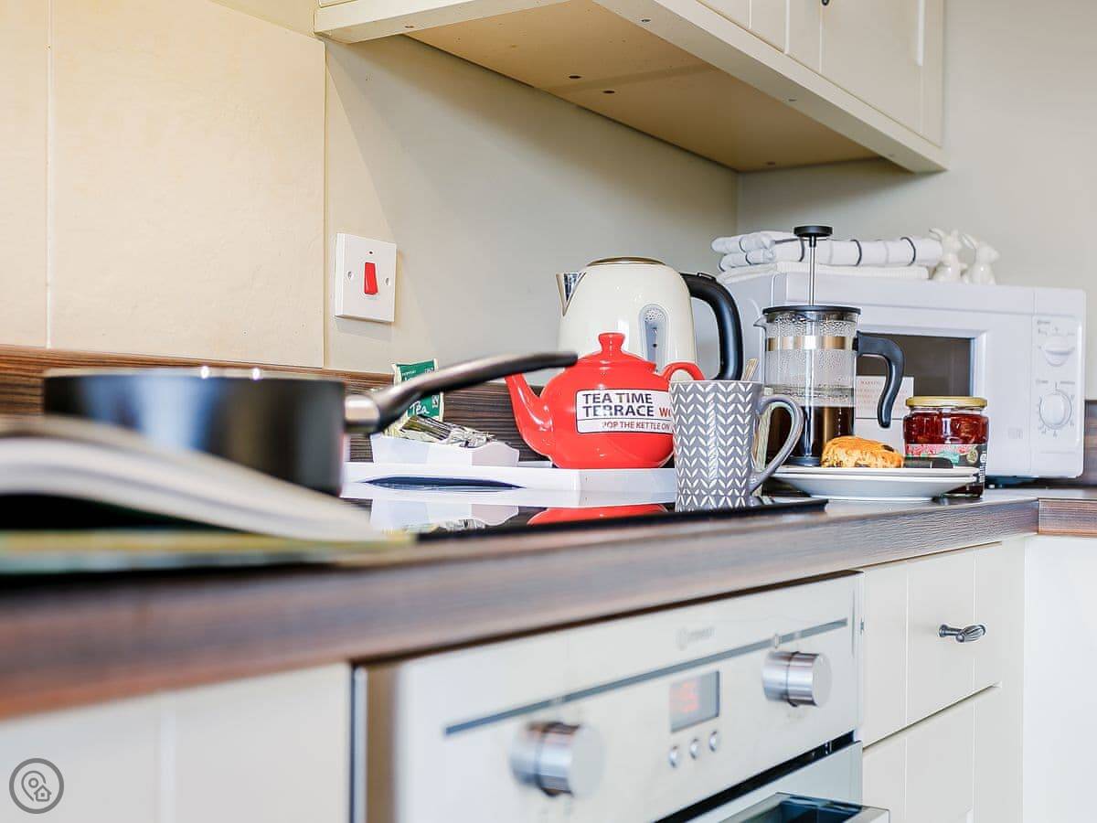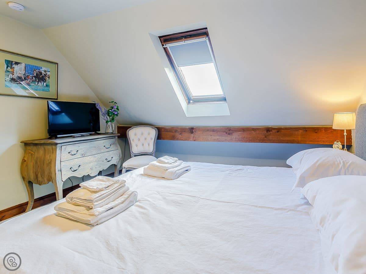 Inside, it's got what you need. TV, WiFi, a washing machine. Bedding's included. There's a cot and a highchair if you need them. You can bring one dog.