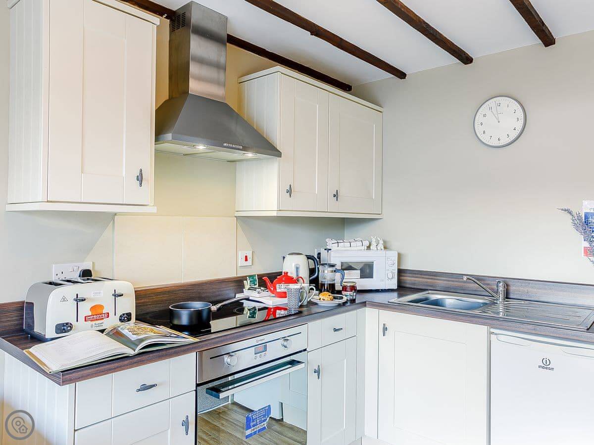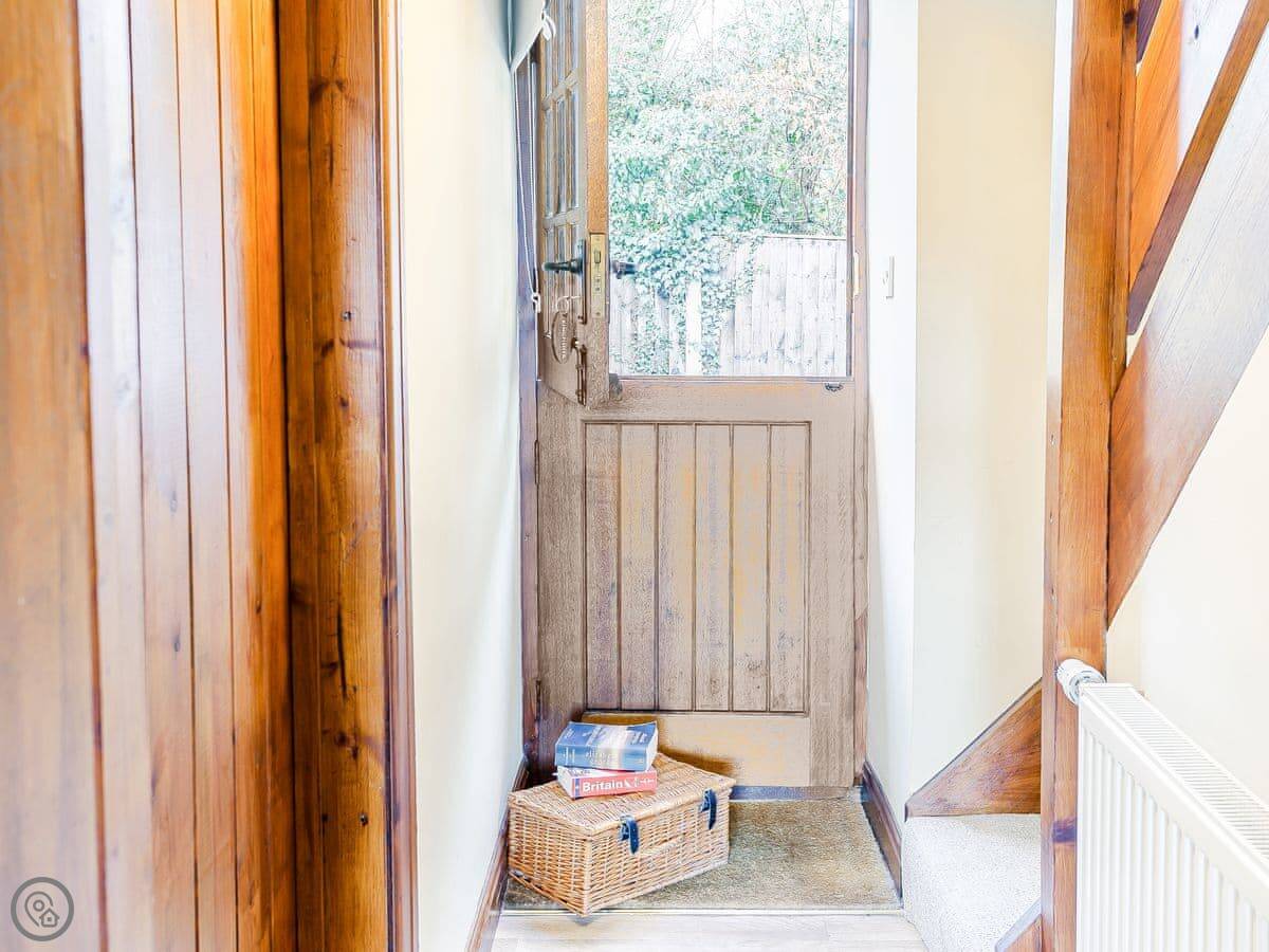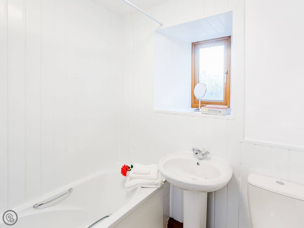 Inside, it's got what you need. TV, WiFi, a washing machine. Bedding's included. There's a cot and a highchair if you need them. You can bring one dog.