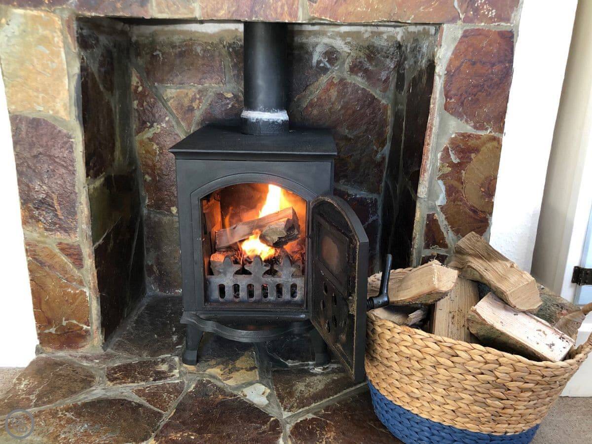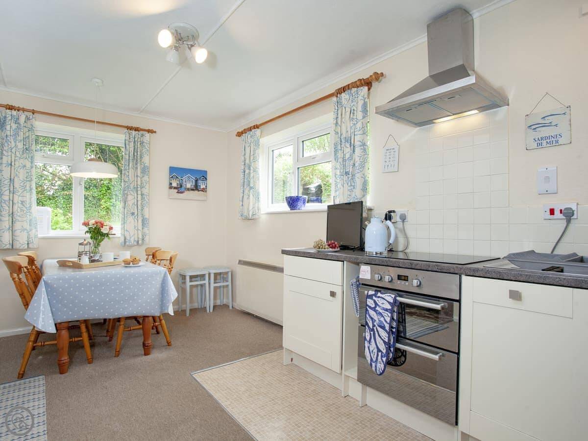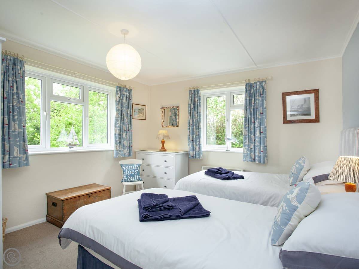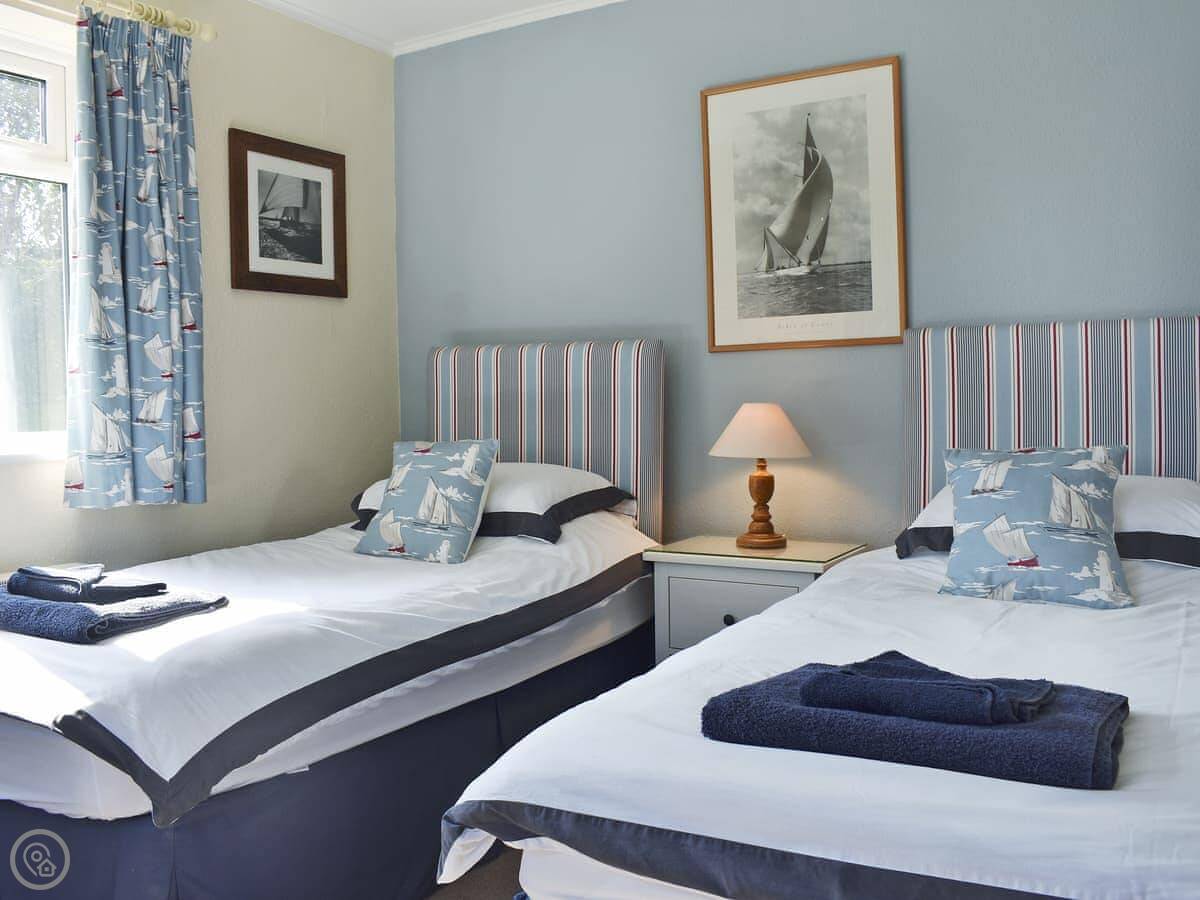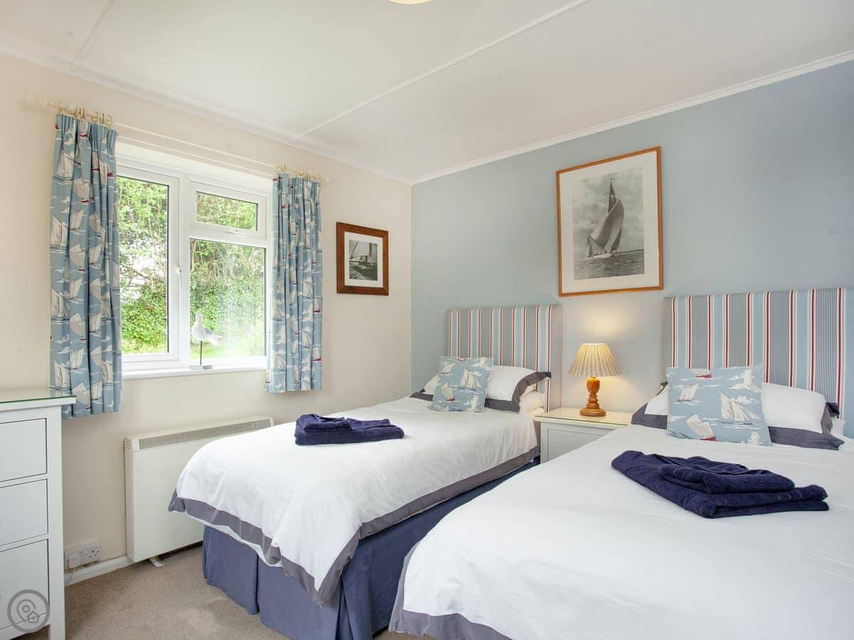 It sleeps four. Two bedrooms, both en-suite, so a bathroom each. It's got a 4 Star rating. It's modern and well-kept. The layout is all on one level, which is useful. There's a woodburner for cooler evenings.