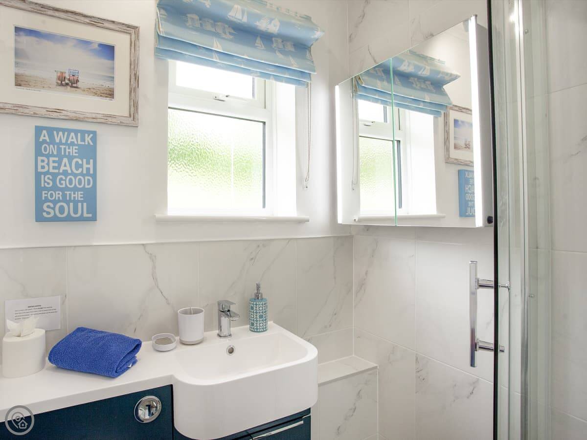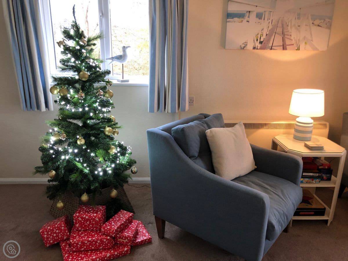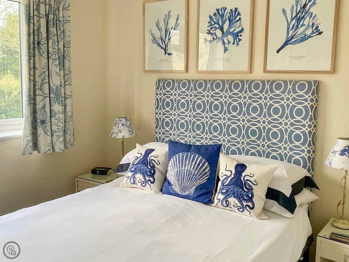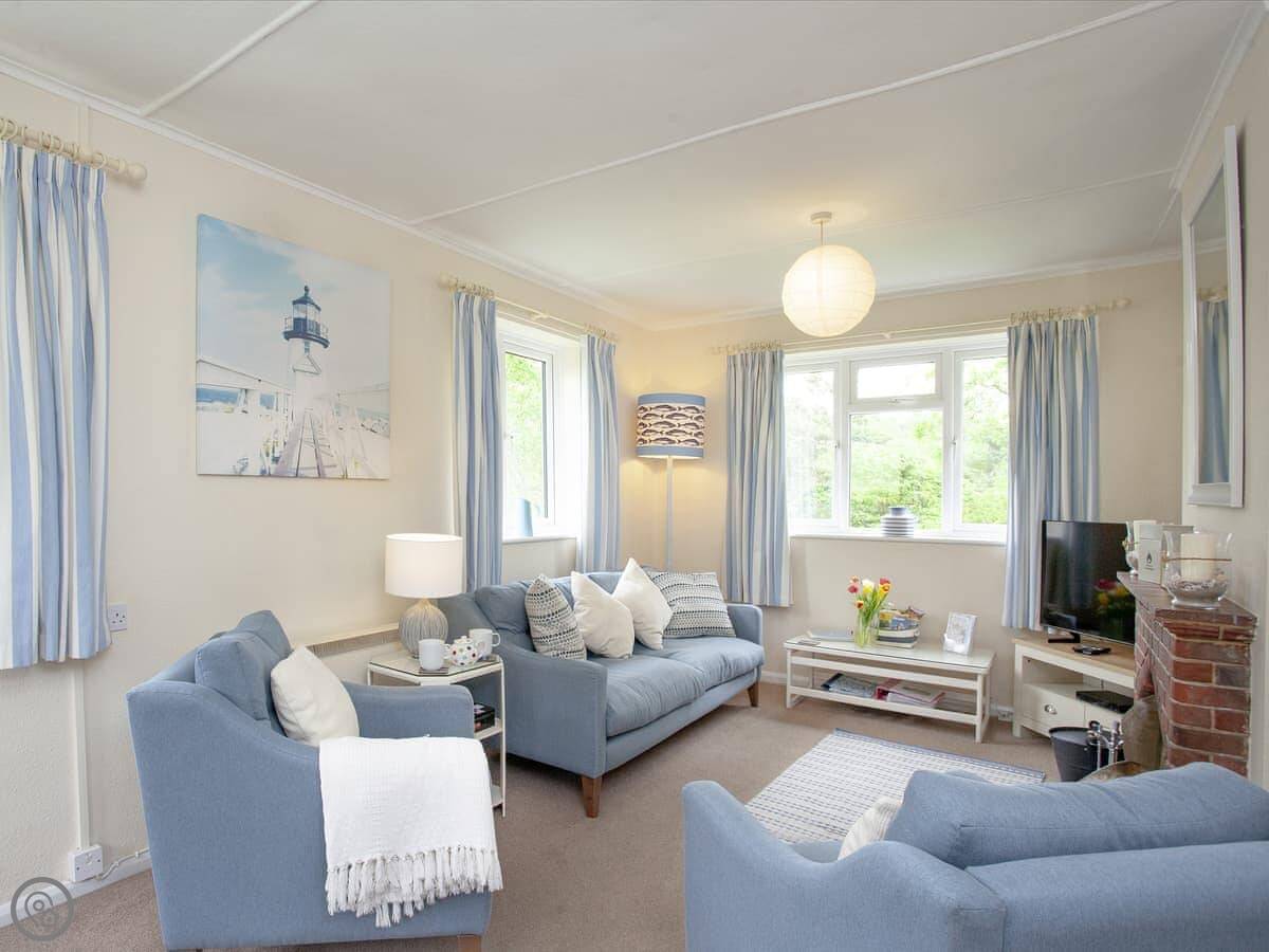 It sleeps four. Two bedrooms, both en-suite, so a bathroom each. It's got a 4 Star rating. It's modern and well-kept. The layout is all on one level, which is useful. There's a woodburner for cooler evenings.