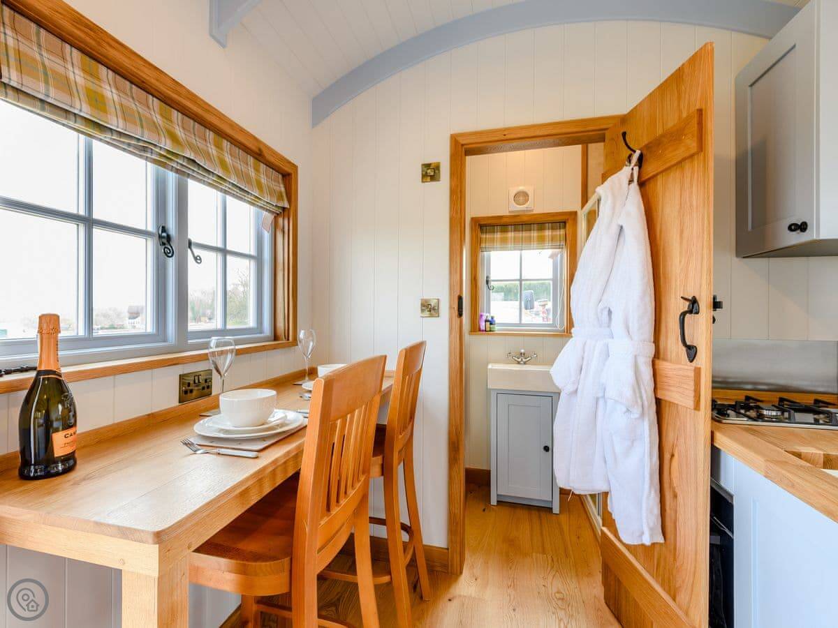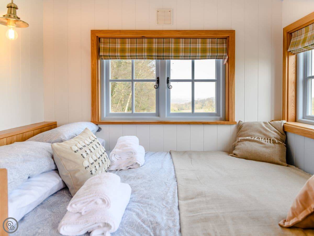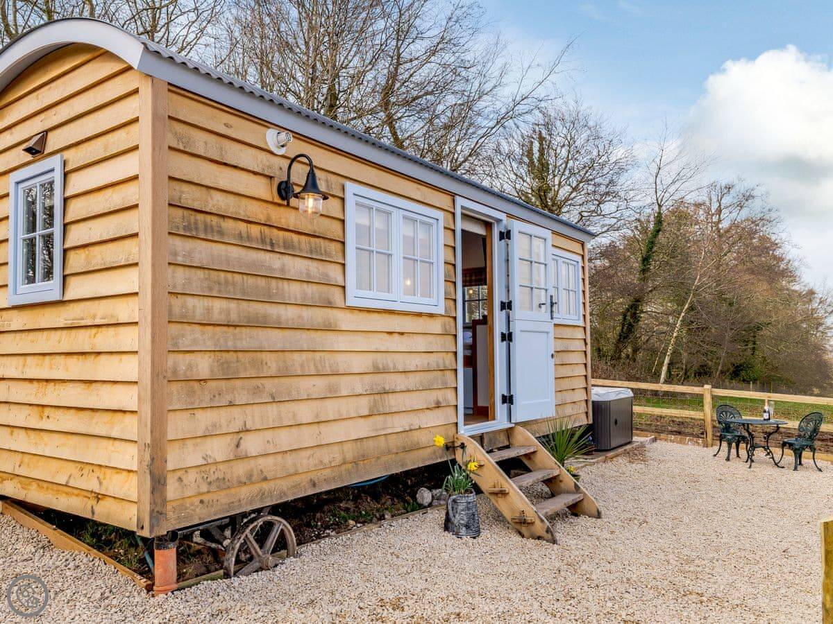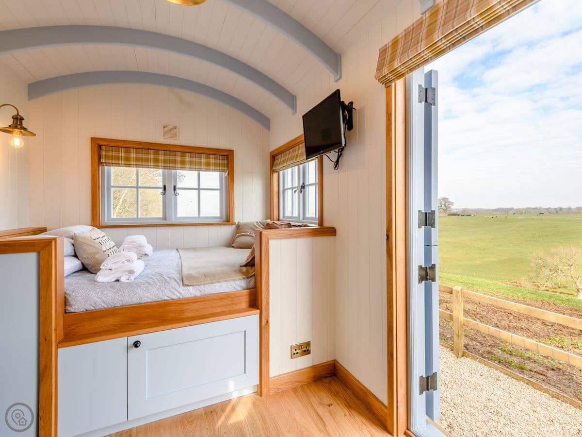 It sleeps two. One bedroom, one shower room. It's got a 4 Star rating, which means it's well done and comfortable. It's all on one level, so there are no steps inside. The entrance and some internal doorways are wheelchair accessible, but the terrain outside to the hot tub is a grassed field path, so that might be trickier depending on mobility.