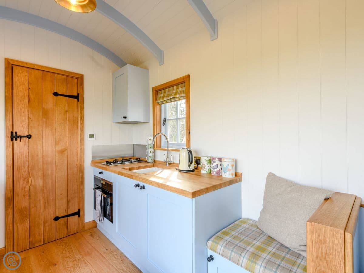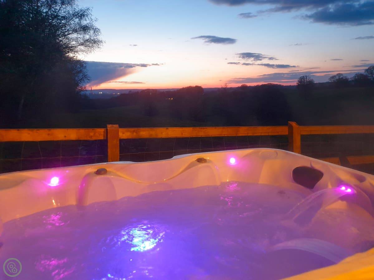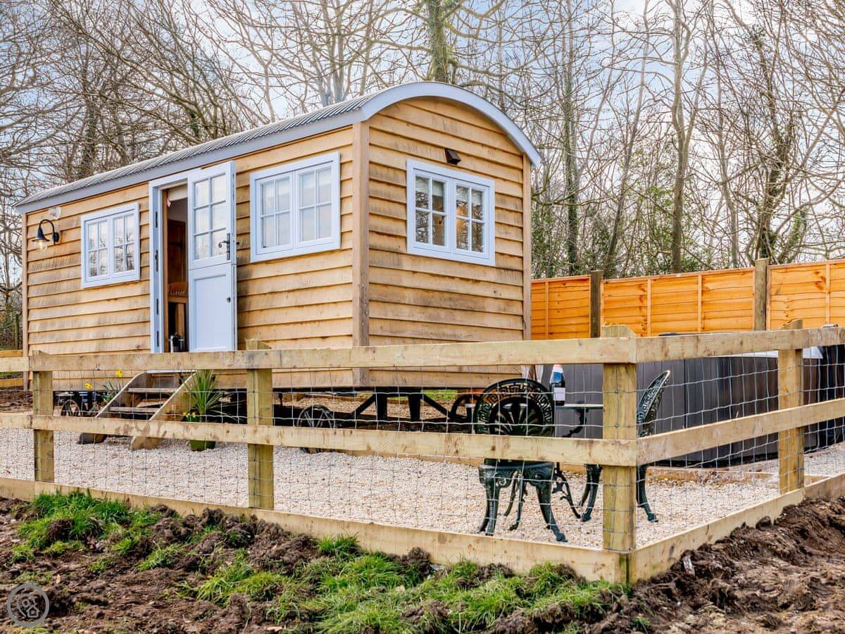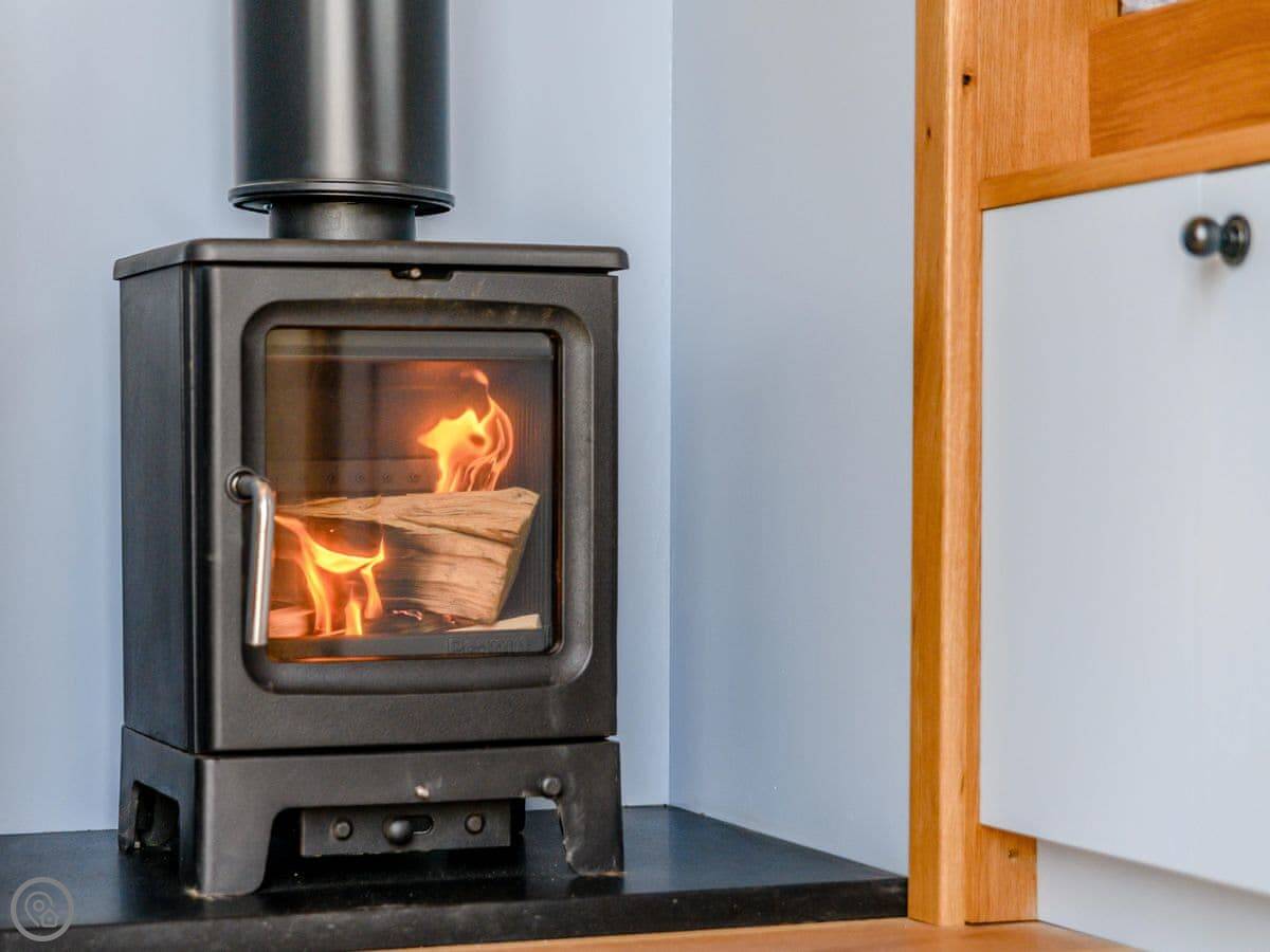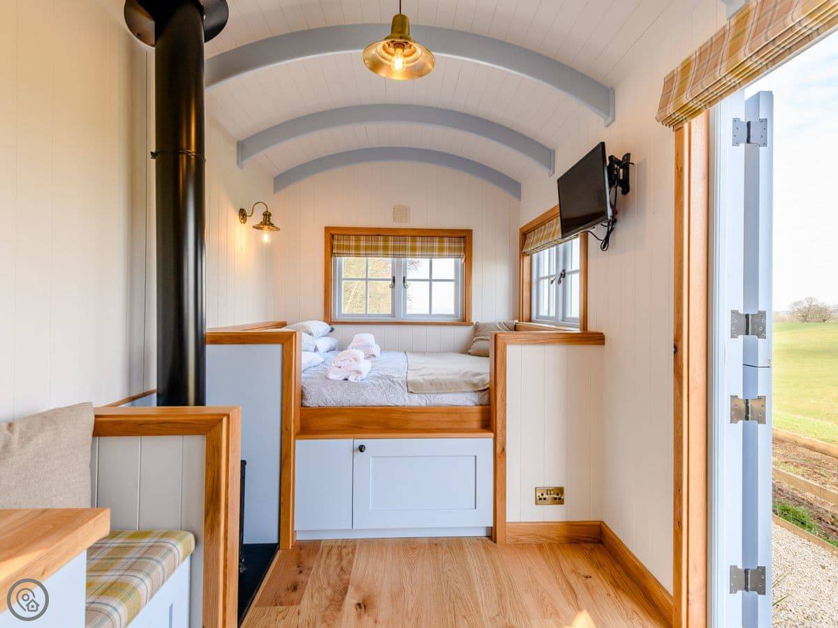 It's got an open plan living space with a wood burner for cooler nights. There's a small kitchen area separate from the bedroom. Outside, there's a deck with a patio area, a barbecue, and a private hot tub. You get your own bit of the field to use.