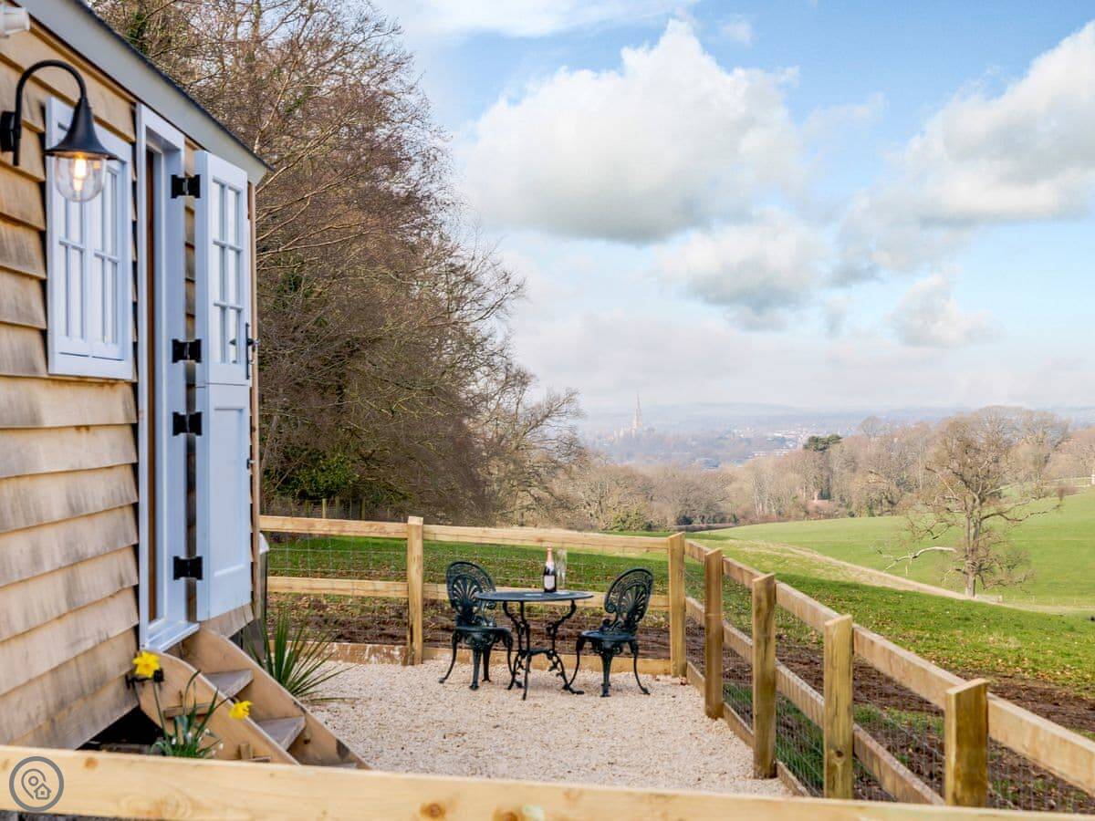 This is the Spire View Hut in Alderbury, Wiltshire. It's a shepherd's hut in a field, with a view across to Salisbury Cathedral spire. You can see it from the decking. It's detached, so it's just you out there.