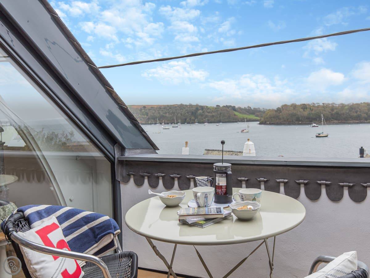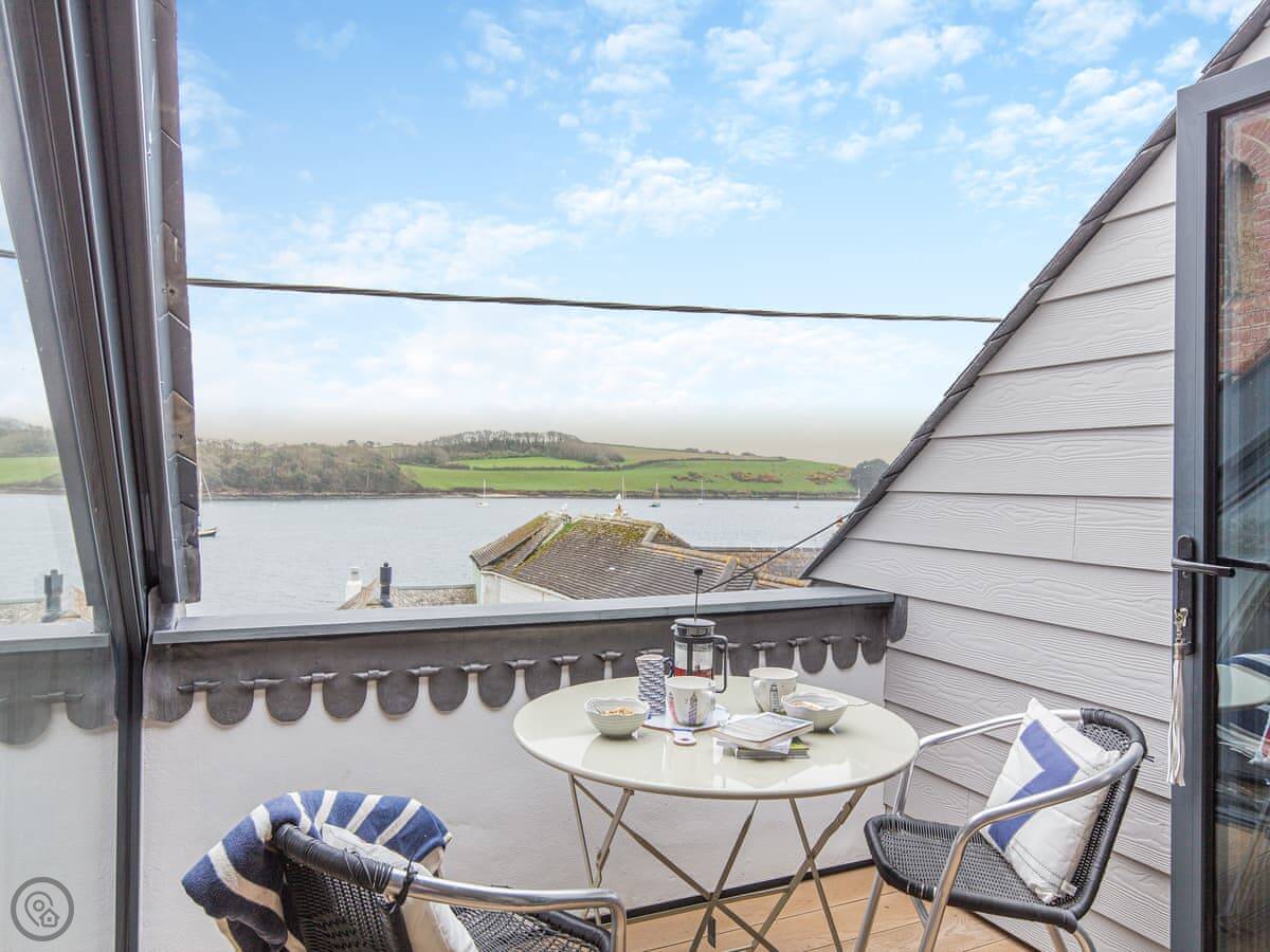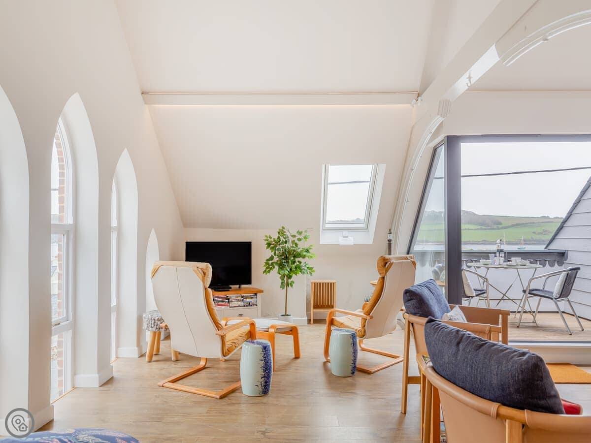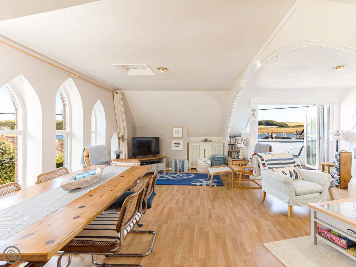 The layout is upside down, so the main living room is upstairs. That's because the views are better from there. You can see the river, the harbour, and the sea. Patio doors open onto a balcony you can sit on.