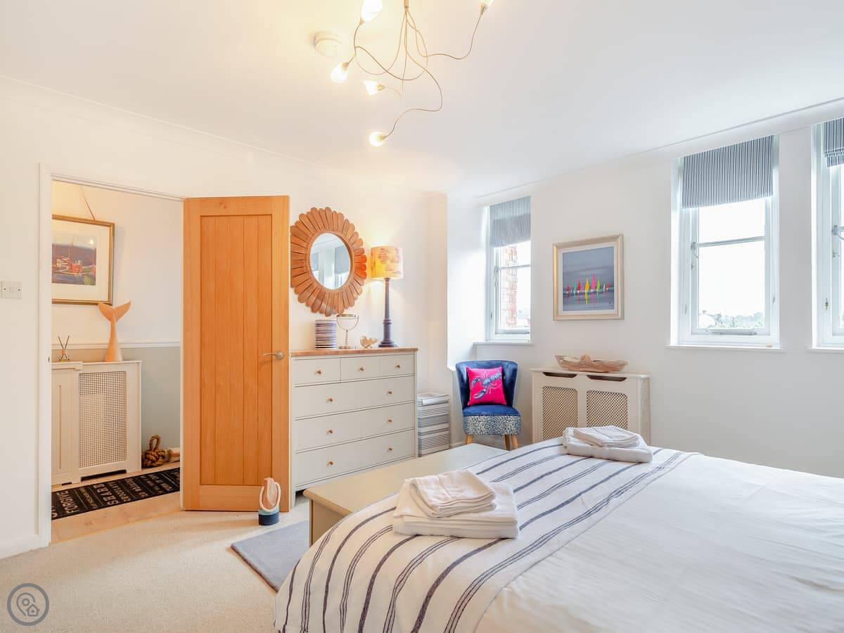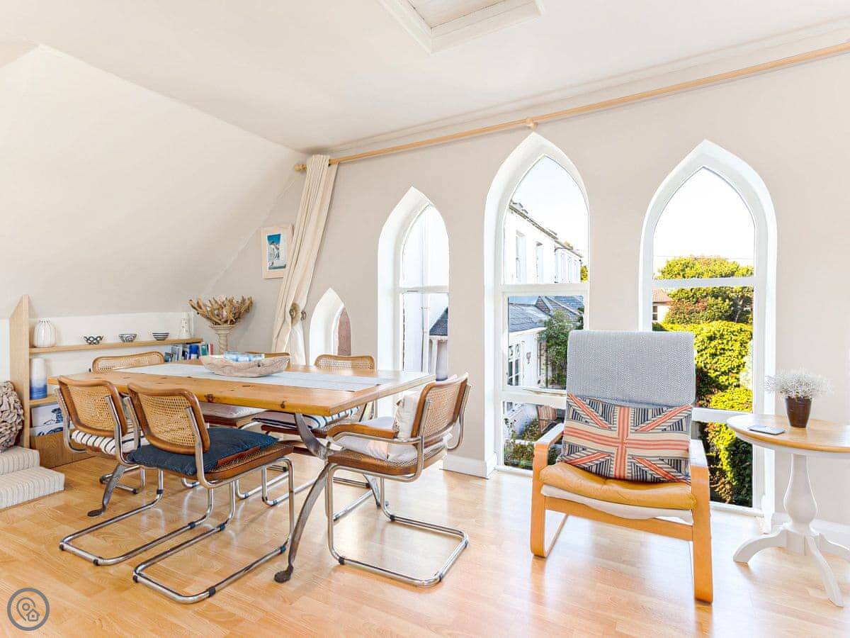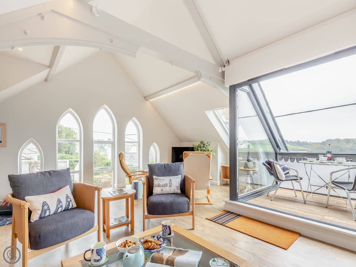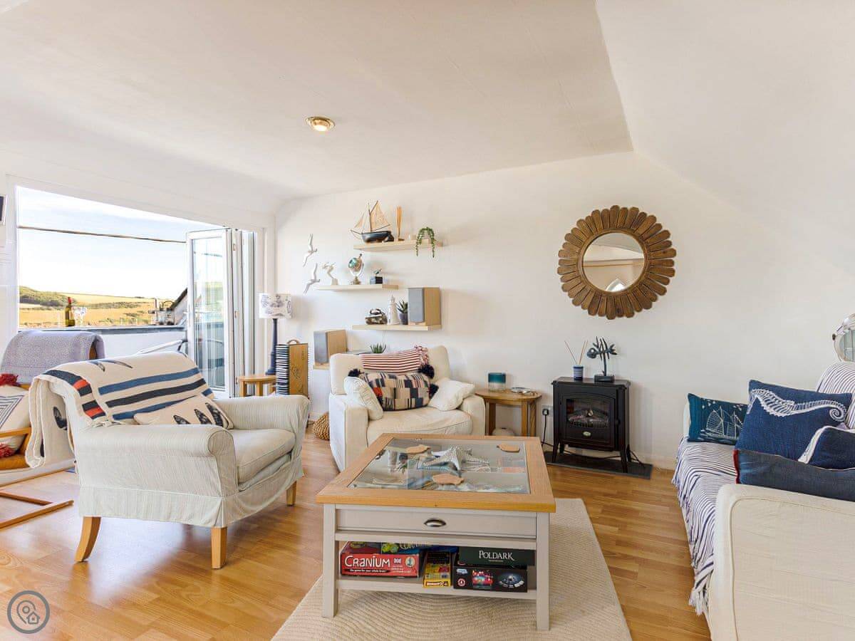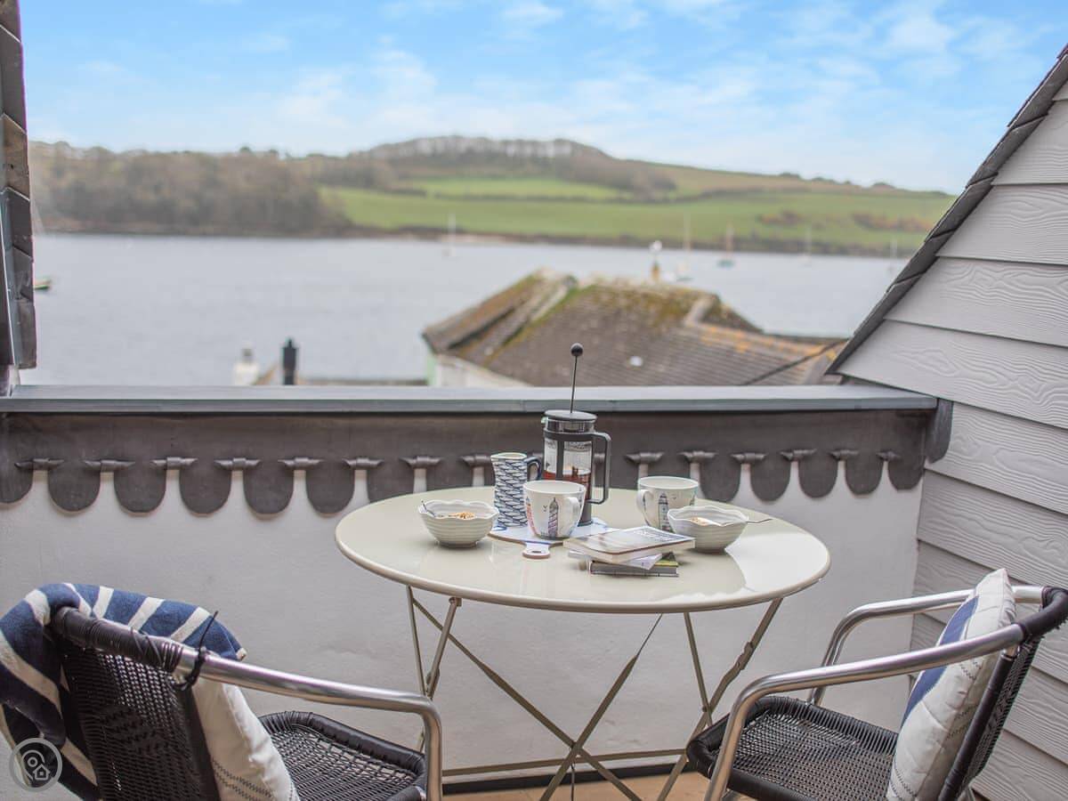 The layout is upside down, so the main living room is upstairs. That's because the views are better from there. You can see the river, the harbour, and the sea. Patio doors open onto a balcony you can sit on.