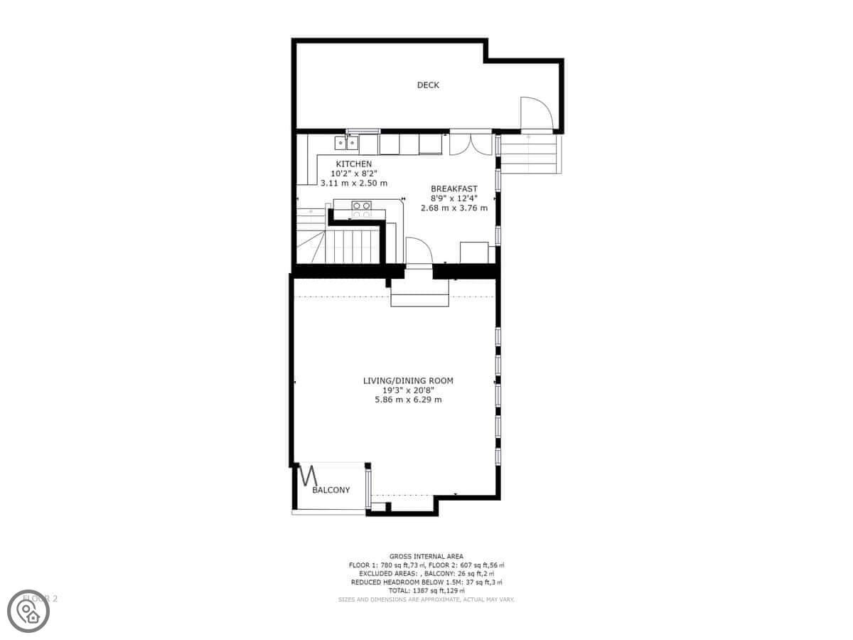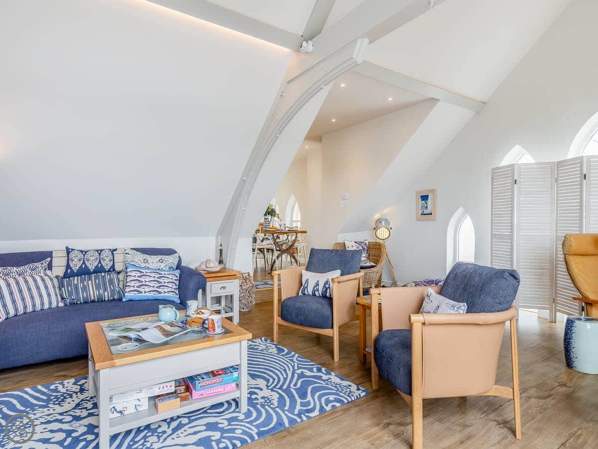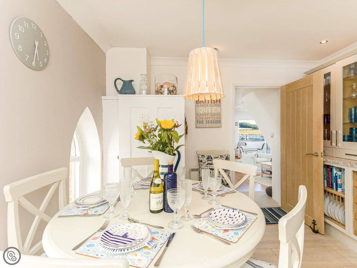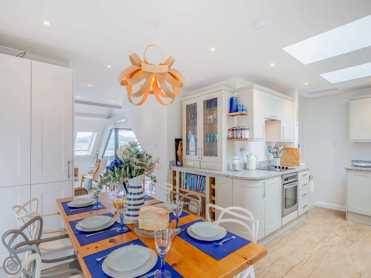The layout is upside down, so the main living room is upstairs. That's because the views are better from there. You can see the river, the harbour, and the sea. Patio doors open onto a balcony you can sit on.