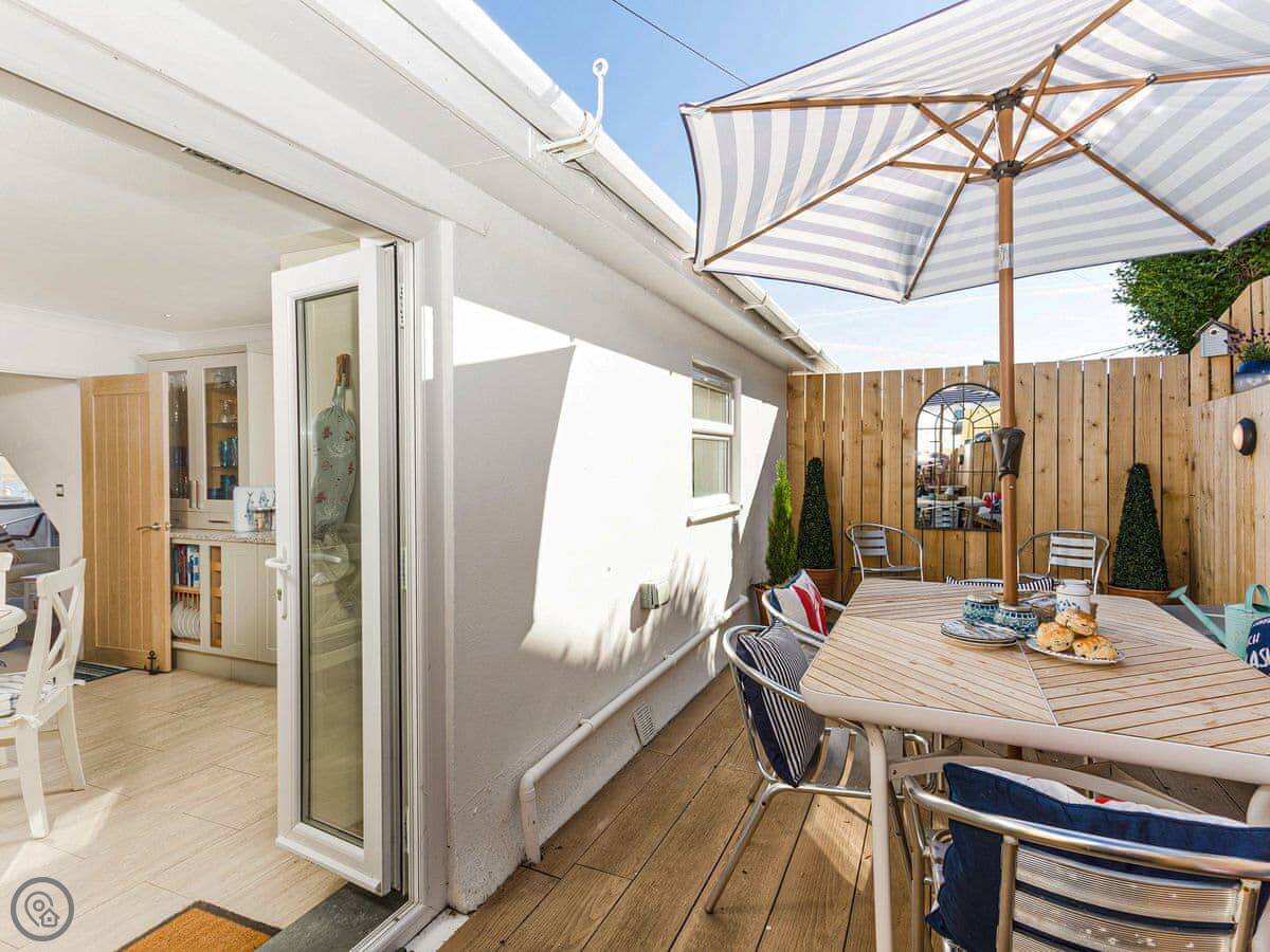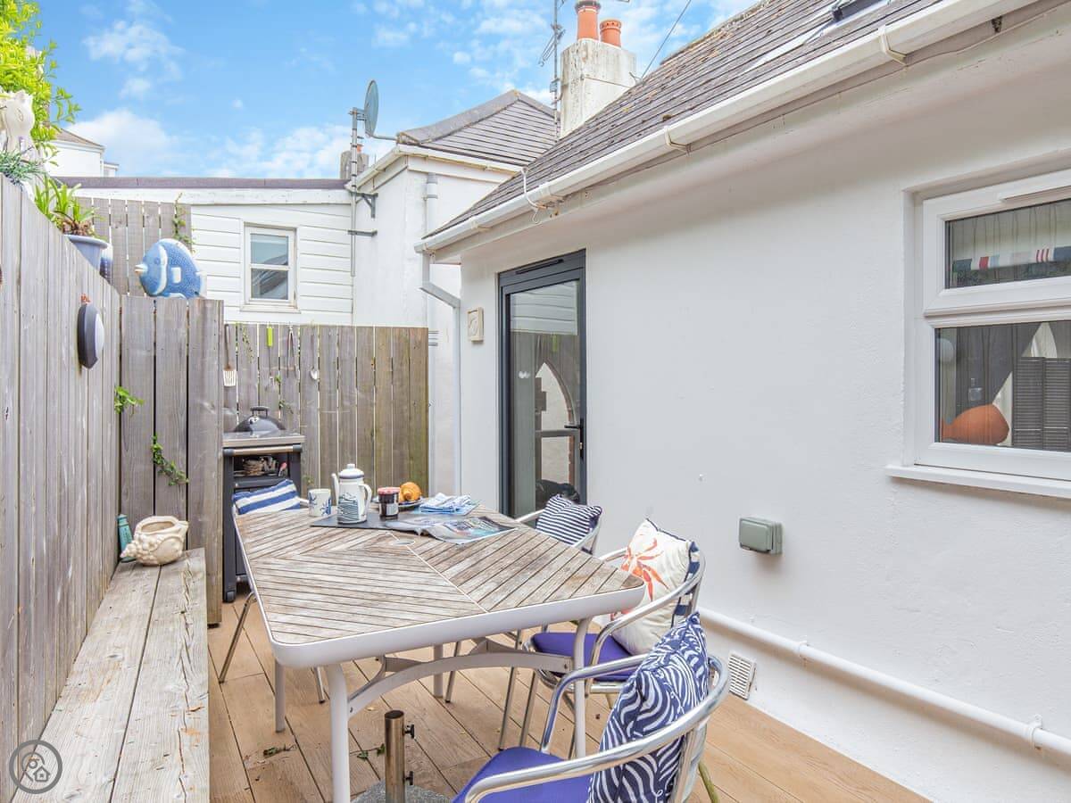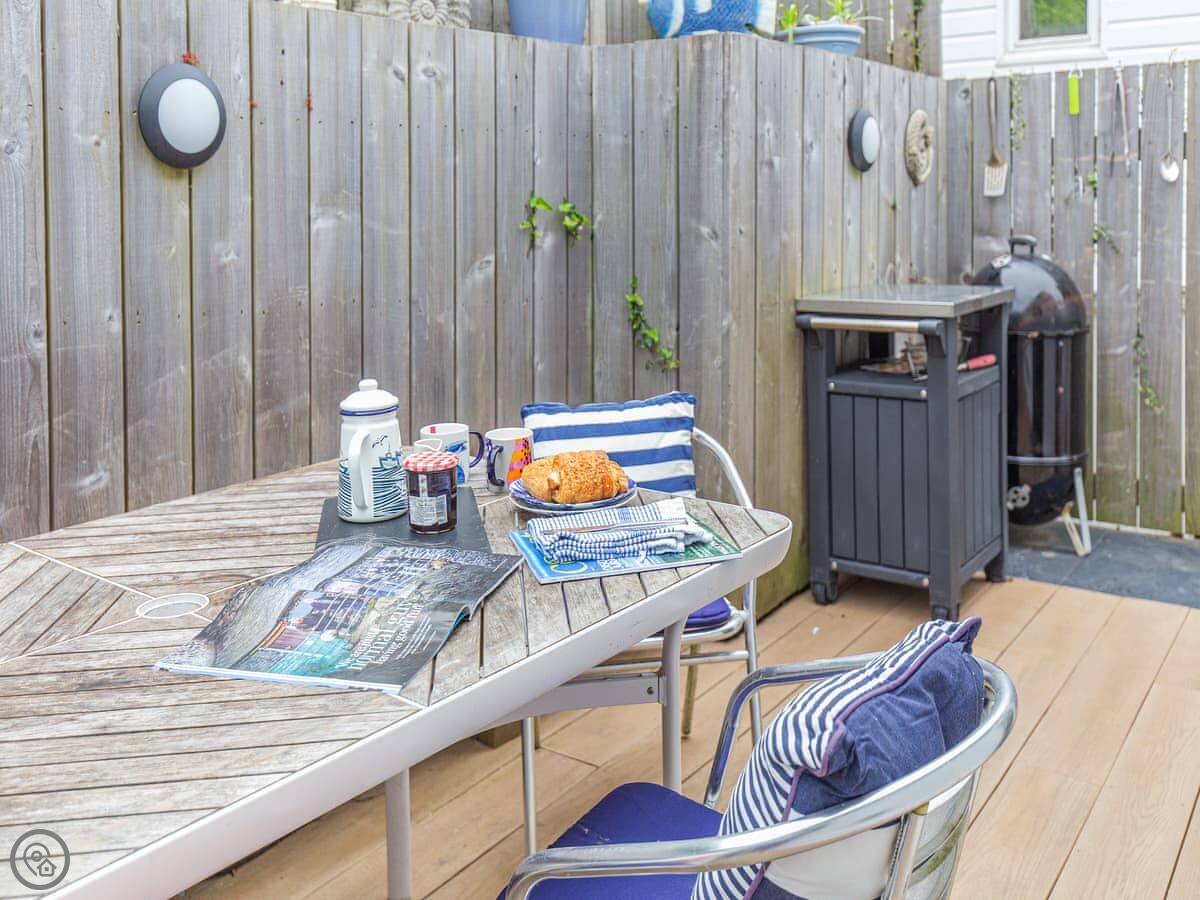 Downstairs, the kitchen door opens onto a small decked terrace. It gets the afternoon sun. There's a table and chairs and a BBQ out there.