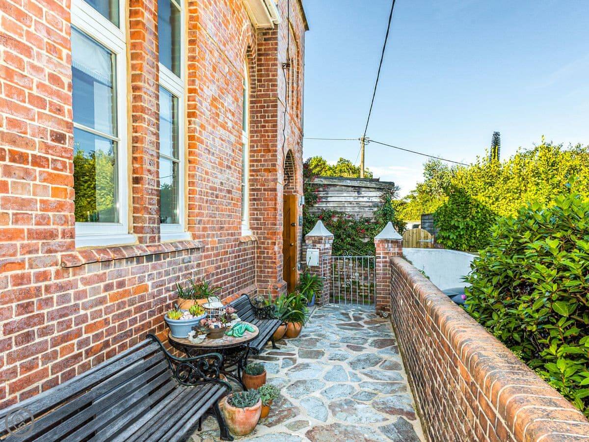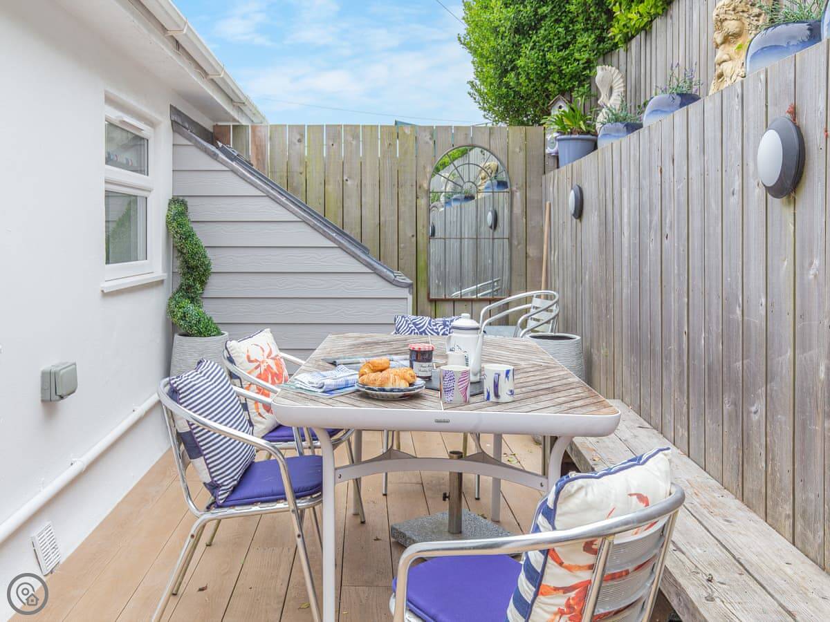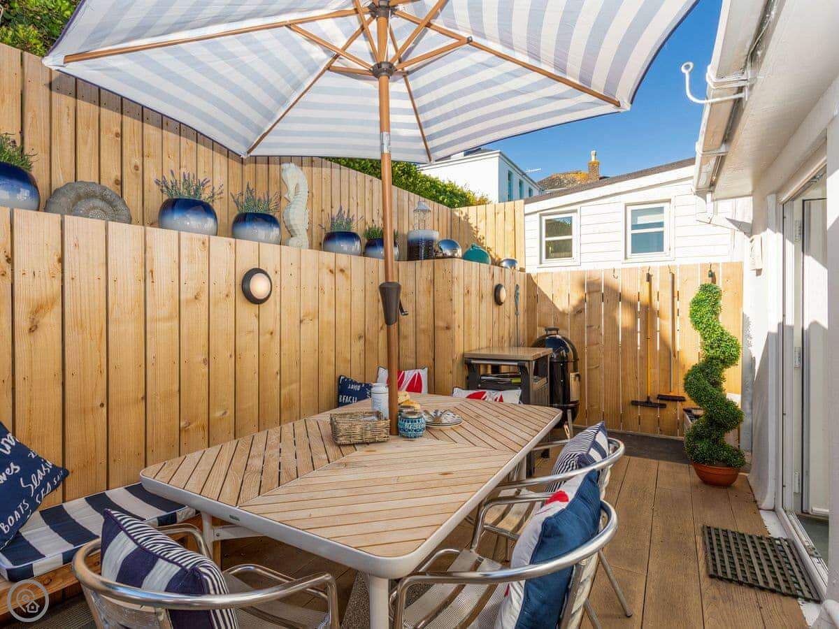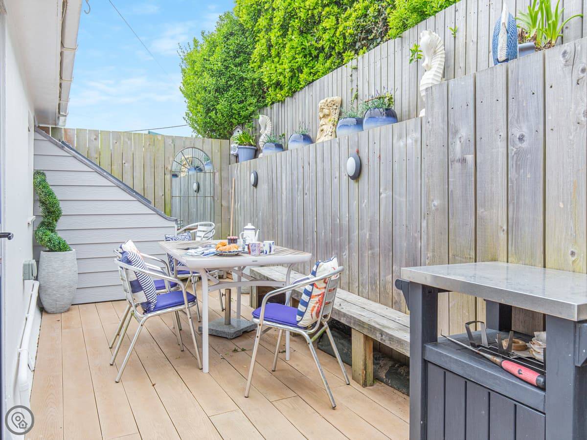 Downstairs, the kitchen door opens onto a small decked terrace. It gets the afternoon sun. There's a table and chairs and a BBQ out there.