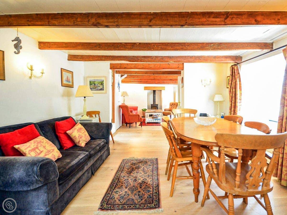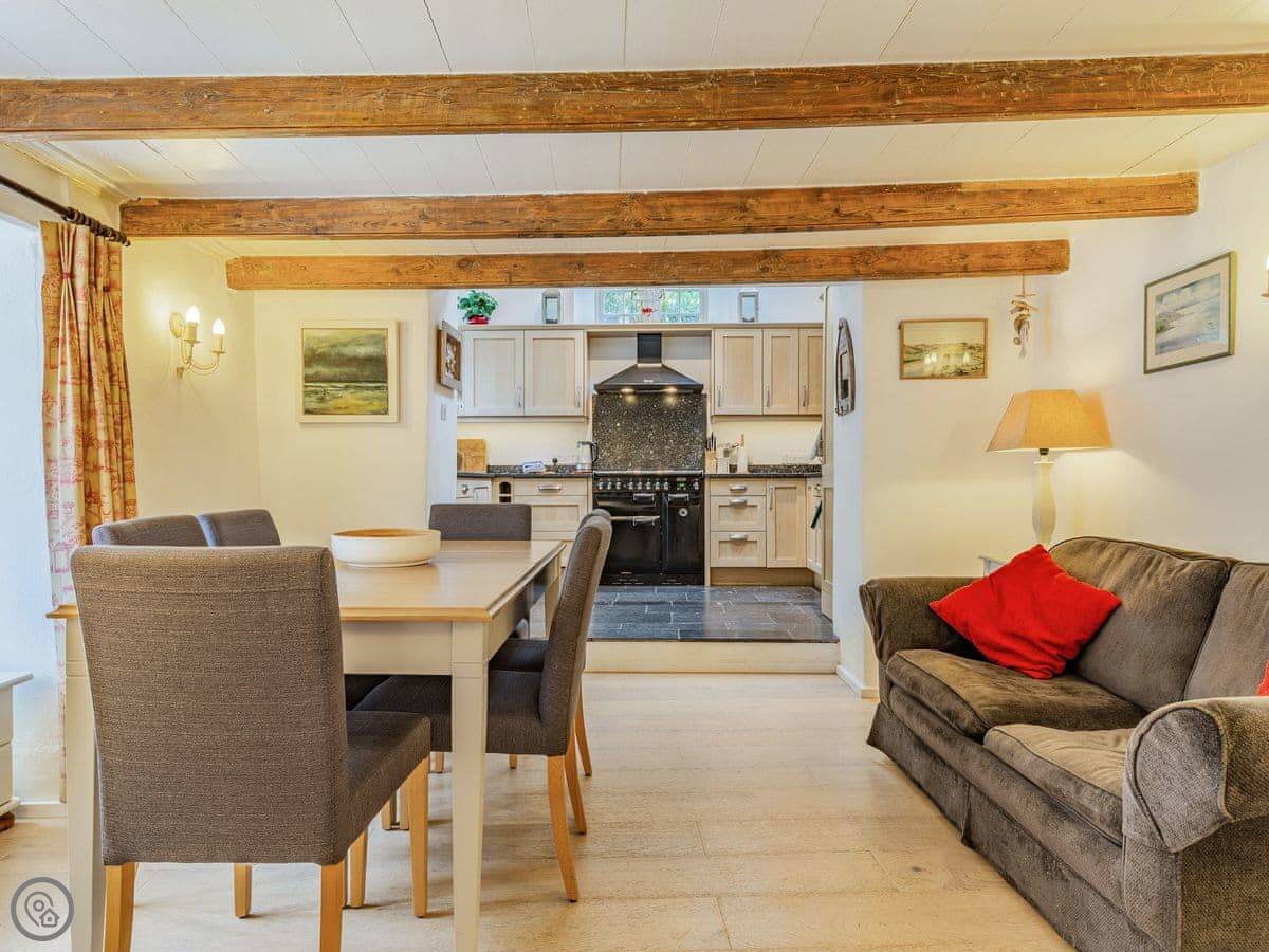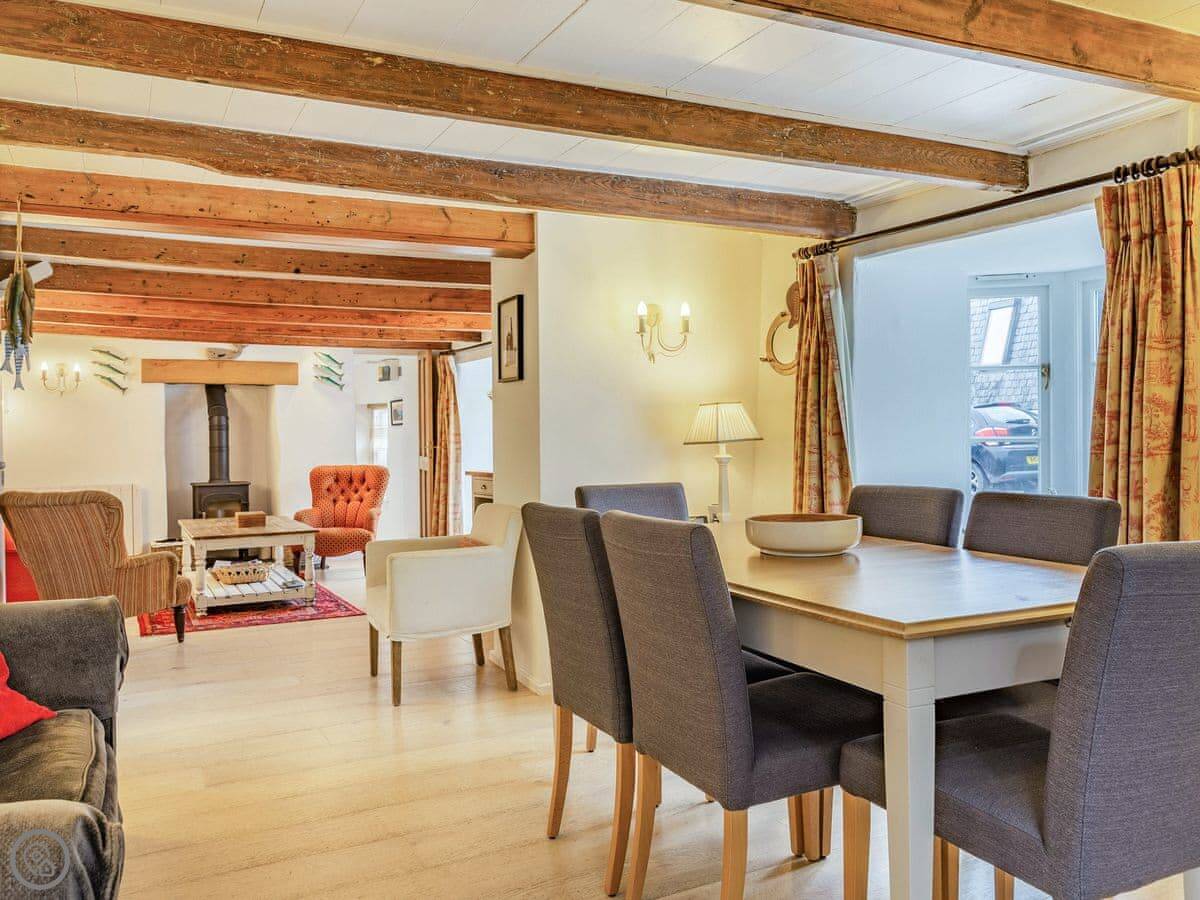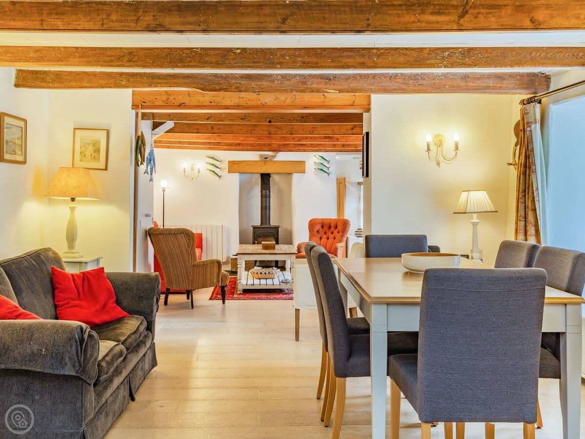 It sleeps six. Three bedrooms, two bathrooms. It's got a 4 Star rating, so it's comfortable and well-equipped. The space is mostly open plan downstairs. There's a range cooker, a wood burner for chilly evenings, and a proper table to eat at.