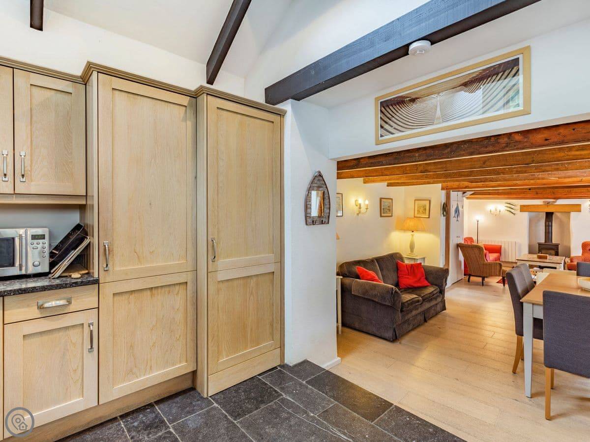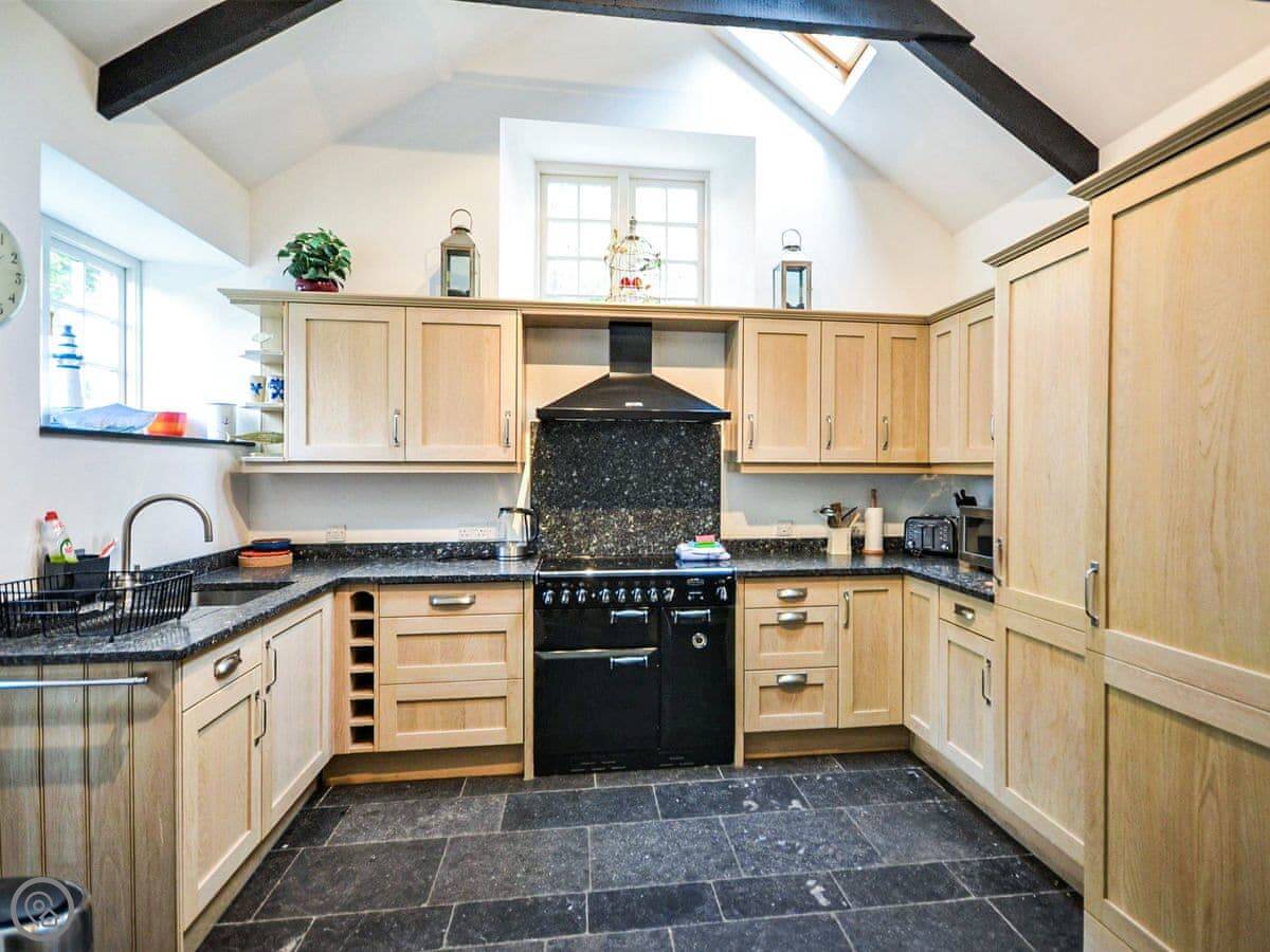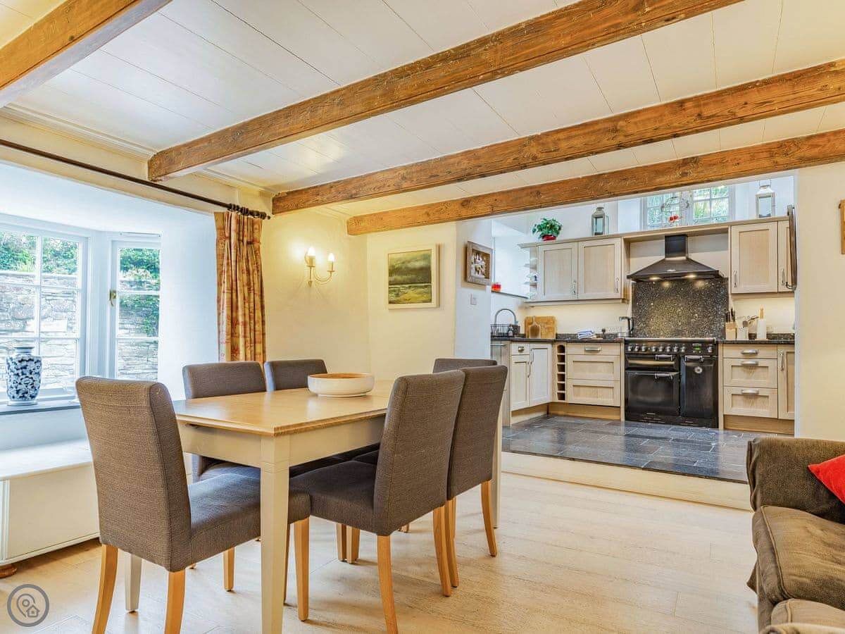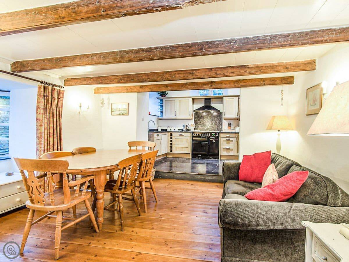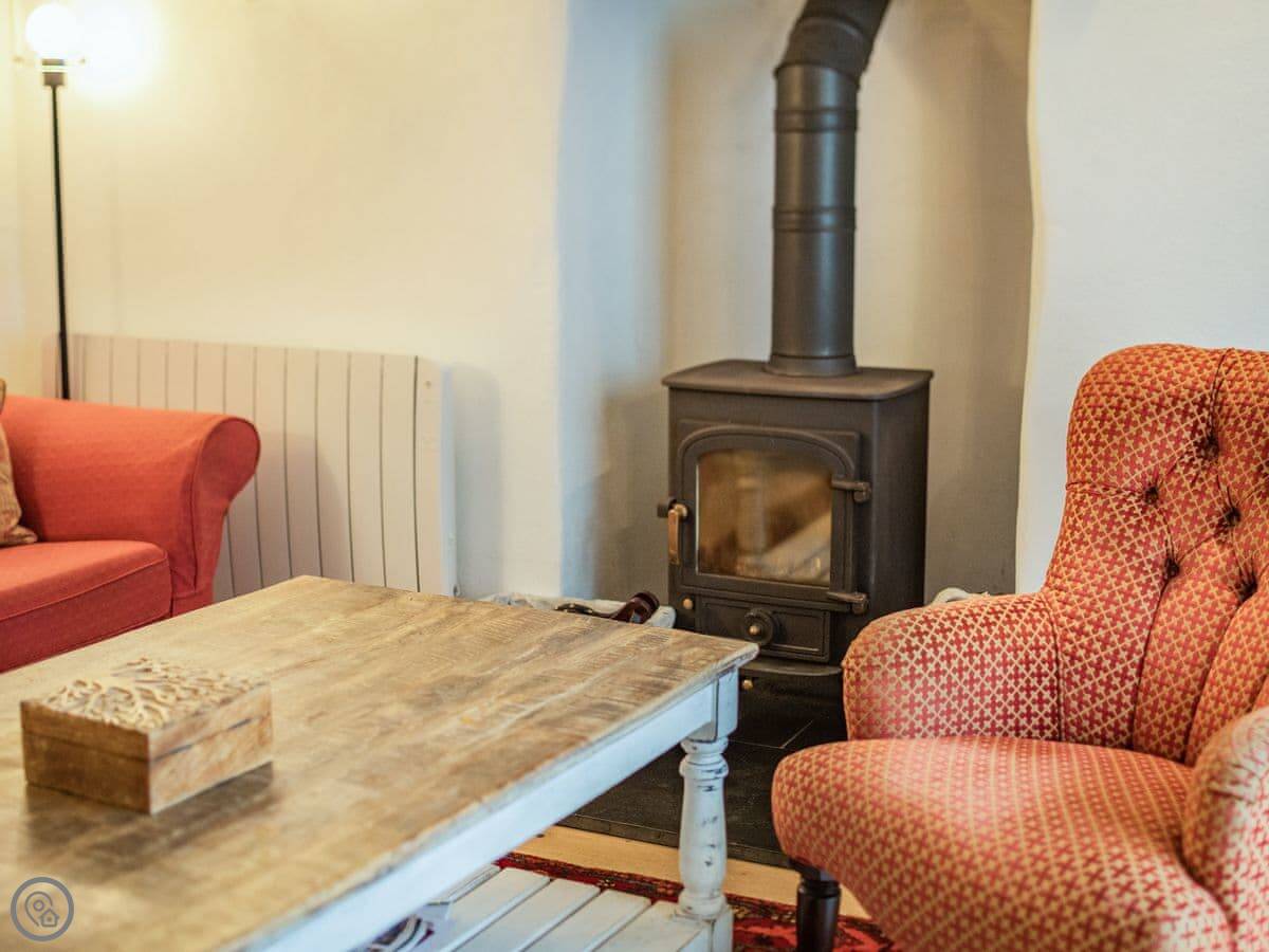 It sleeps six. Three bedrooms, two bathrooms. It's got a 4 Star rating, so it's comfortable and well-equipped. The space is mostly open plan downstairs. There's a range cooker, a wood burner for chilly evenings, and a proper table to eat at.