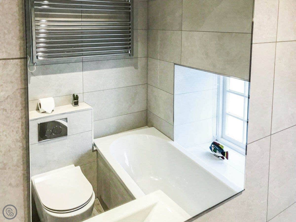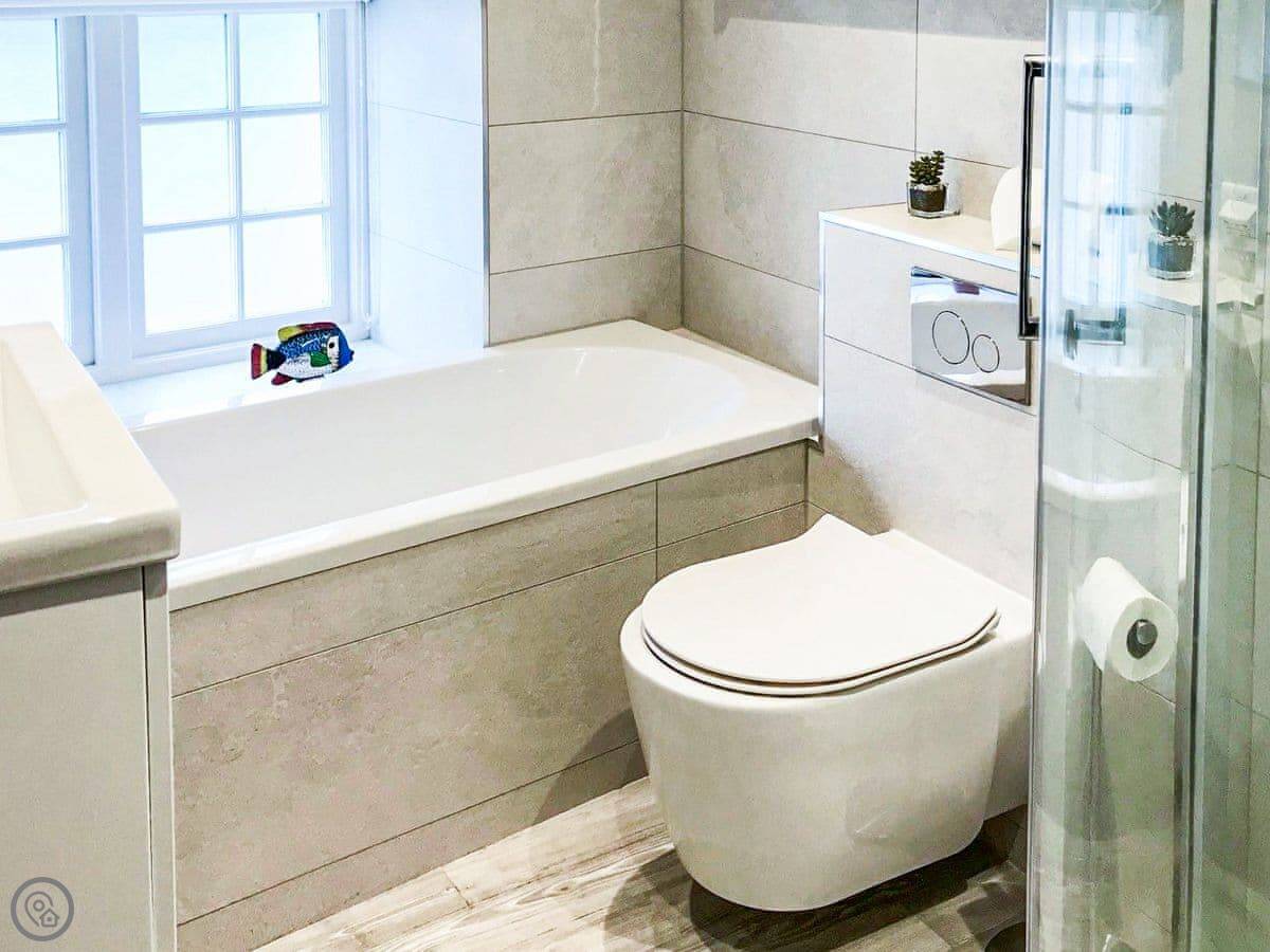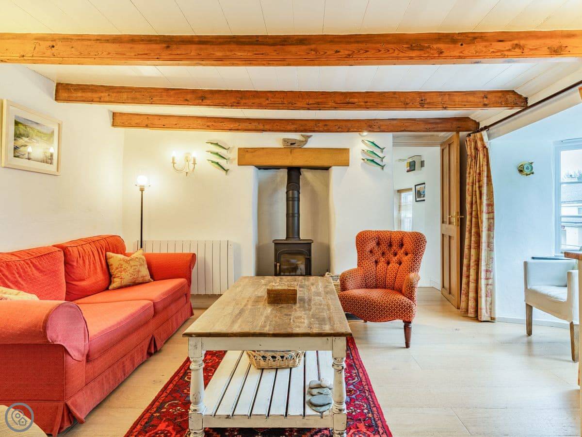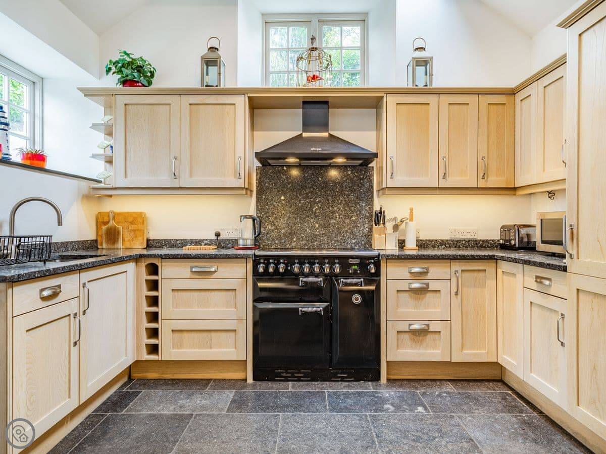 It sleeps six. Three bedrooms, two bathrooms. It's got a 4 Star rating, so it's comfortable and well-equipped. The space is mostly open plan downstairs. There's a range cooker, a wood burner for chilly evenings, and a proper table to eat at.