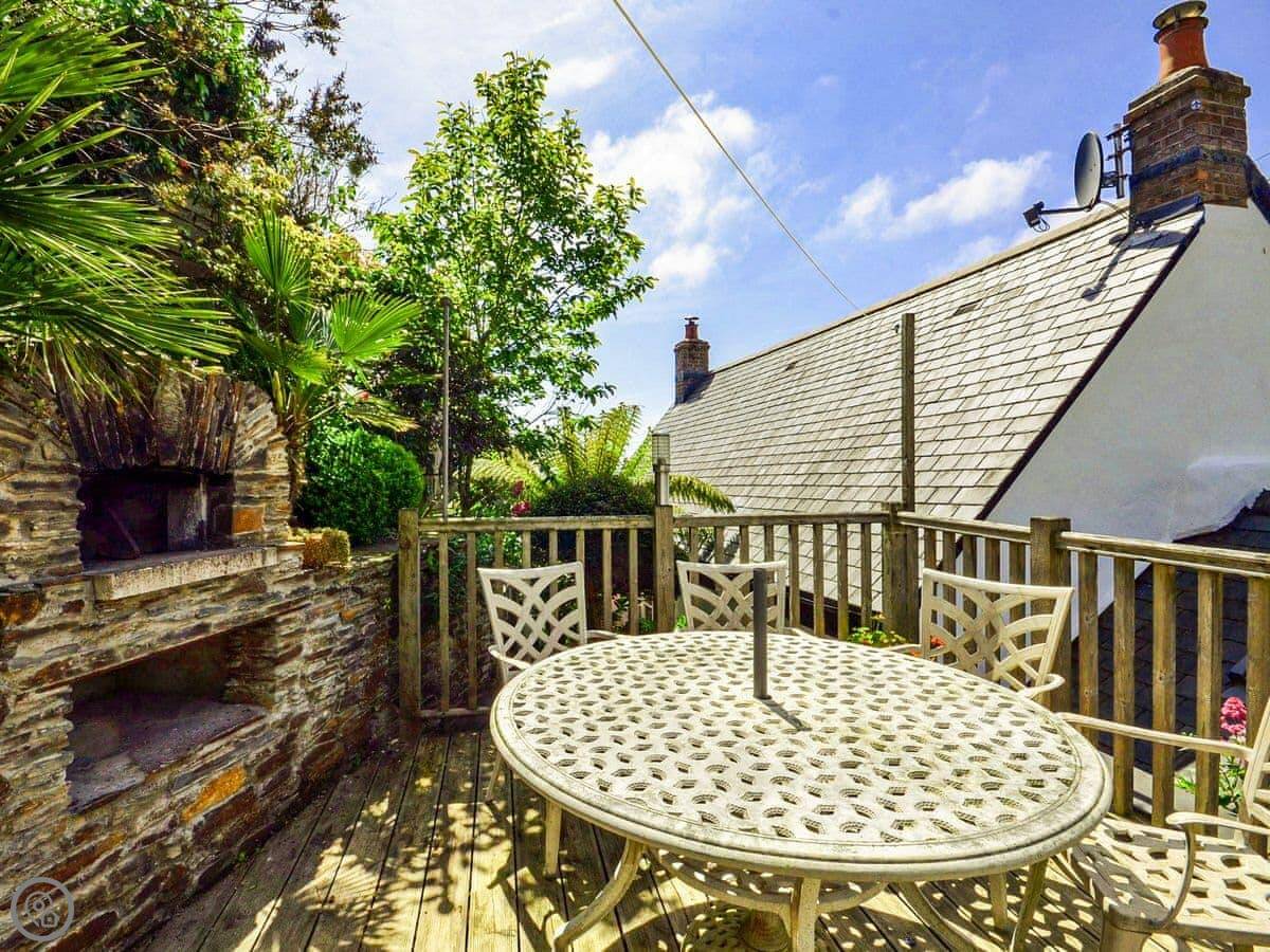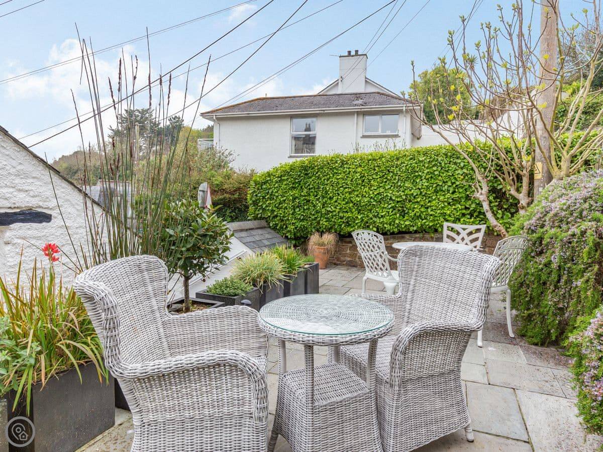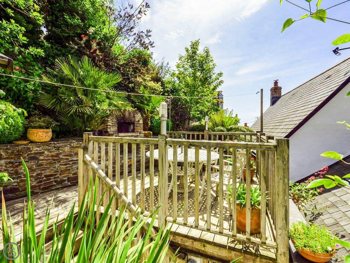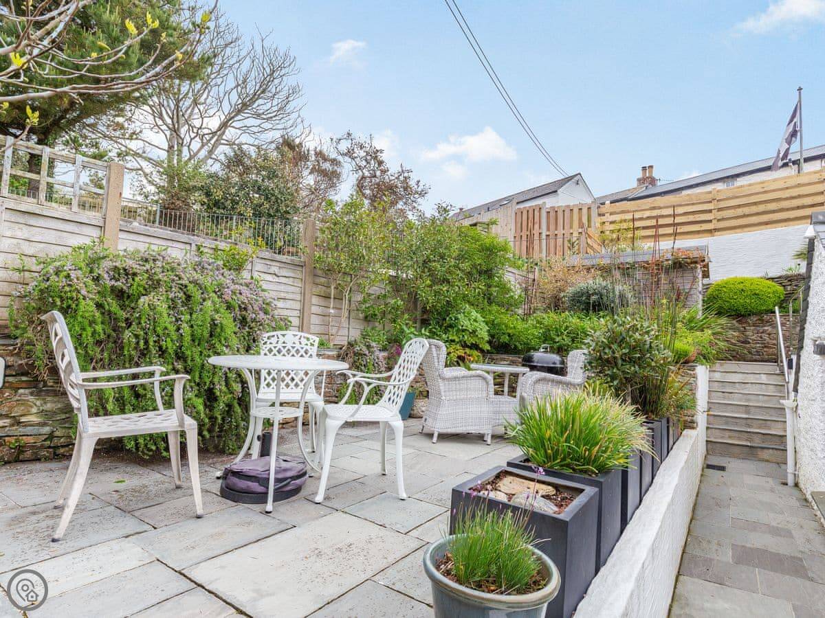 Outside, there's a patio area up some steps from the front door. It gets the sun and you can see the sea from it. There's garden furniture, a BBQ, and a pizza oven out there.