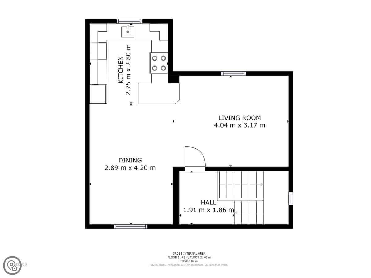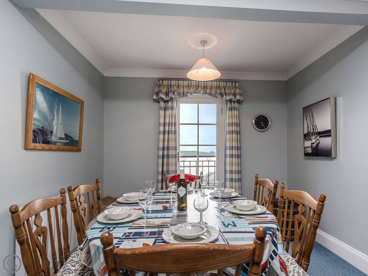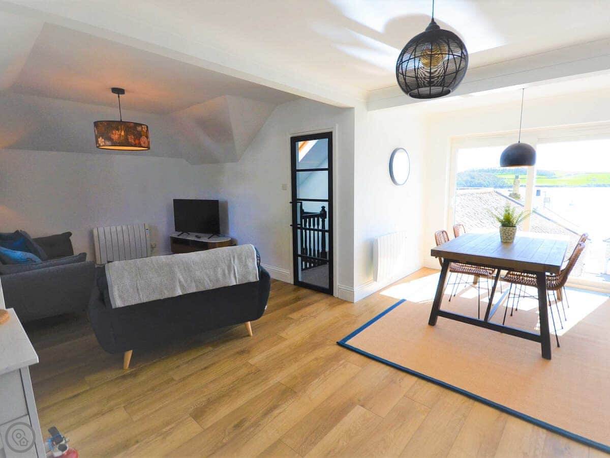 Upstairs is all one open plan room. Kitchen, dining area, and sitting area together. The main thing is the view out over the water. There's a patio door that opens onto a small balcony with a table and chairs. It gets the evening sun.