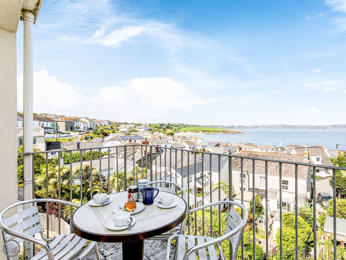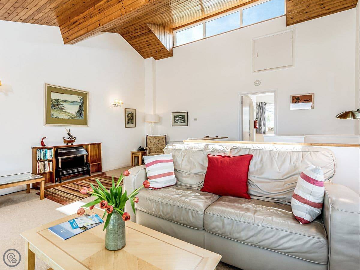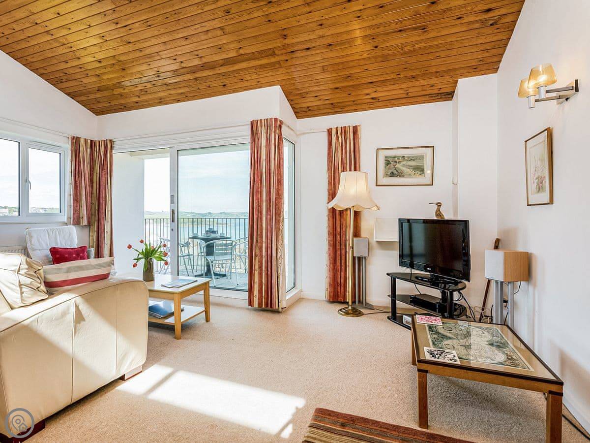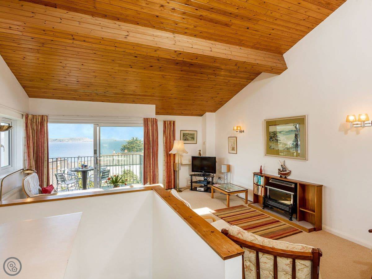 The living room is right at the top. It's light and has big patio doors that open onto a small balcony. You get a good view over the village and Gerrans Bay from up there. It's where you'll probably spend most of your time.